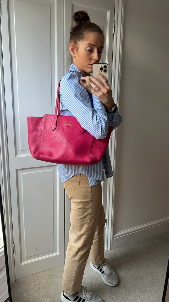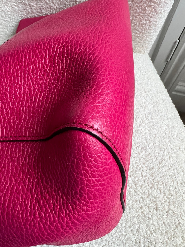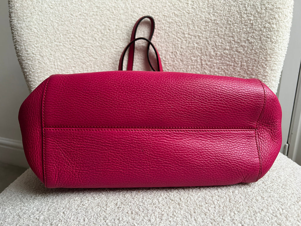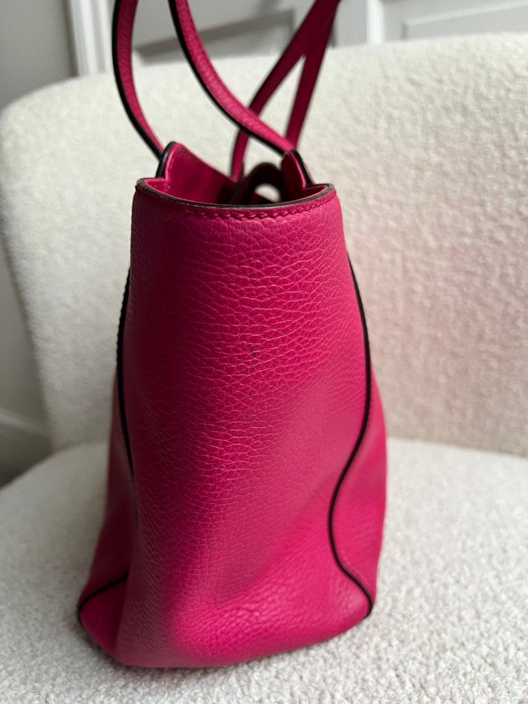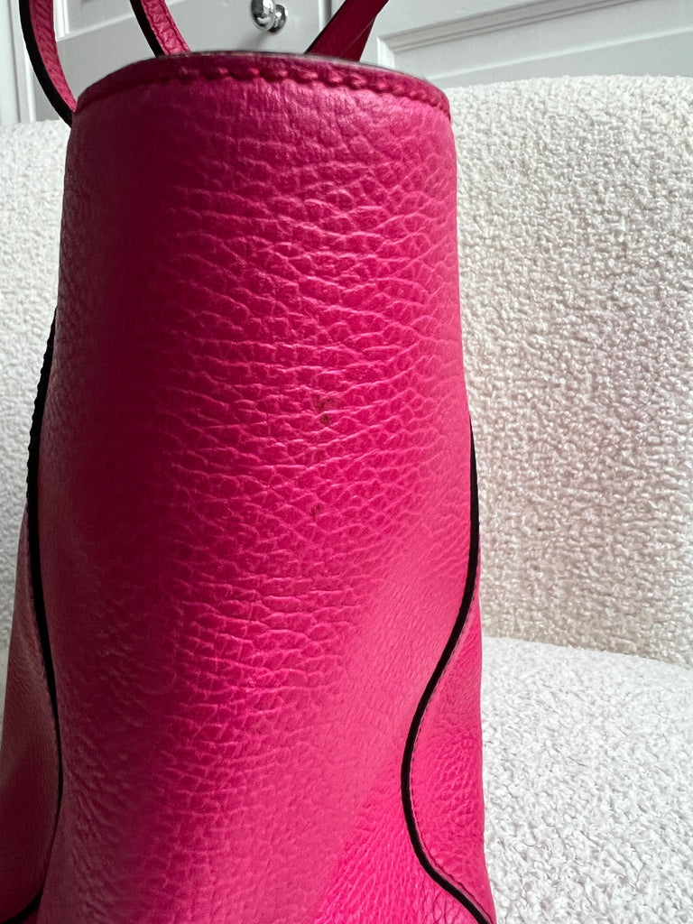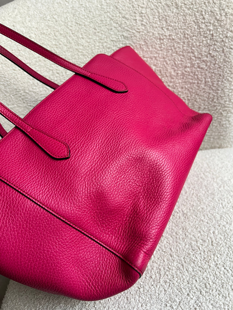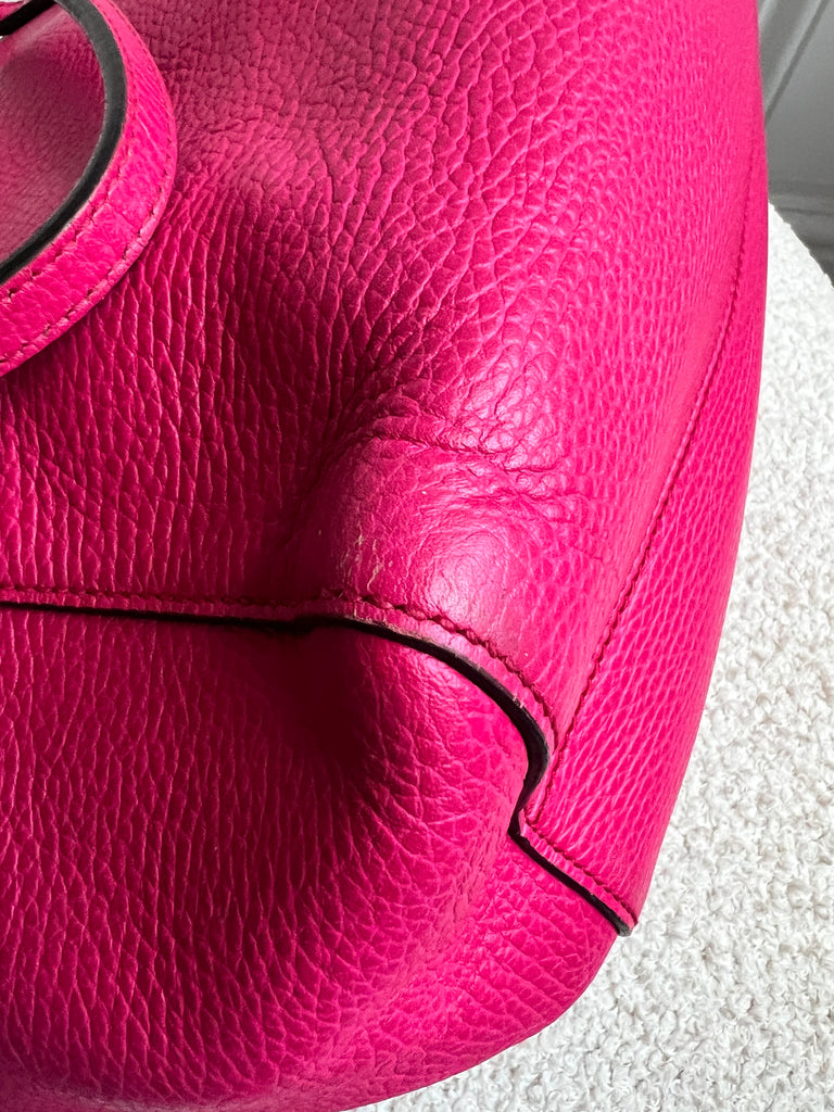 Gucci Swing Tote in pink grained calfskin with pale gold hardware. Medium and reasonably roomy in size. Ideal day to day or work bag. Can be carried in the crook of the arm or over shoulder.