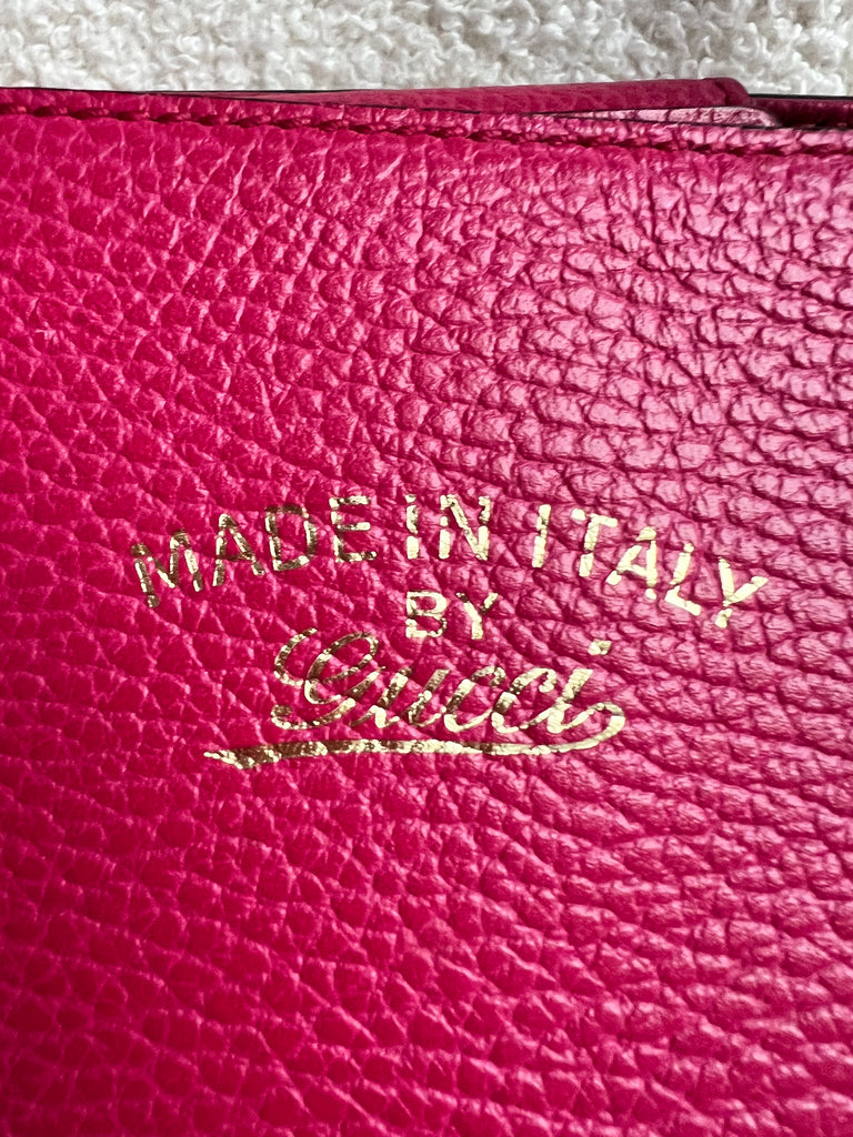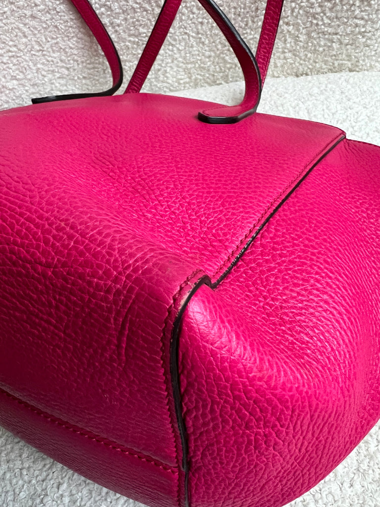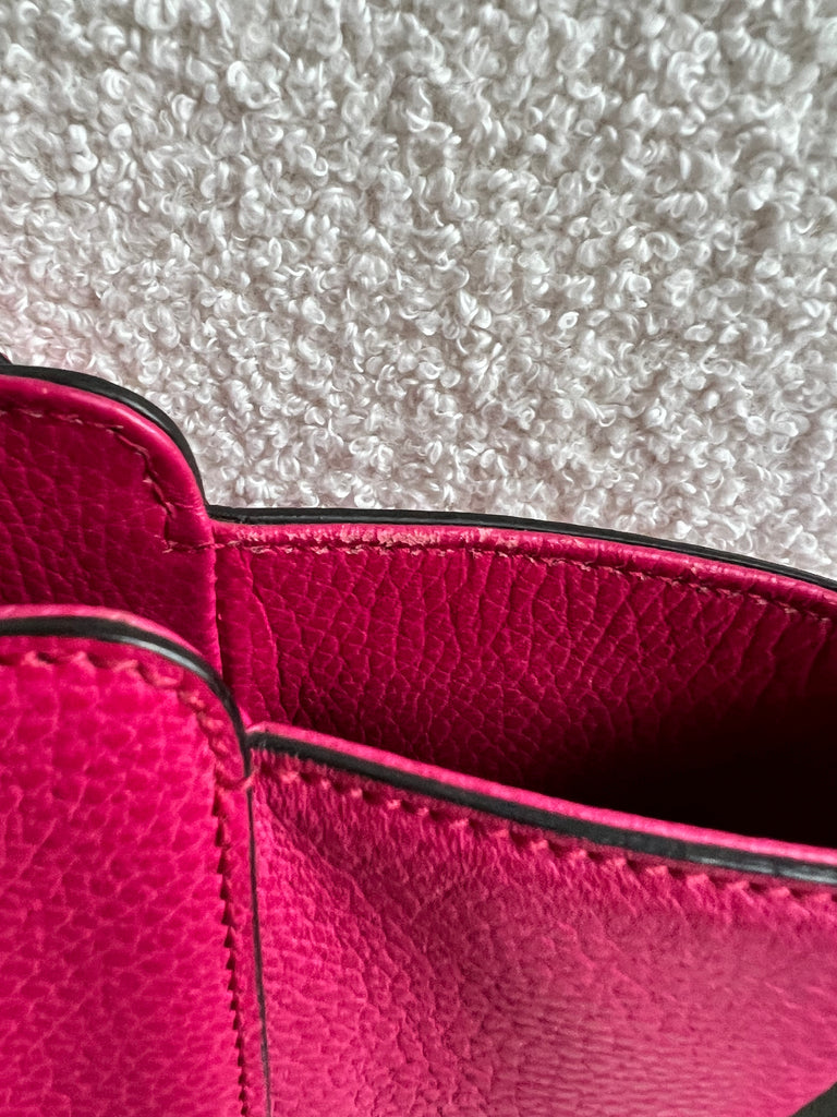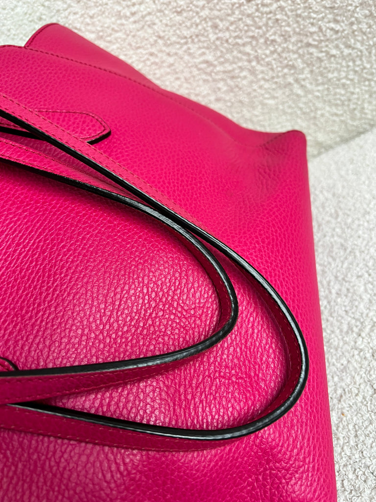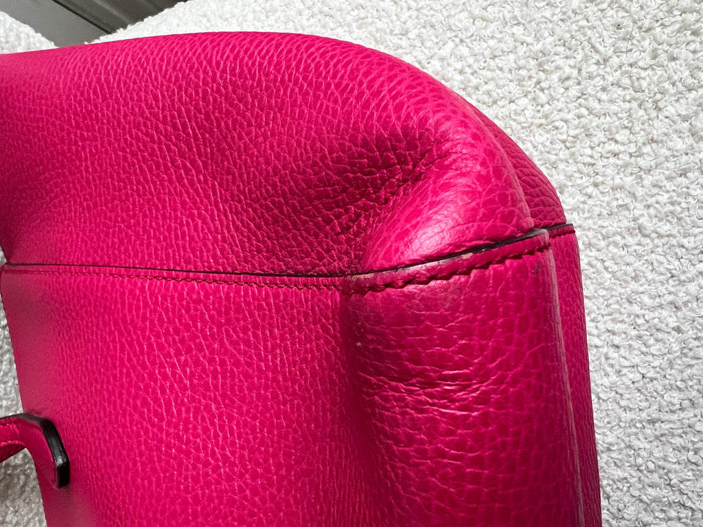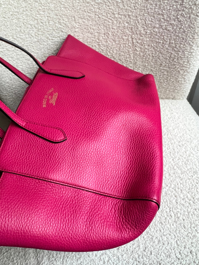 Gucci Swing Tote in pink grained calfskin with pale gold hardware. Medium and reasonably roomy in size. Ideal day to day or work bag. Can be carried in the crook of the arm or over shoulder.