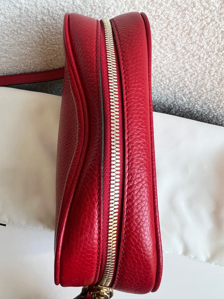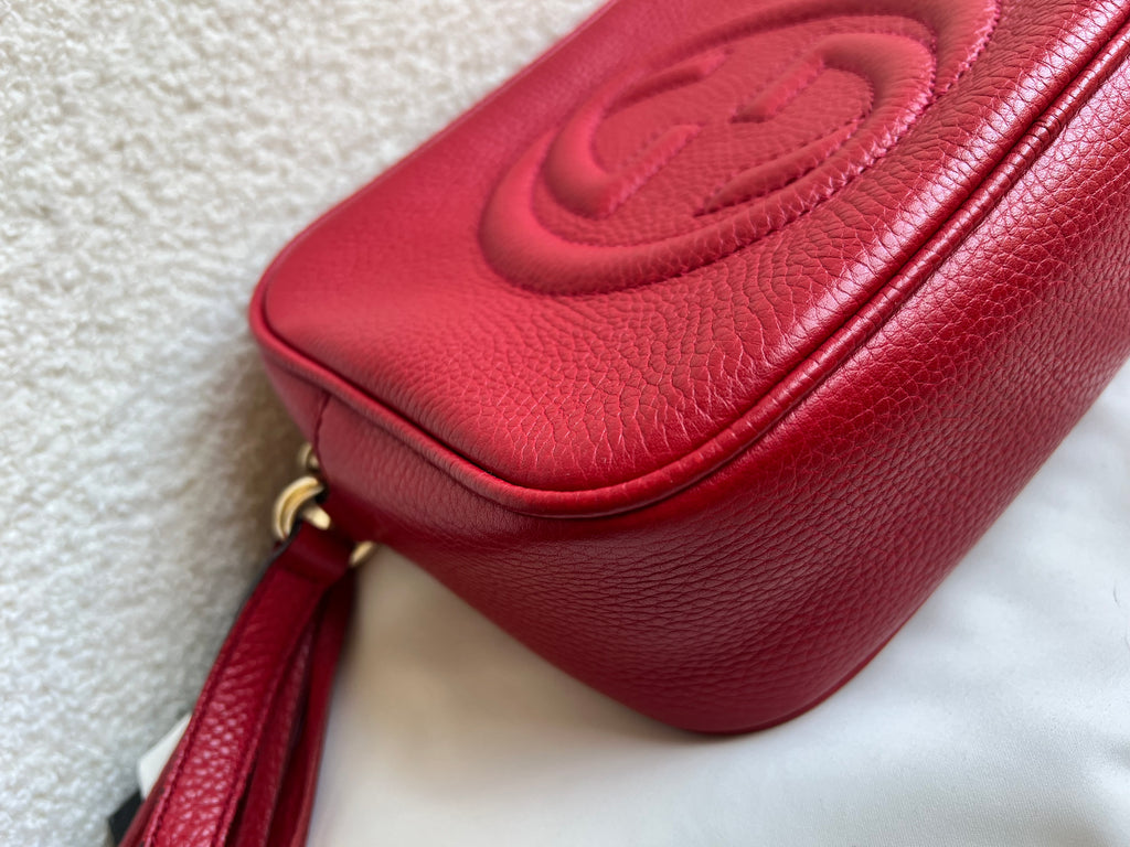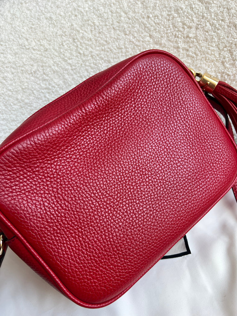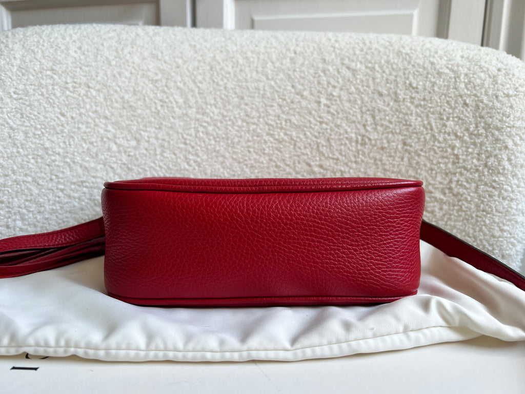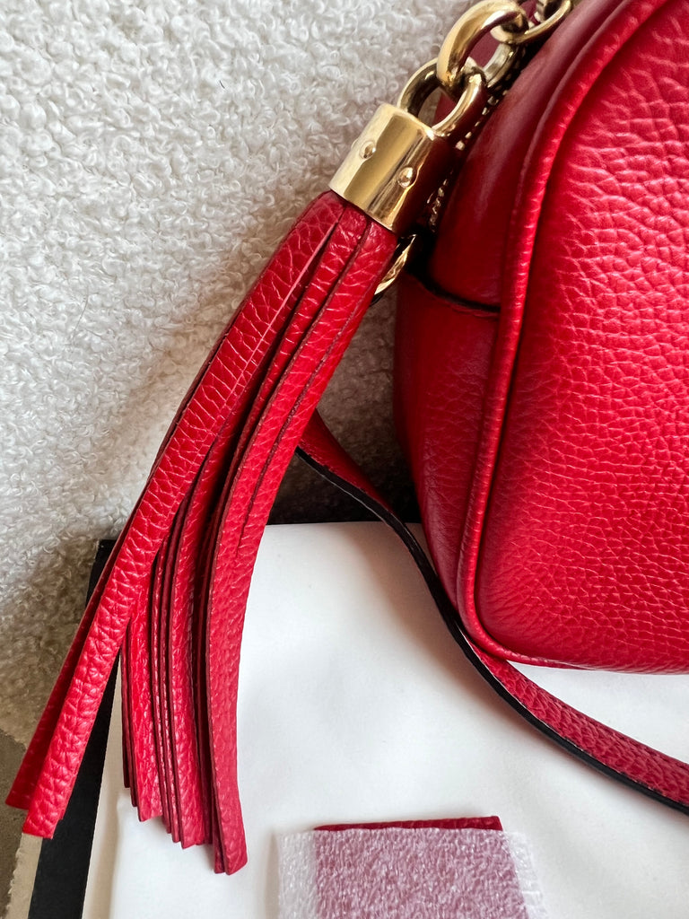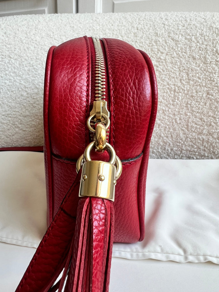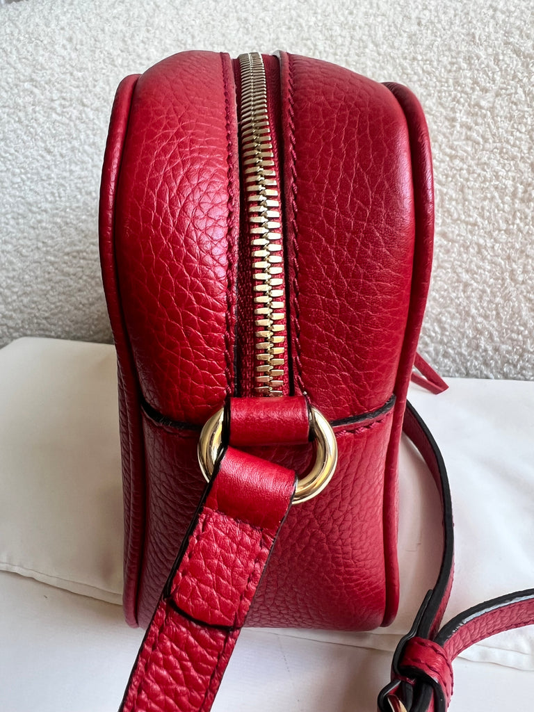 Gucci Soho Disco in Red Leather with pale gold hardware. This practical, cross body, camera style bag is compact in size but still fits a reasonable amount. Can be worn over shoulder or cross body. Gucci's most popular style and goes with any outfit, dressed up or down.