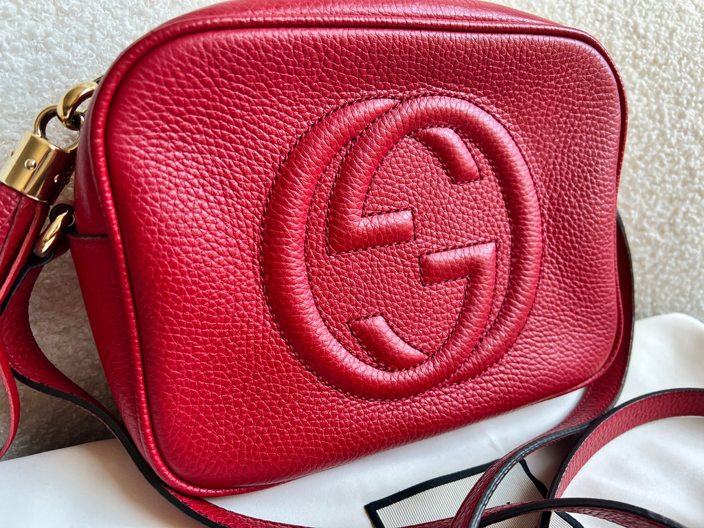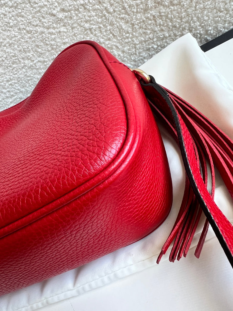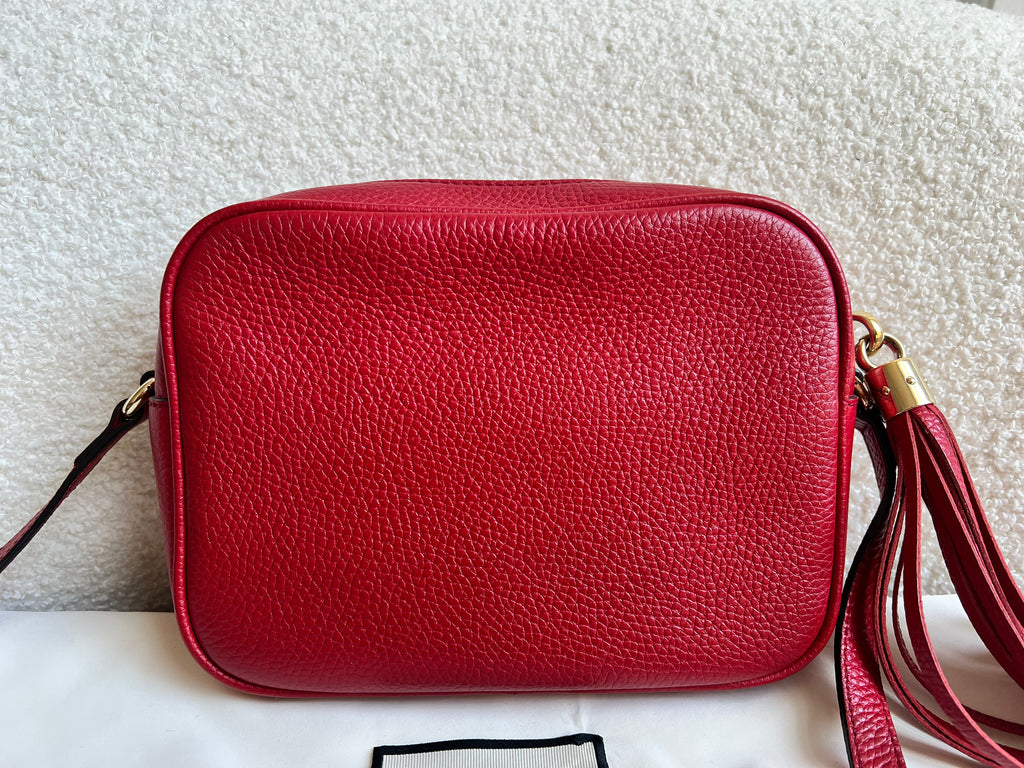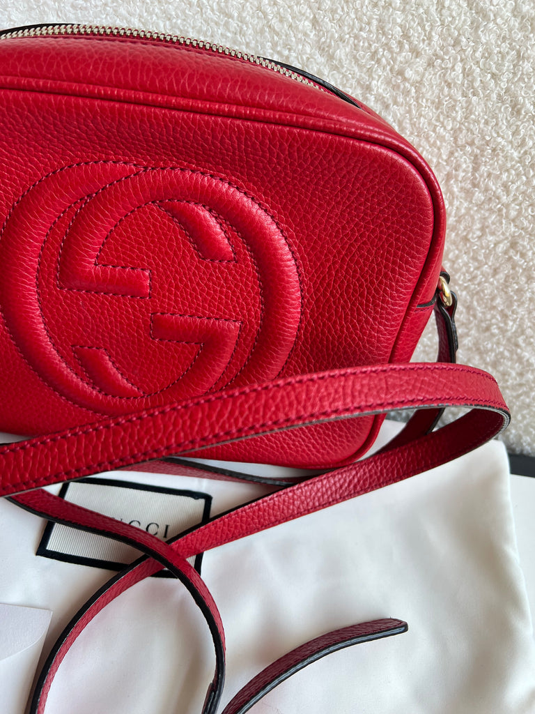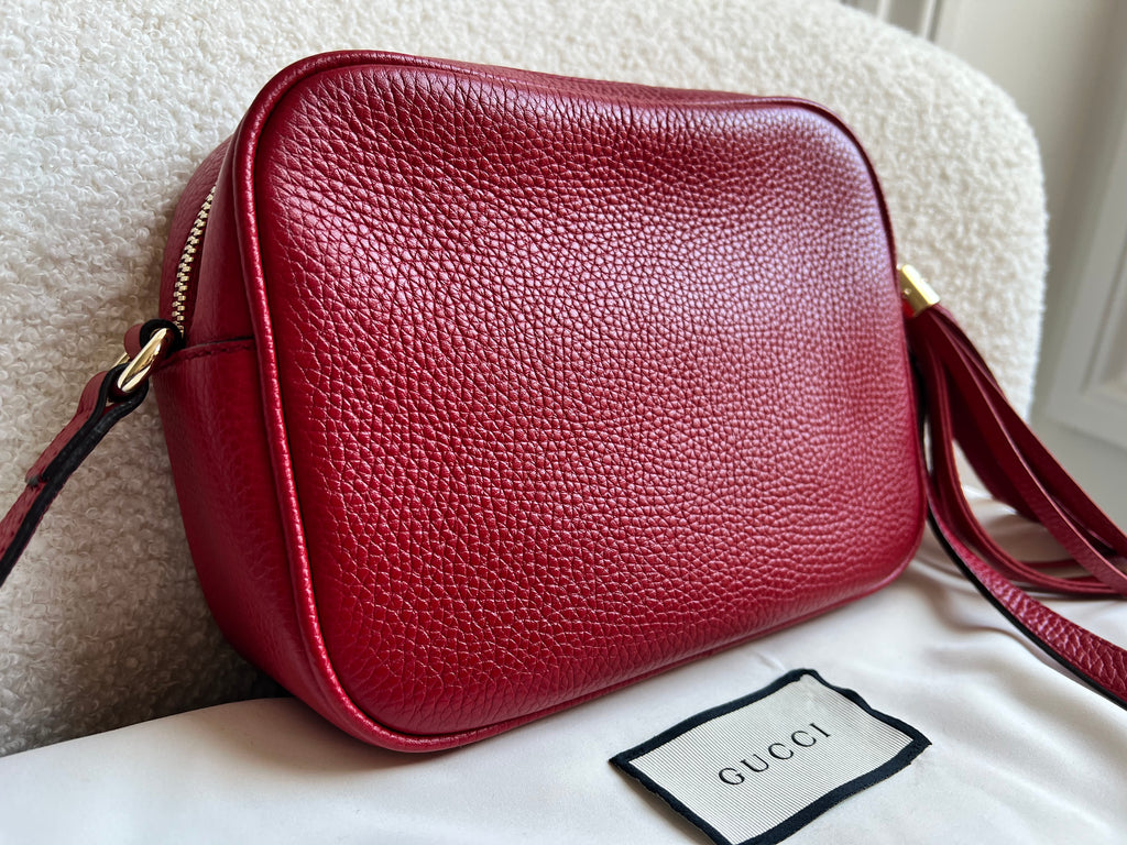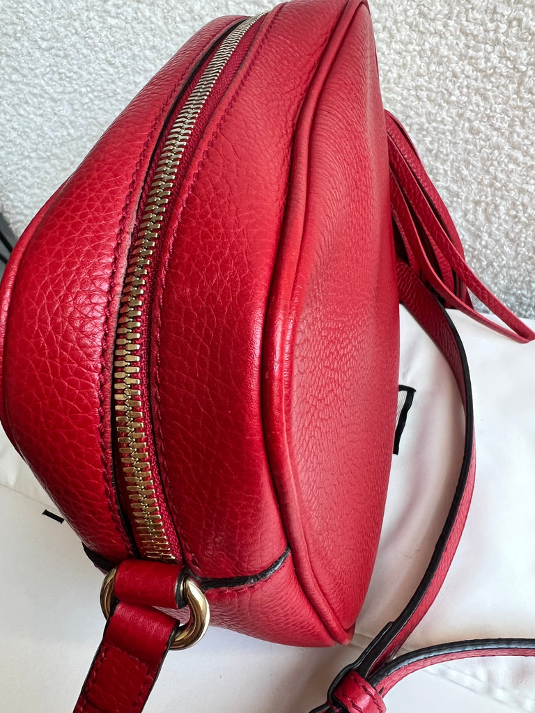 Gucci Soho Disco in Red Leather with pale gold hardware. This practical, cross body, camera style bag is compact in size but still fits a reasonable amount. Can be worn over shoulder or cross body. Gucci's most popular style and goes with any outfit, dressed up or down.