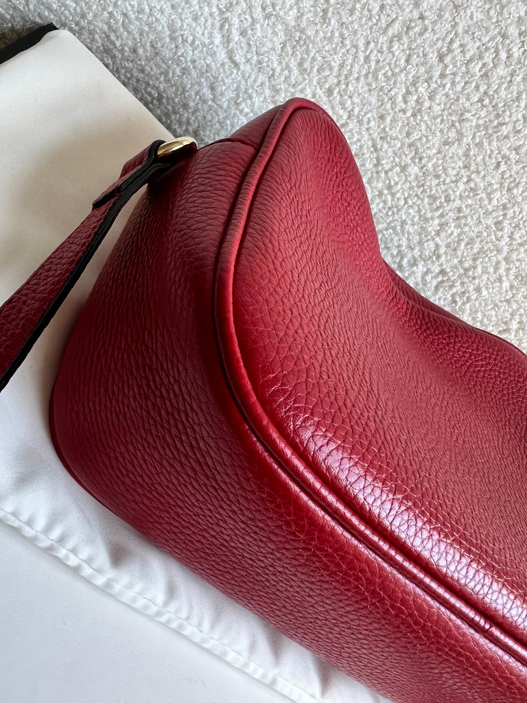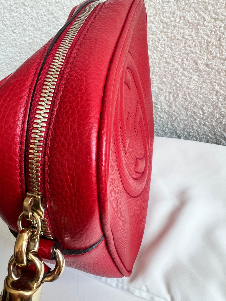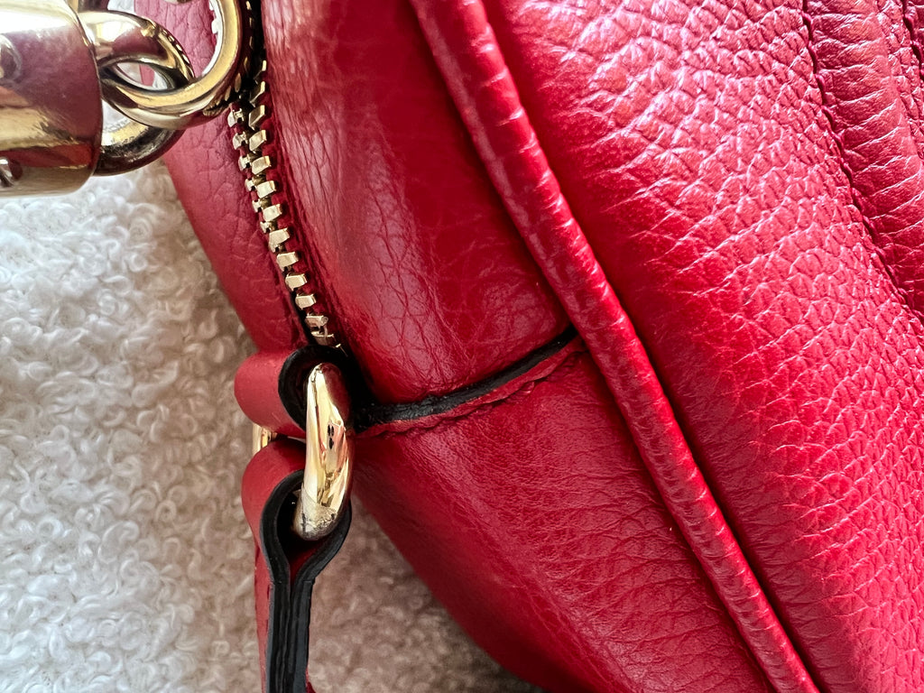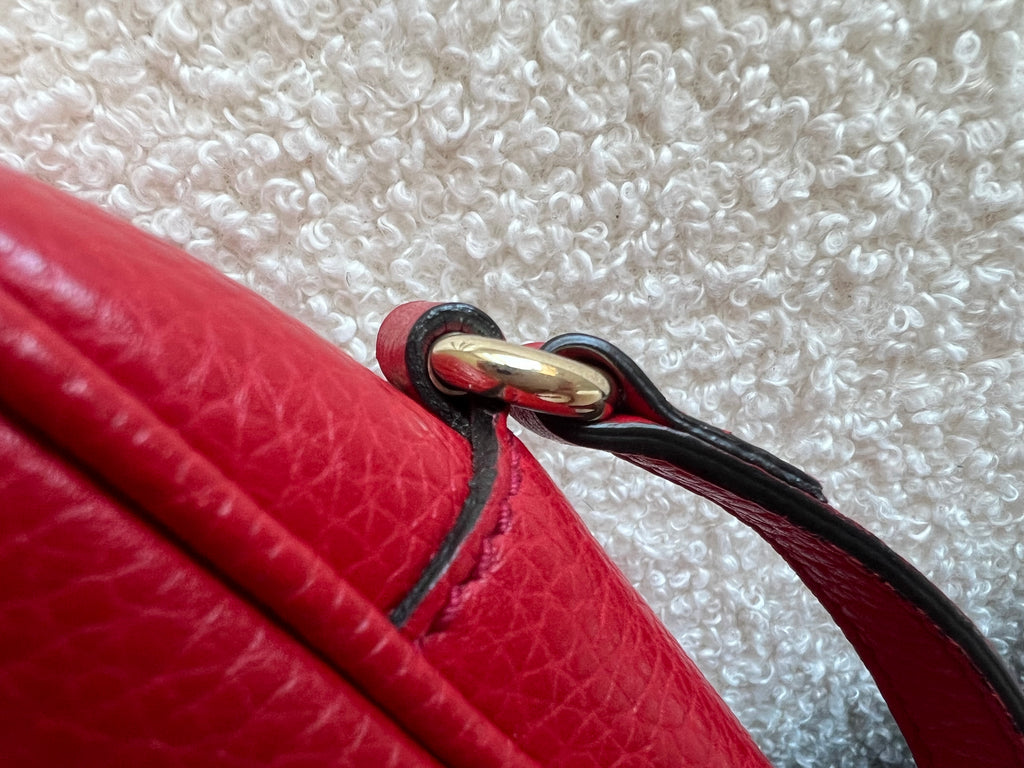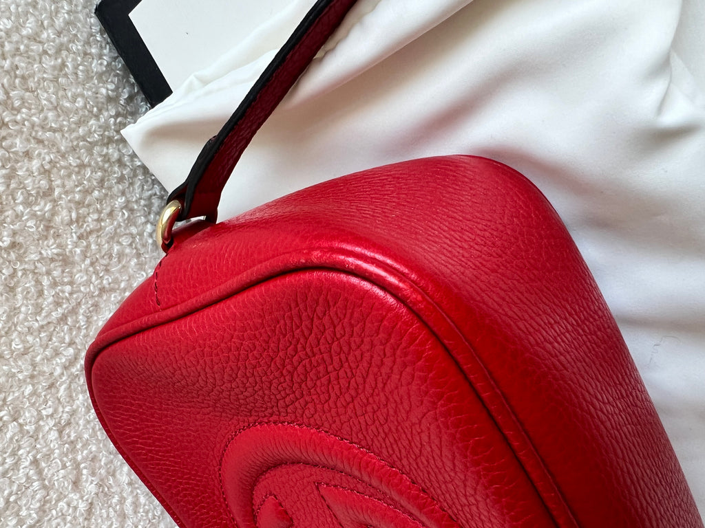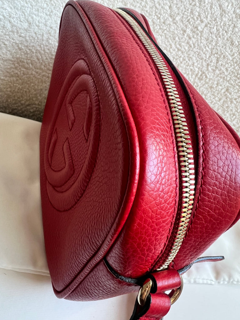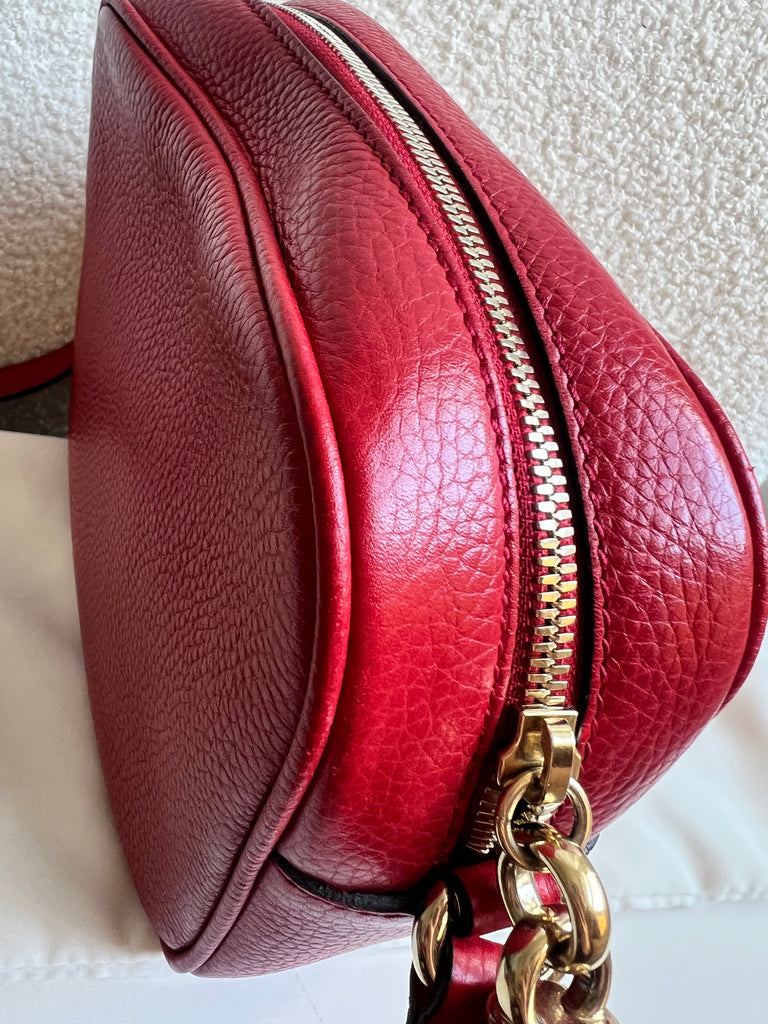 Gucci Soho Disco in Red Leather with pale gold hardware. This practical, cross body, camera style bag is compact in size but still fits a reasonable amount. Can be worn over shoulder or cross body. Gucci's most popular style and goes with any outfit, dressed up or down.