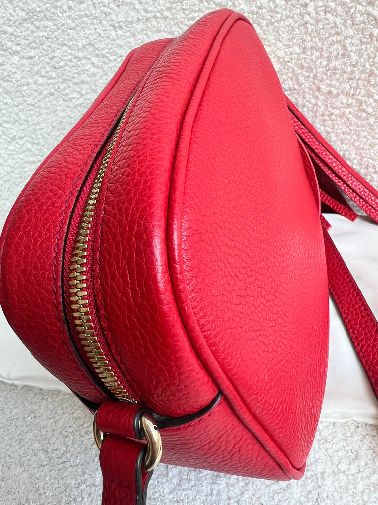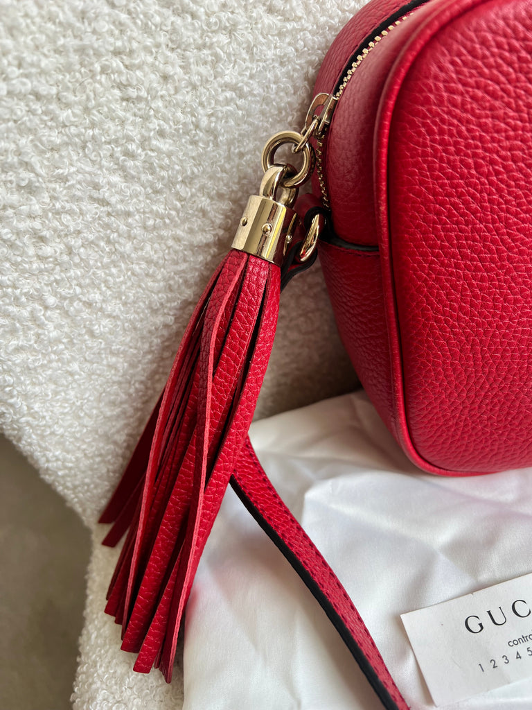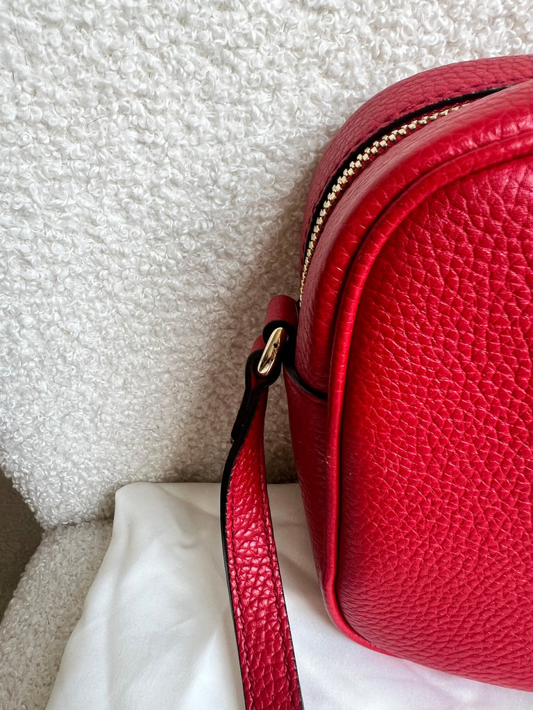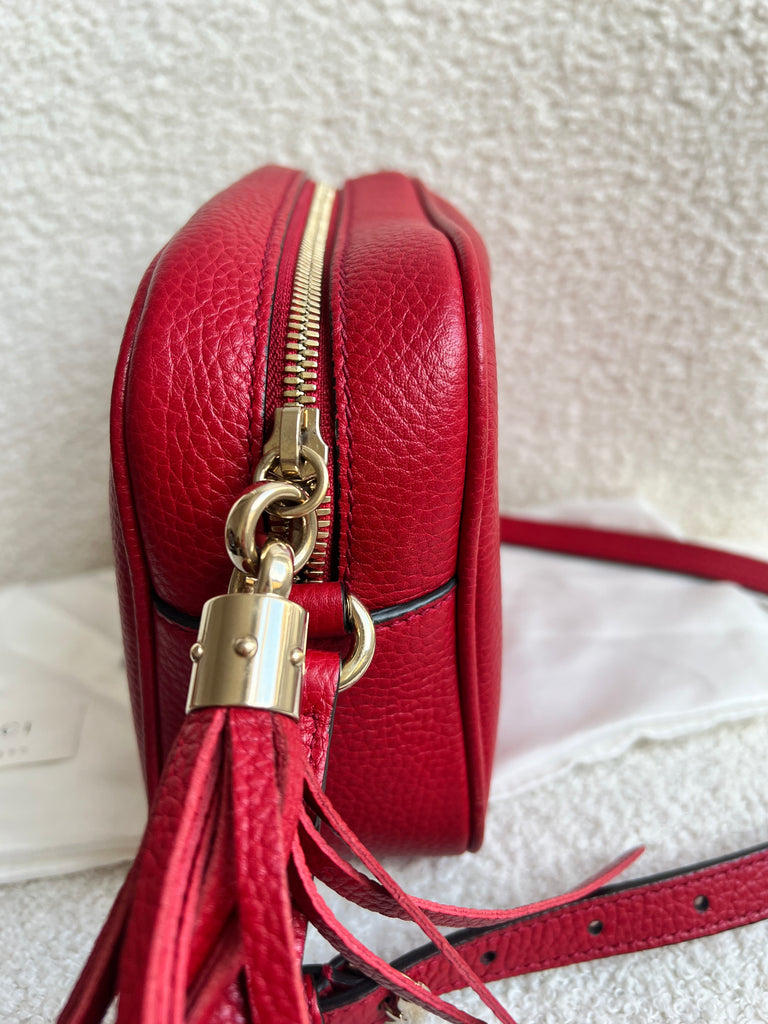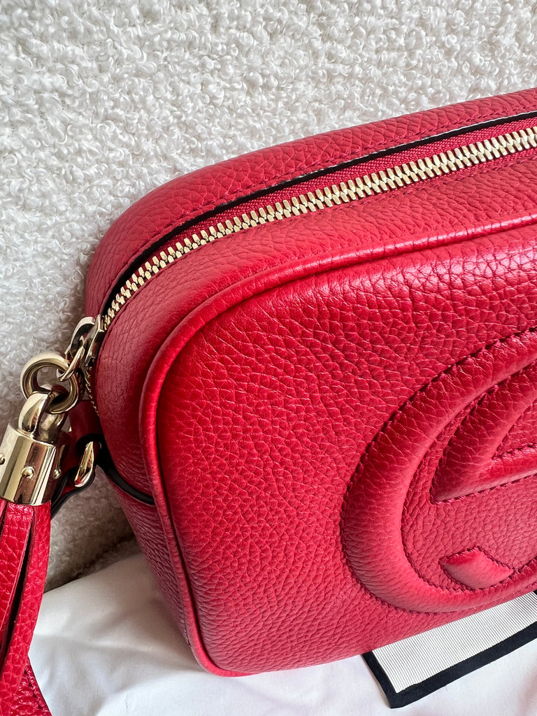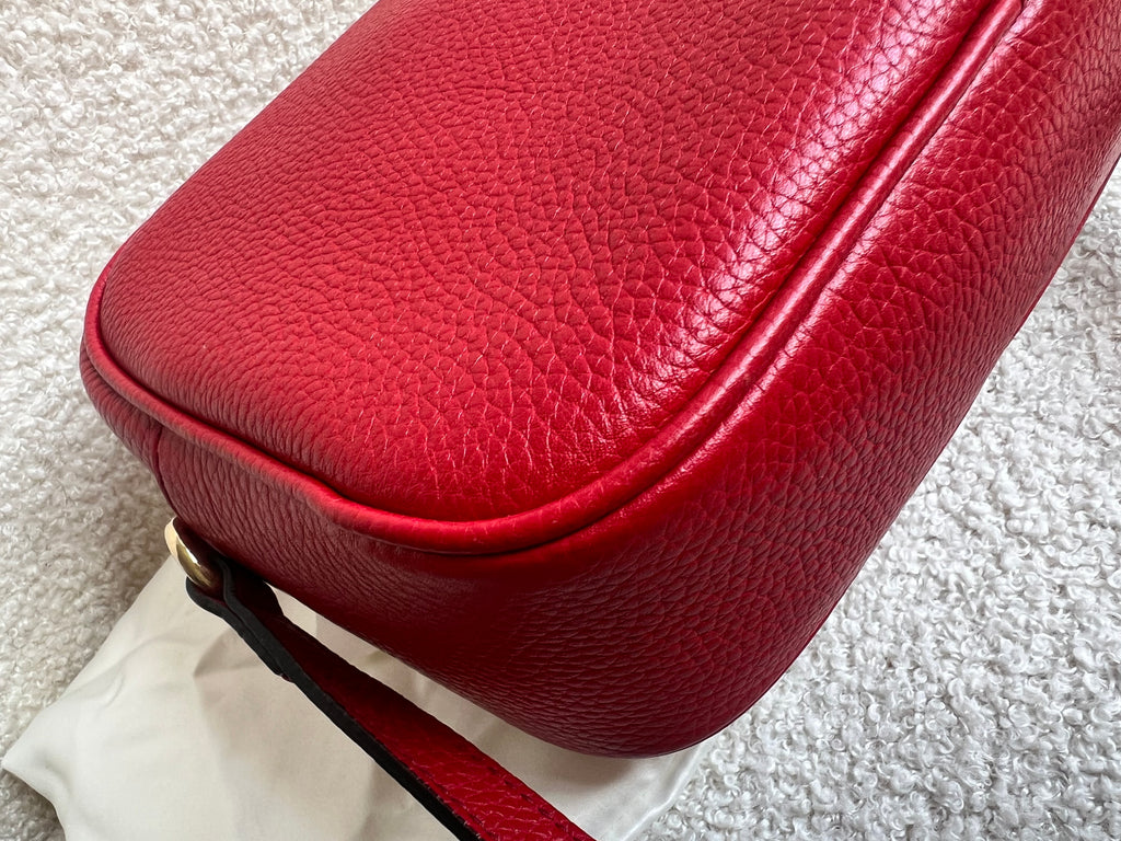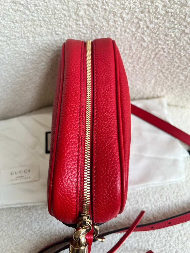 Gucci Soho Disco in Red Leather with pale gold hardware. This practical, cross body, camera style bag is compact in size but still fits a reasonable amount. Can be worn over shoulder or cross body. Gucci's most popular style and goes with any outfit, dressed up or down.