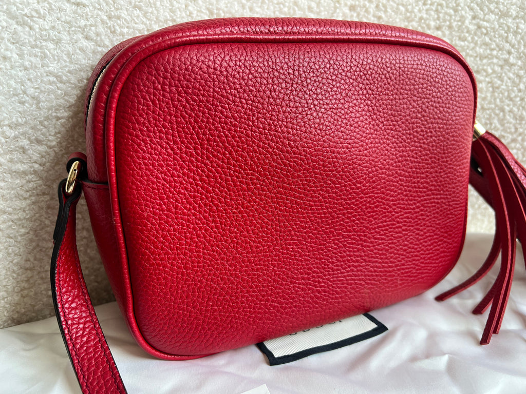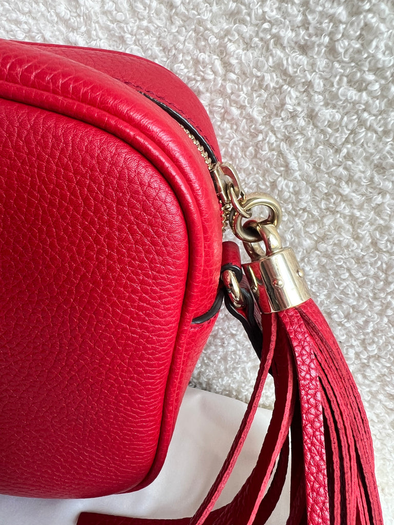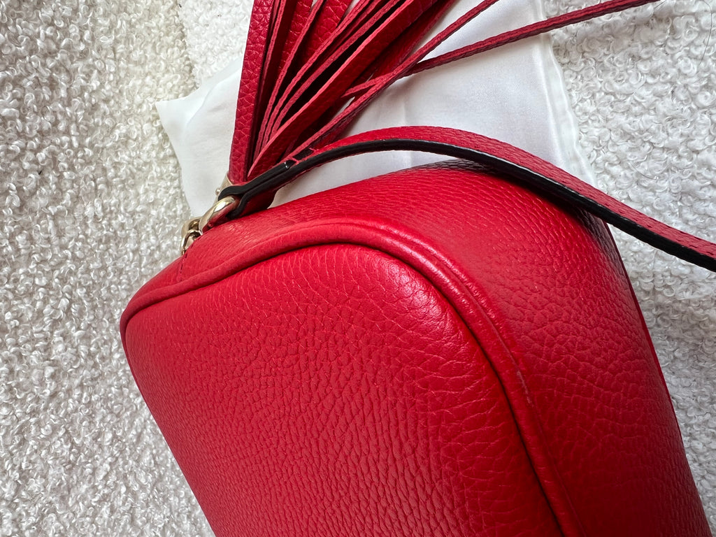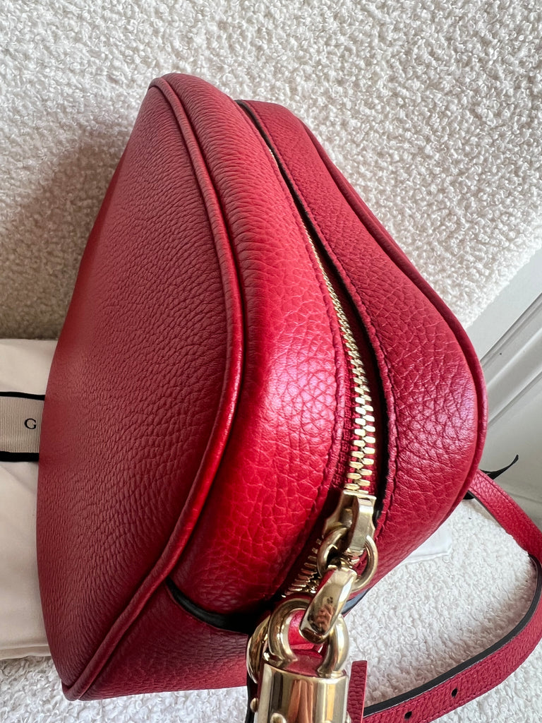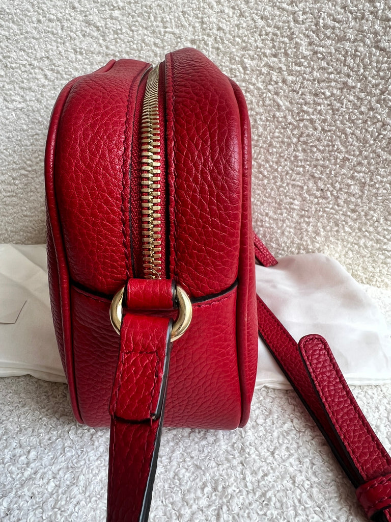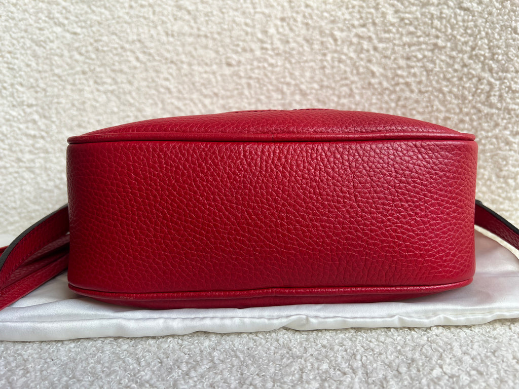 Gucci Soho Disco in Red Leather with pale gold hardware. This practical, cross body, camera style bag is compact in size but still fits a reasonable amount. Can be worn over shoulder or cross body. Gucci's most popular style and goes with any outfit, dressed up or down.