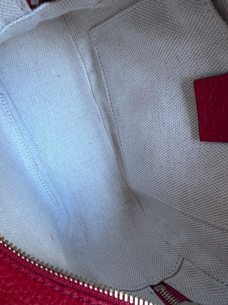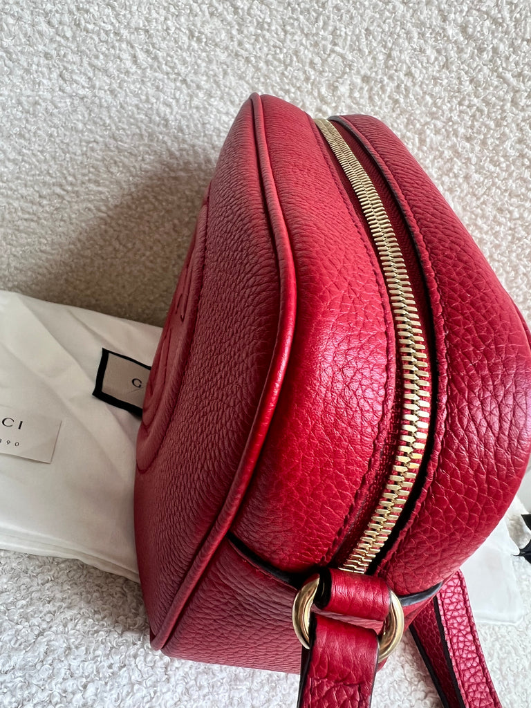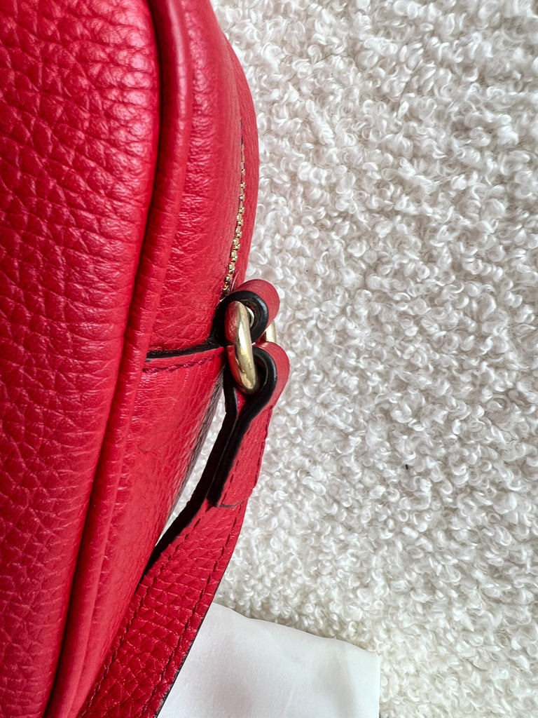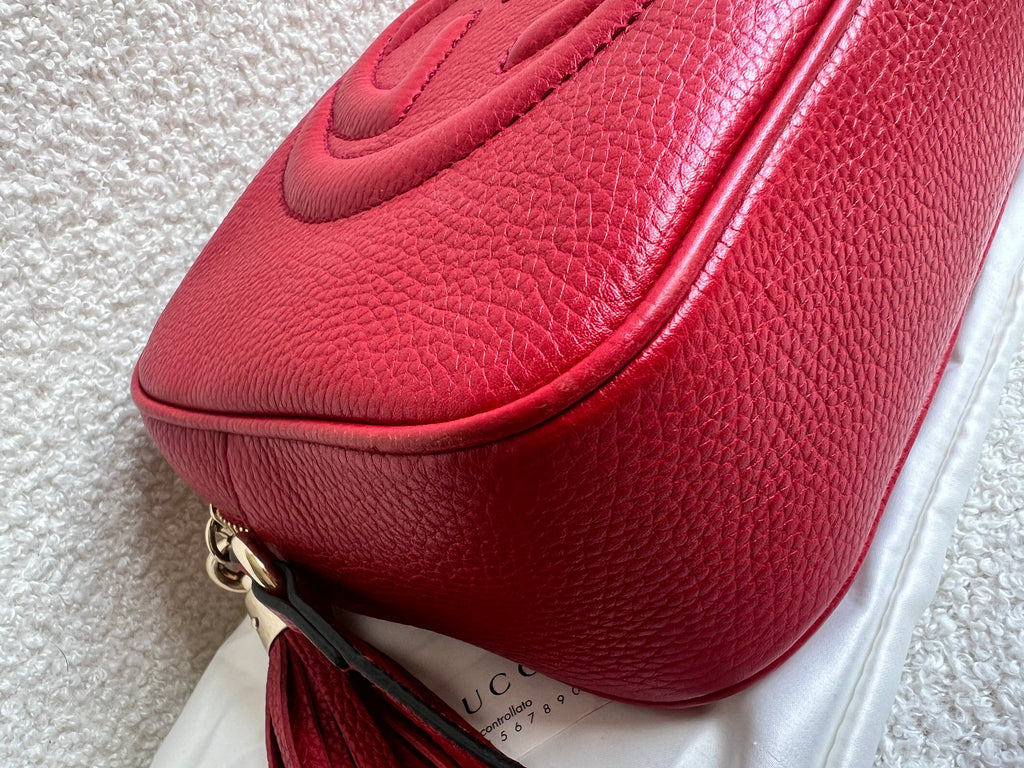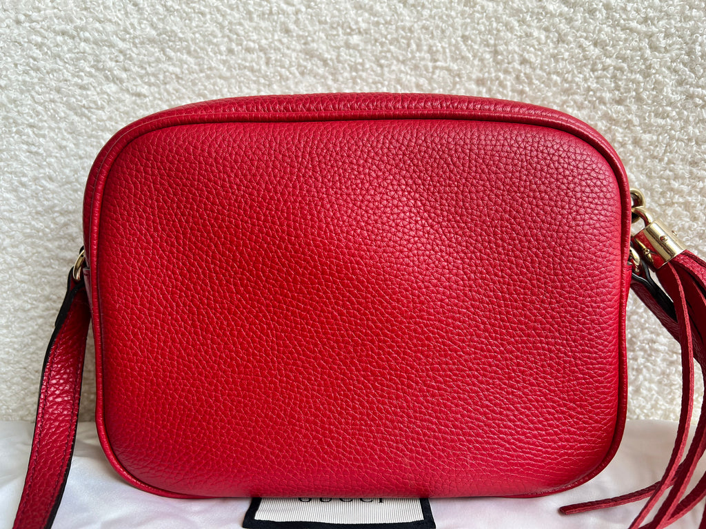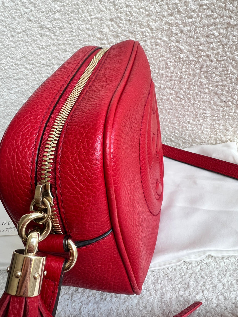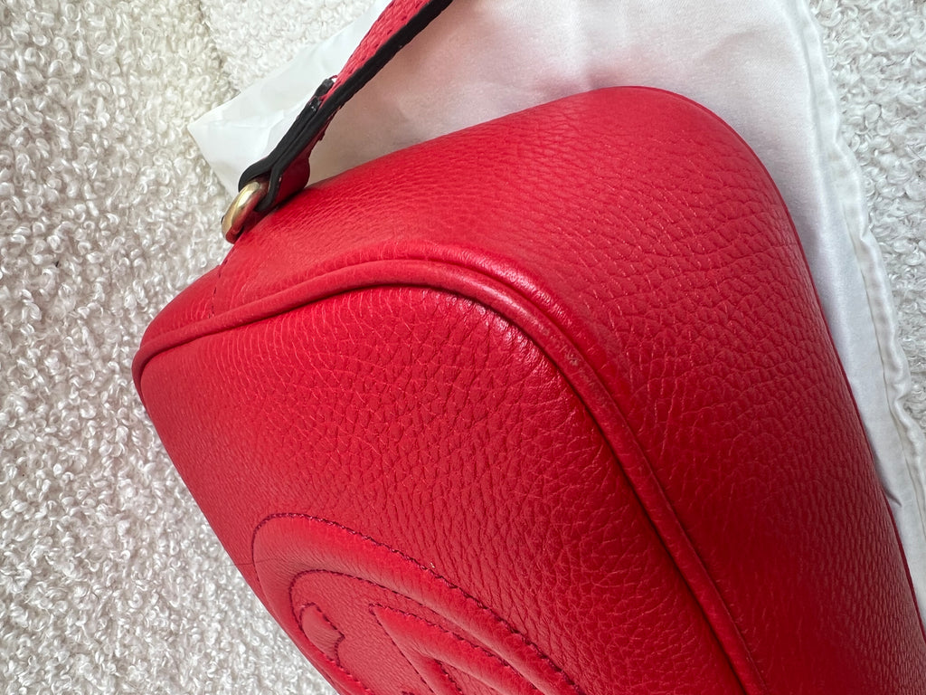 Gucci Soho Disco in Red Leather with pale gold hardware. This practical, cross body, camera style bag is compact in size but still fits a reasonable amount. Can be worn over shoulder or cross body. Gucci's most popular style and goes with any outfit, dressed up or down.