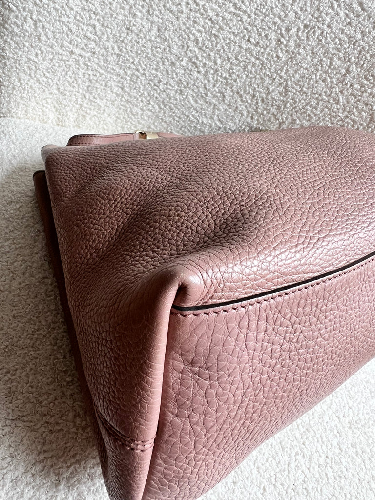 Gucci Soho Chain Tote in Rose Pink Grained Leather with pale gold hardware. This roomy tote features chain straps with leather sections and is ideal for day to day use. Can fit comfortably over the shoulder or can be carried in the crook of the arm. Roomy in size and somewhat slouchy in shape.