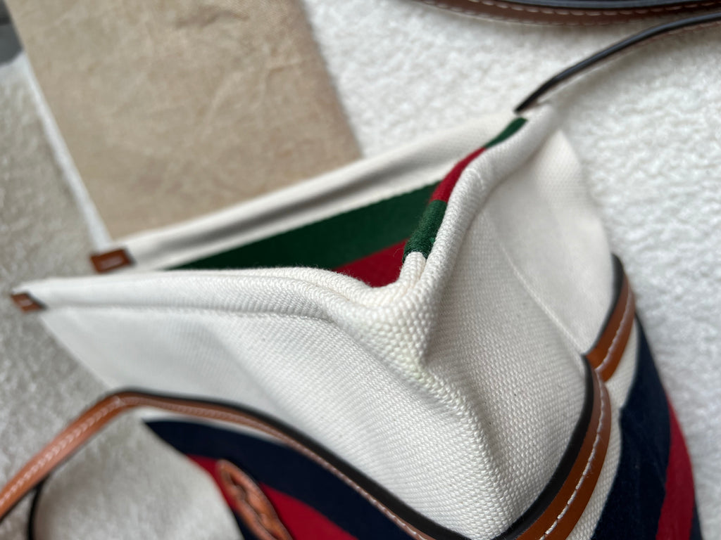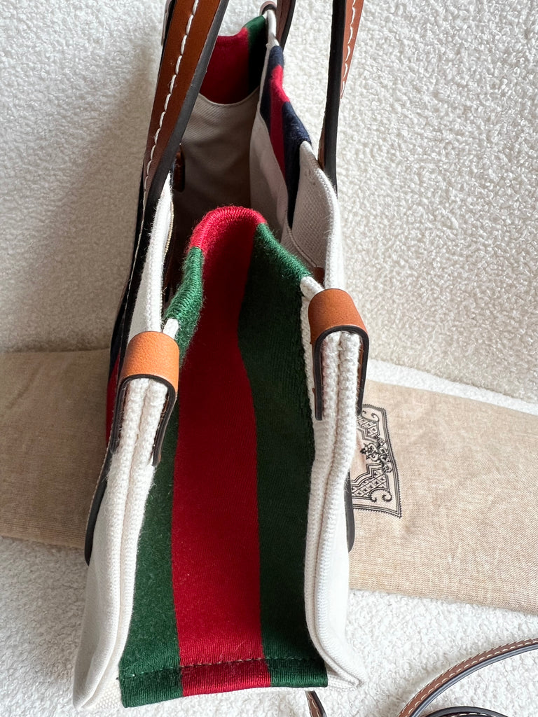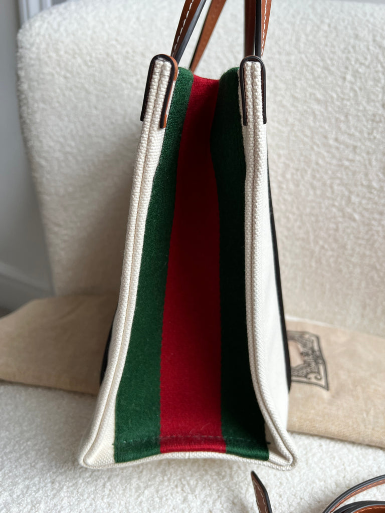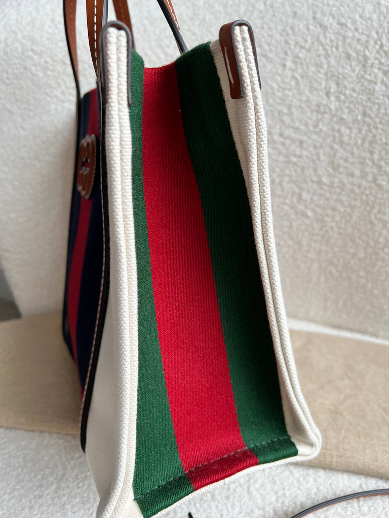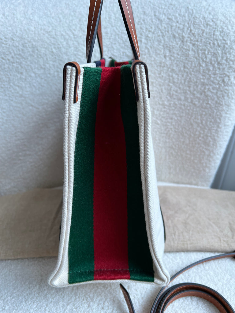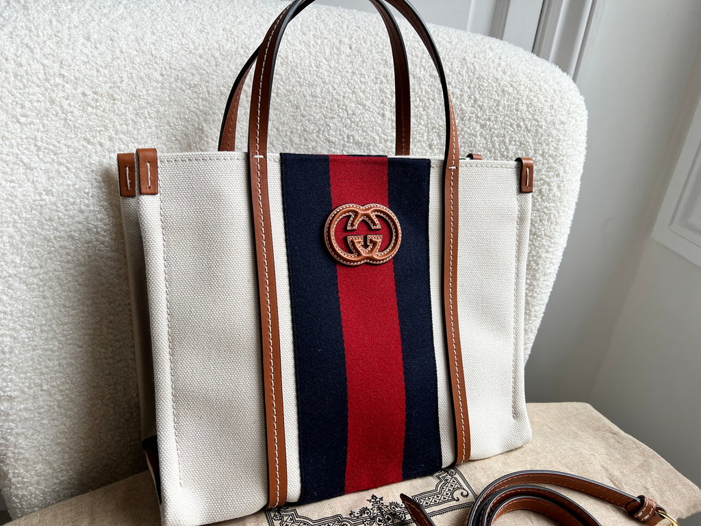 Gucci Small Interlocking GG Bag in White canvas with web stripe. This geometric shaped tote features two top handles and detachable strap. Ideal for day to day use with different carrying options.