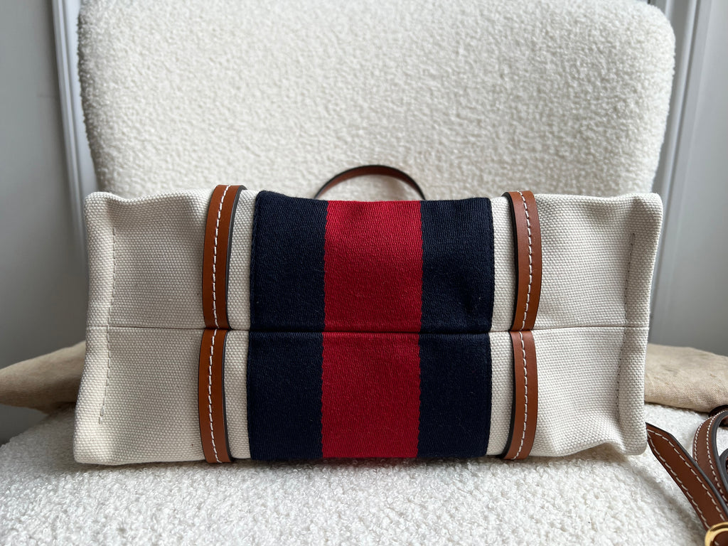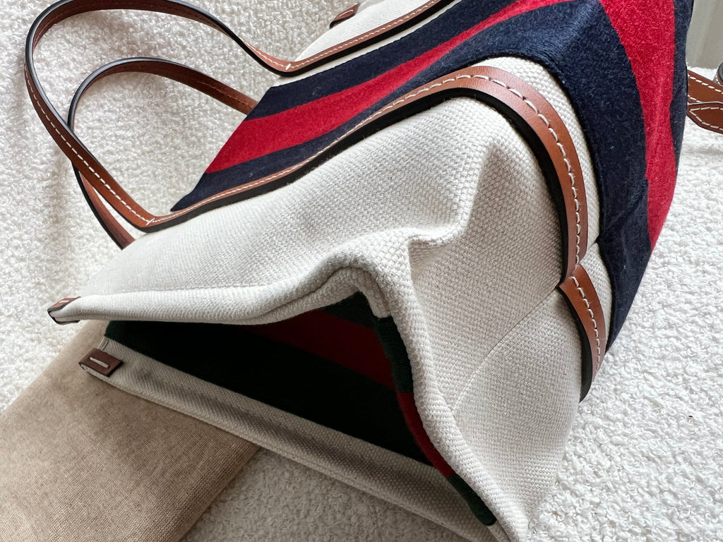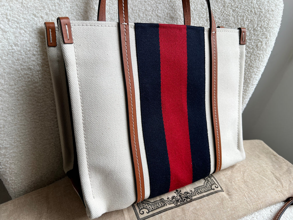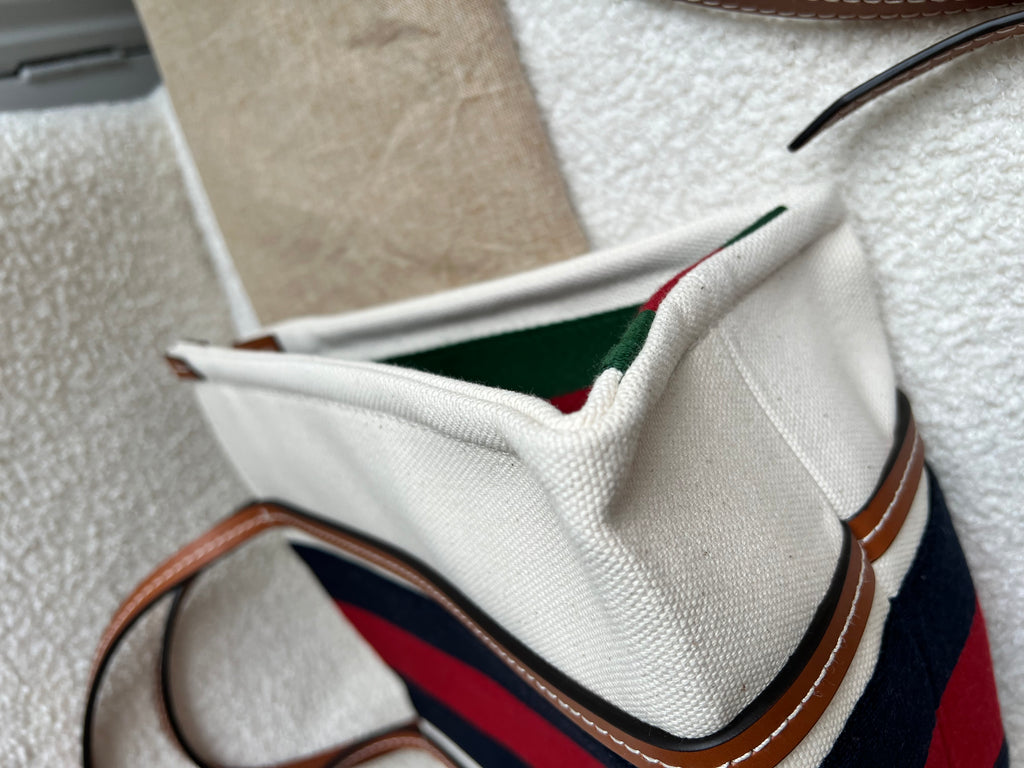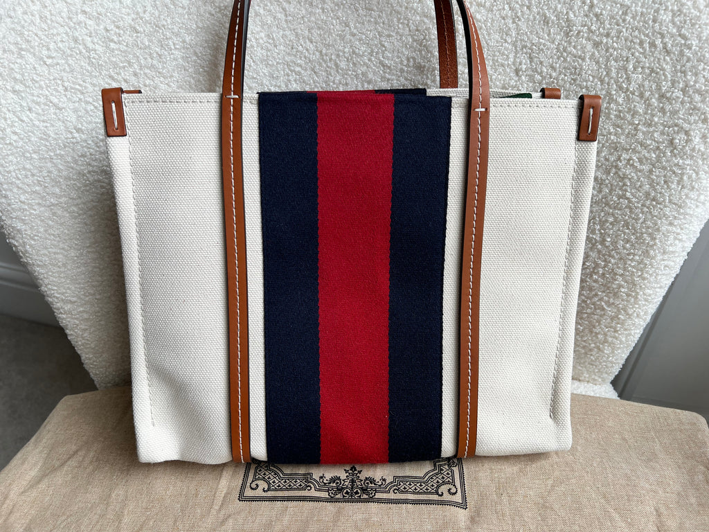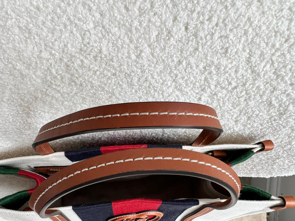 Gucci Small Interlocking GG Bag in White canvas with web stripe. This geometric shaped tote features two top handles and detachable strap. Ideal for day to day use with different carrying options.
