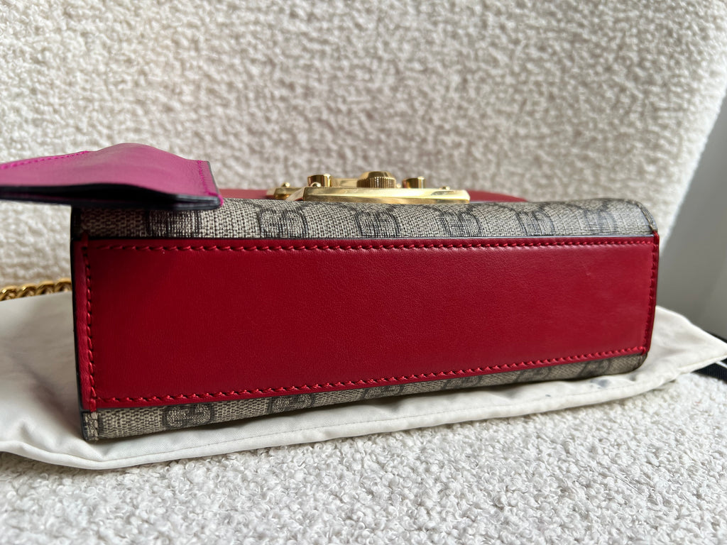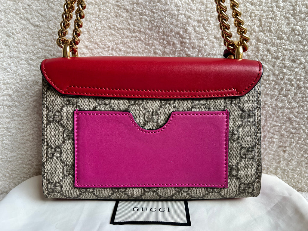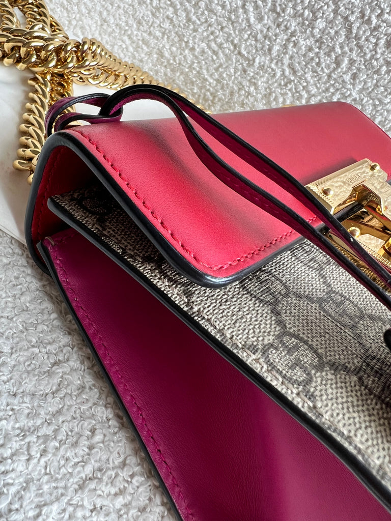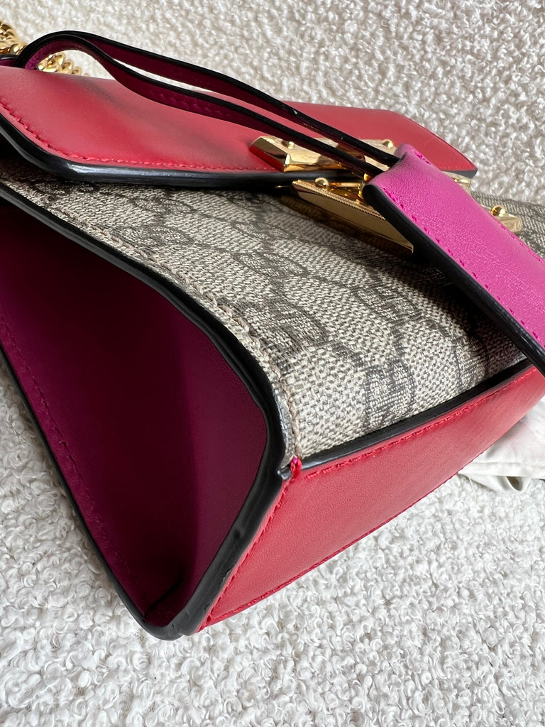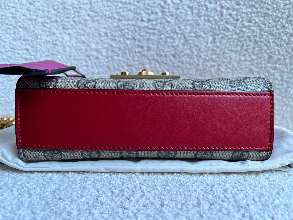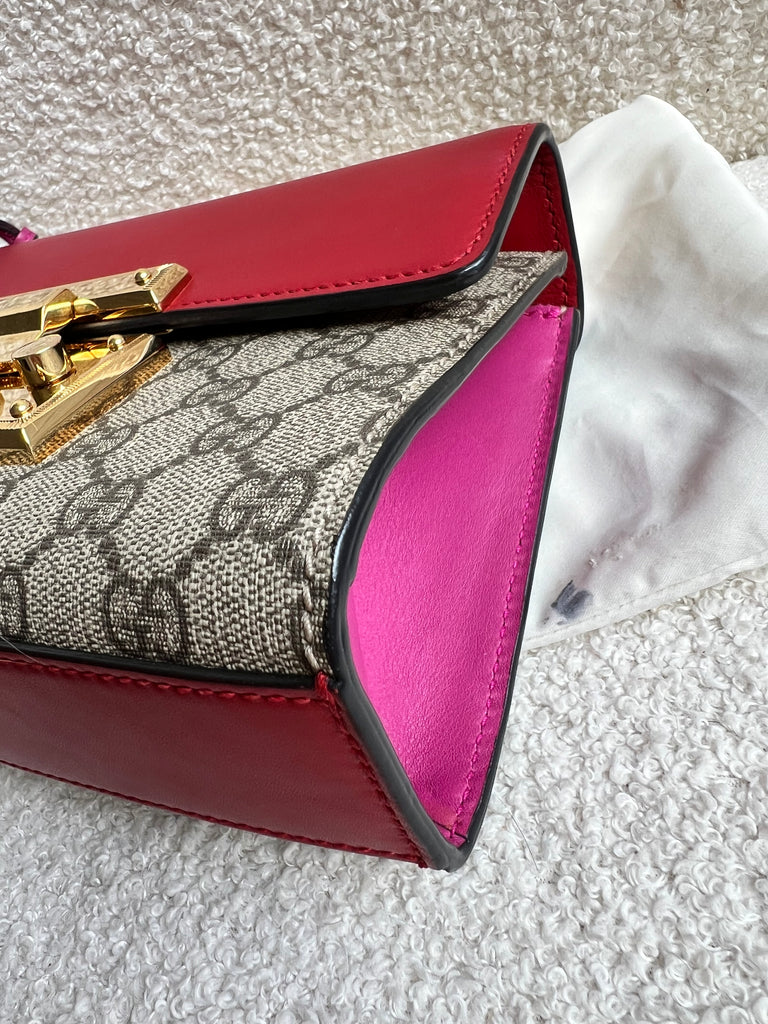 Gucci Small Padlock Shoulder Bag in Supreme Canvas, Red and pink leather and gold hardware. This structured GG Supreme bag features a leather top and a key lock closure. The sliding chain strap can be worn multiple ways, changing between a shoulder and a top handle bag. Ideal for both day to day or evening.