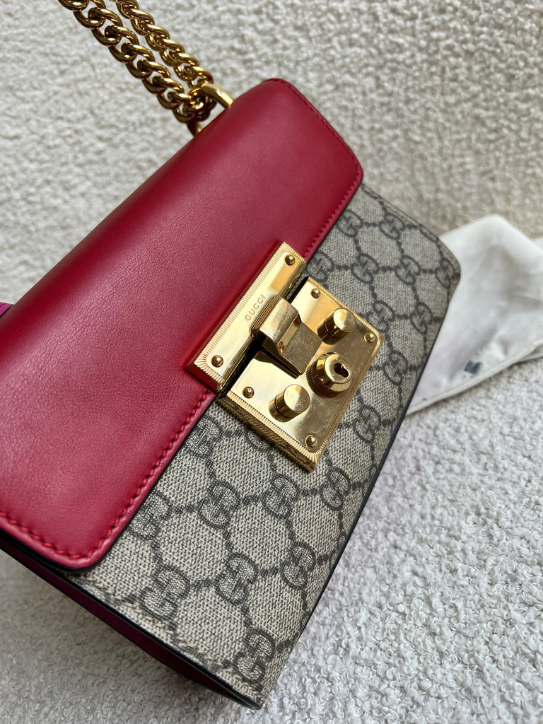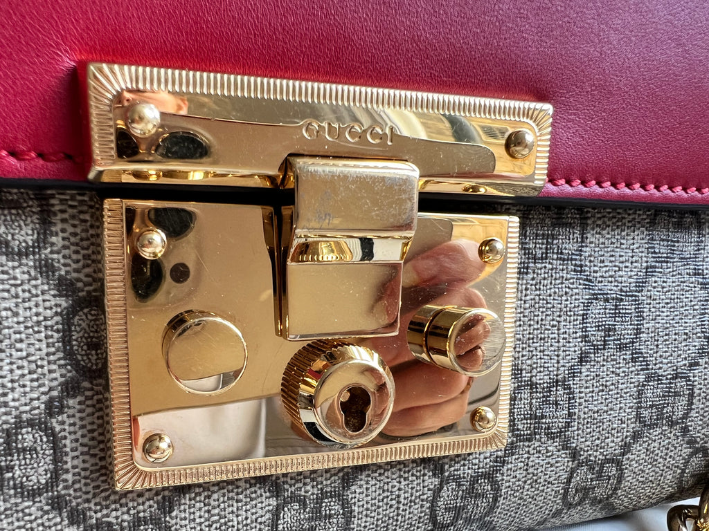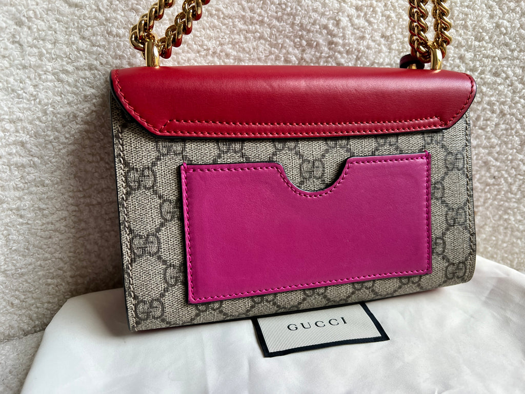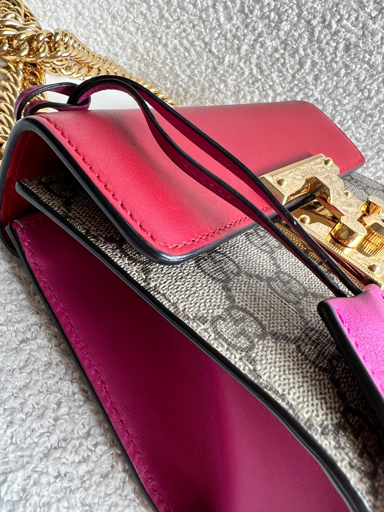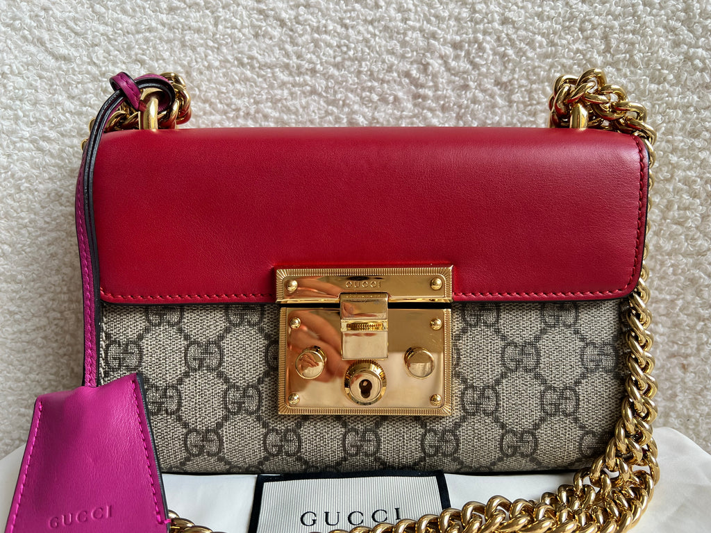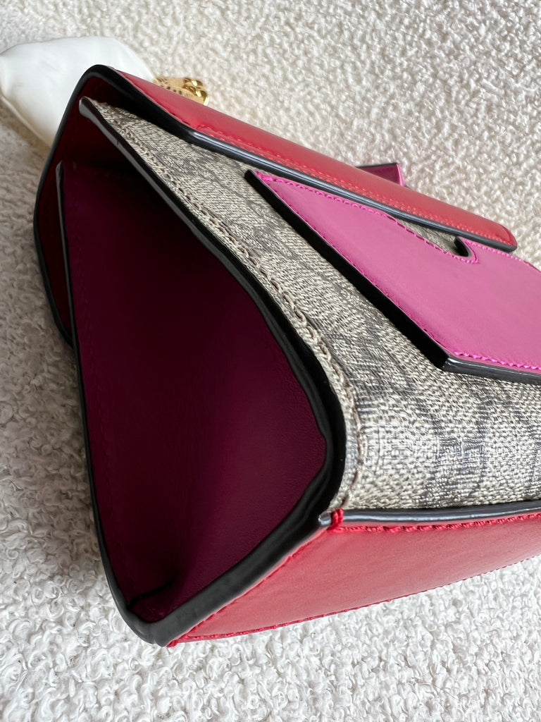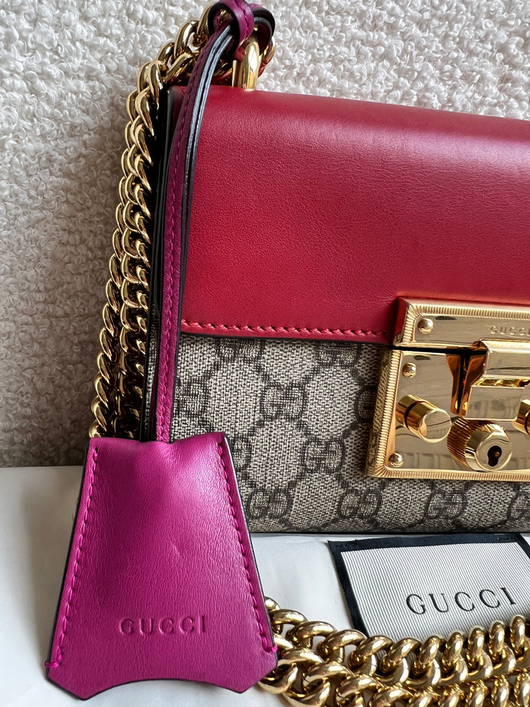 Gucci Small Padlock Shoulder Bag in Supreme Canvas, Red and pink leather and gold hardware. This structured GG Supreme bag features a leather top and a key lock closure. The sliding chain strap can be worn multiple ways, changing between a shoulder and a top handle bag. Ideal for both day to day or evening.