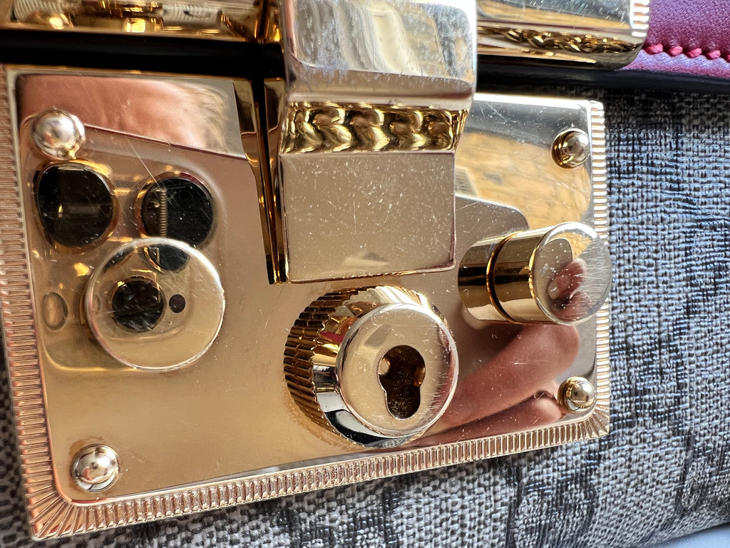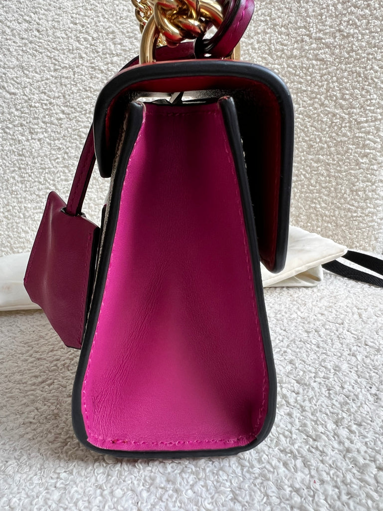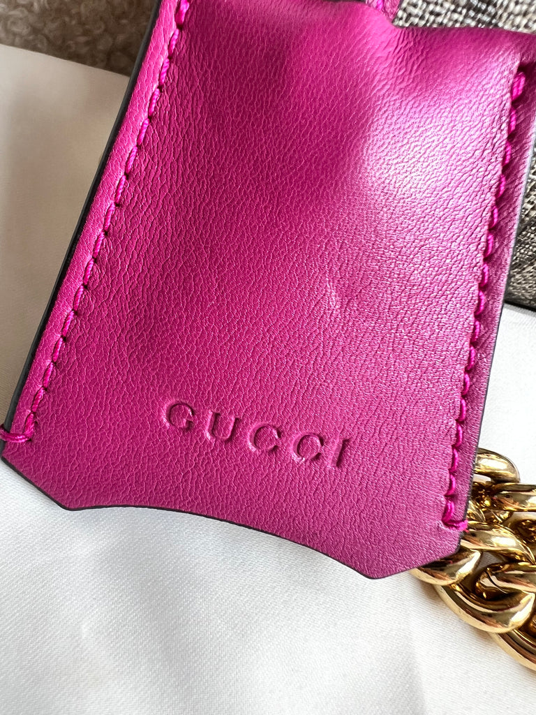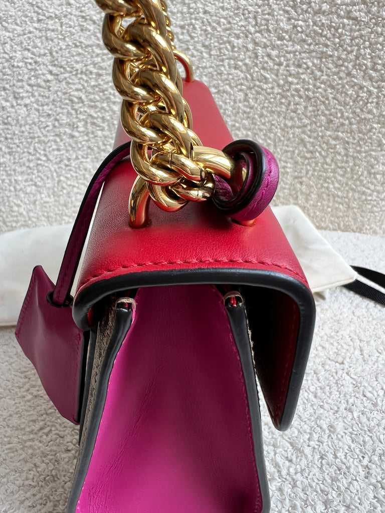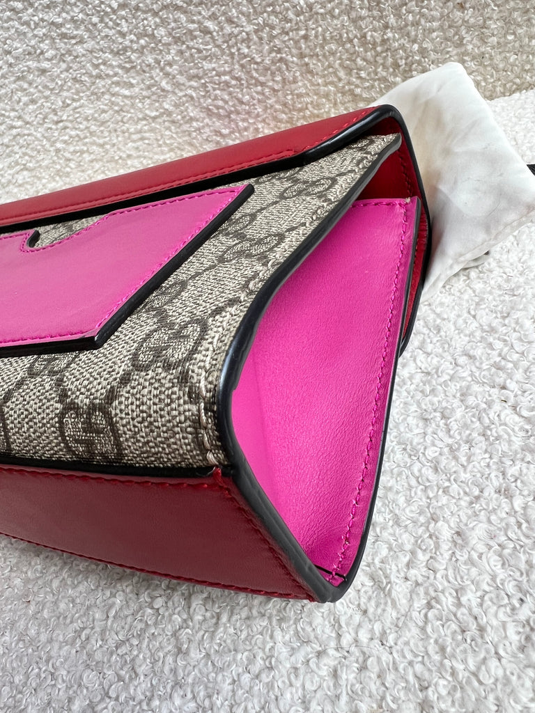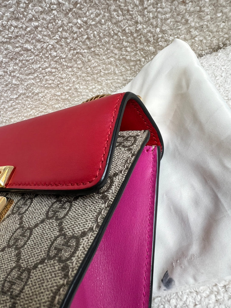 Gucci Small Padlock Shoulder Bag in Supreme Canvas, Red and pink leather and gold hardware. This structured GG Supreme bag features a leather top and a key lock closure. The sliding chain strap can be worn multiple ways, changing between a shoulder and a top handle bag. Ideal for both day to day or evening.