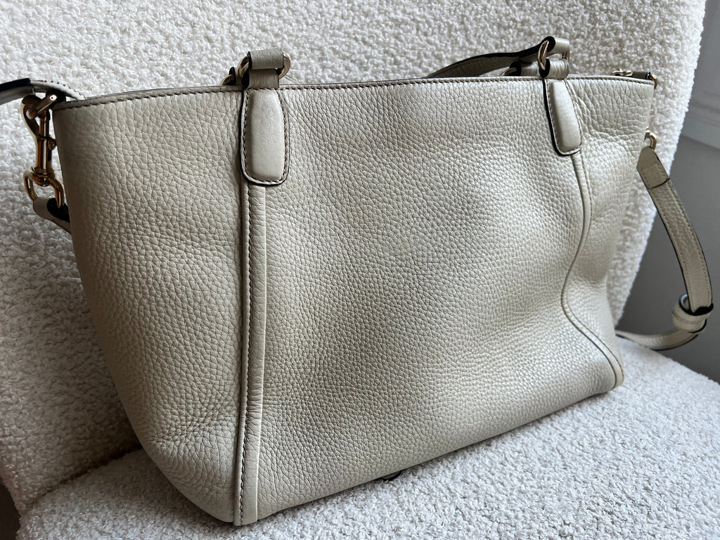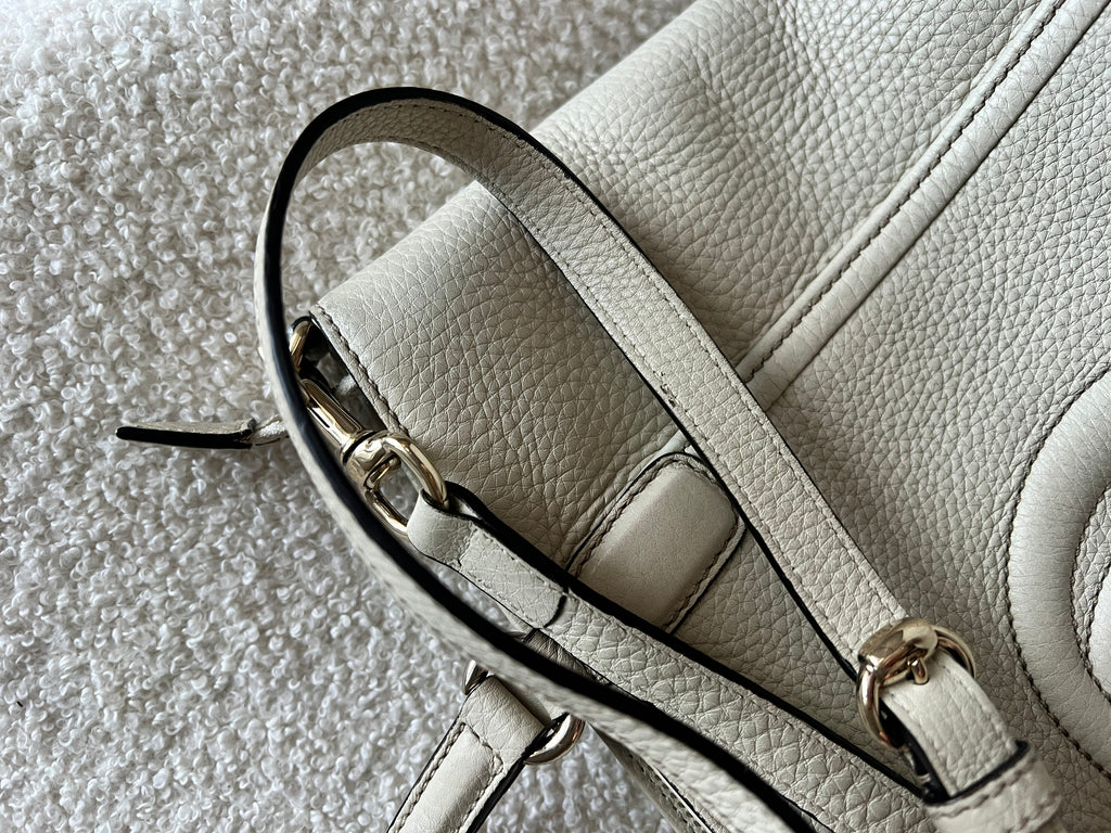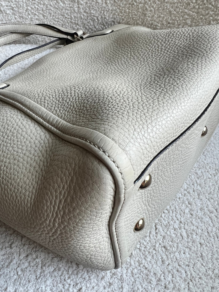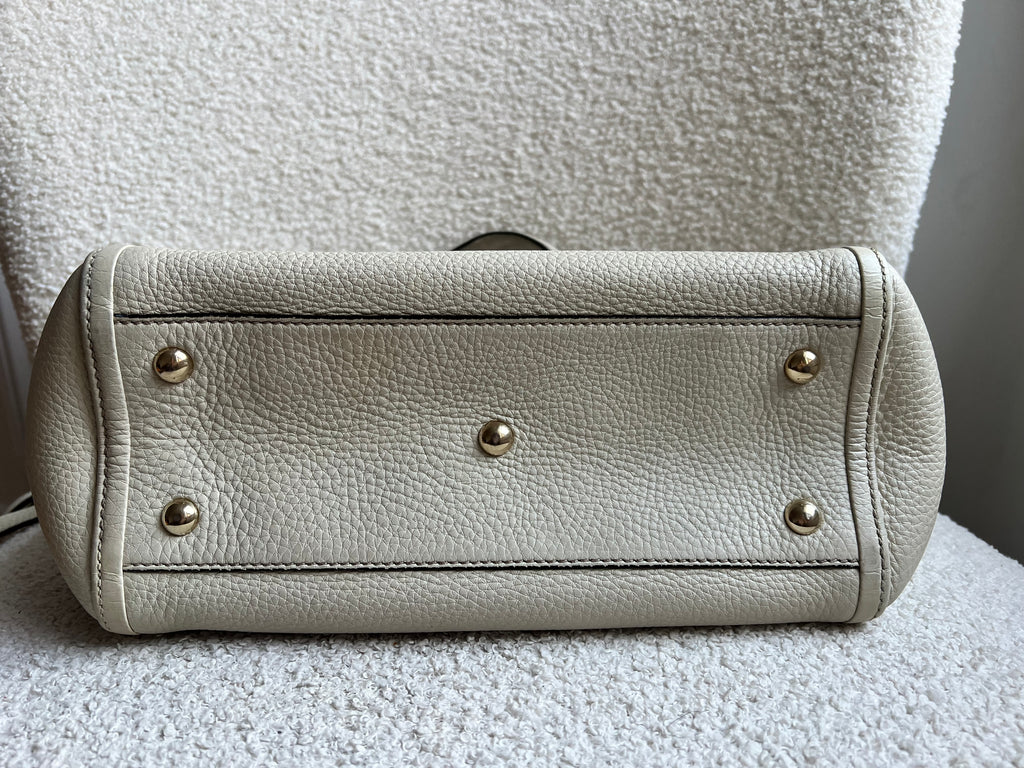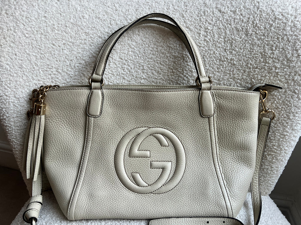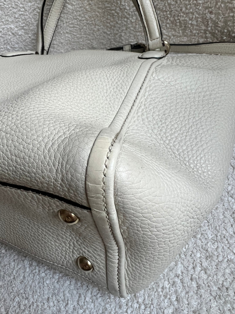 Gucci Soho Working Tote in Eggshell Pebbled Calfskin with pale gold hardware. This medium tote features a detachable strap is both stylish and practical and ideal for day to day use. Lightweight and easy to carry, this style can be carried in the crook of the arm, carried in hand or worn over the shoulder/cross body.