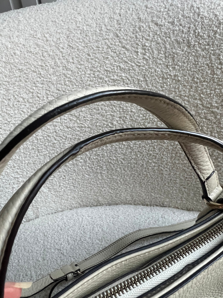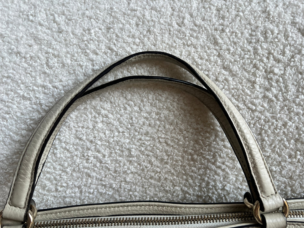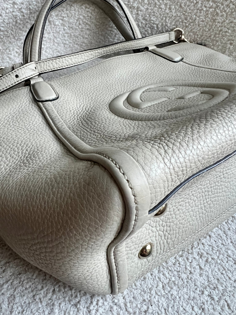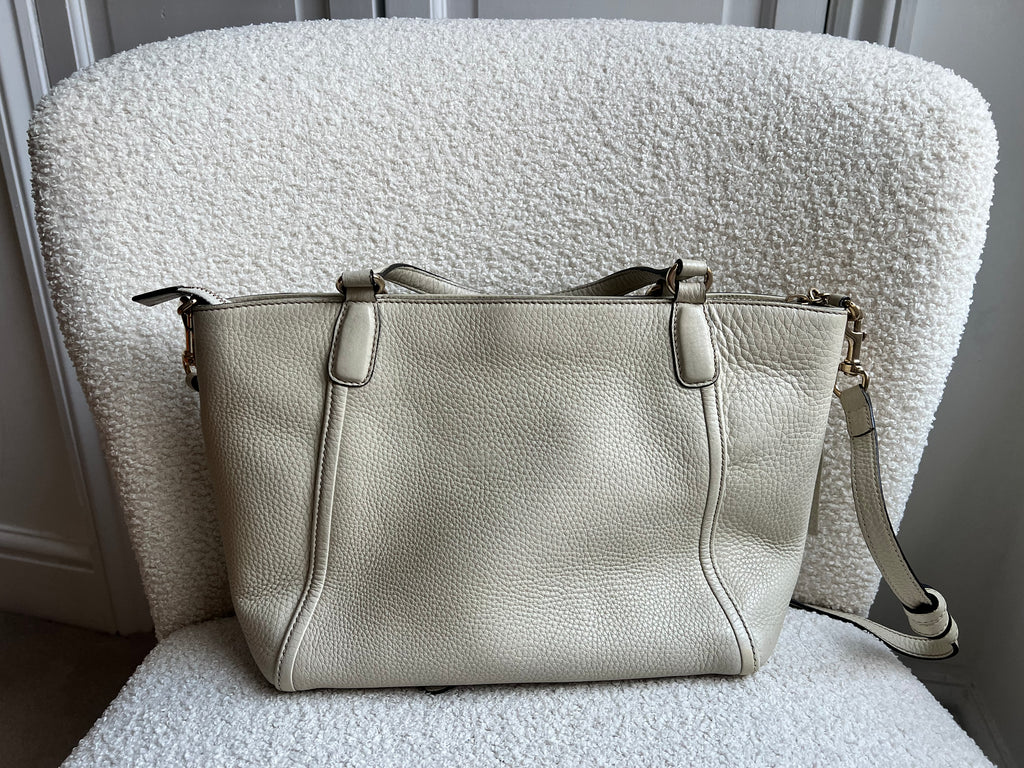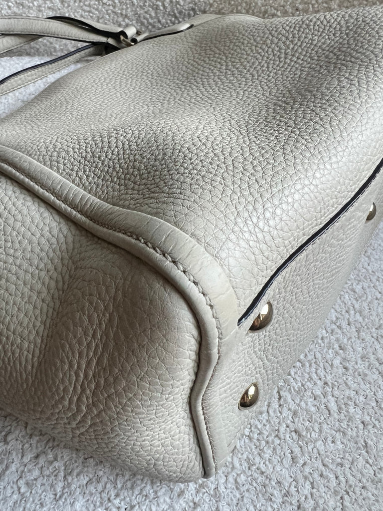 Gucci Soho Working Tote in Eggshell Pebbled Calfskin with pale gold hardware. This medium tote features a detachable strap is both stylish and practical and ideal for day to day use. Lightweight and easy to carry, this style can be carried in the crook of the arm, carried in hand or worn over the shoulder/cross body.