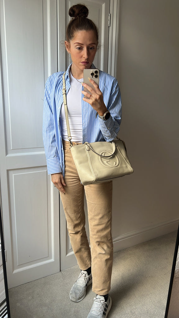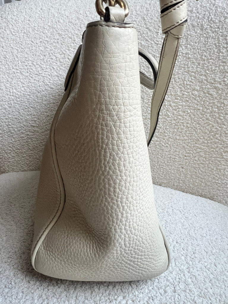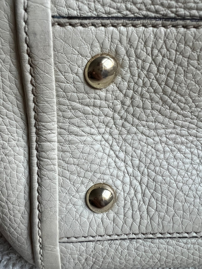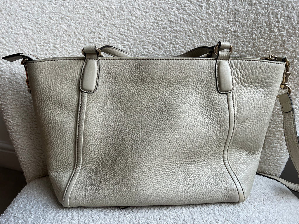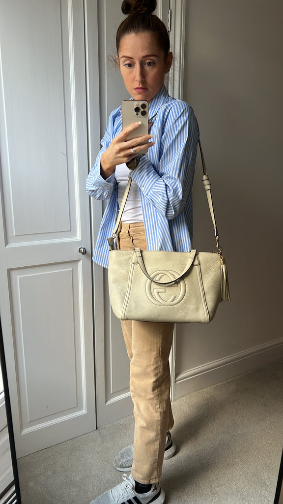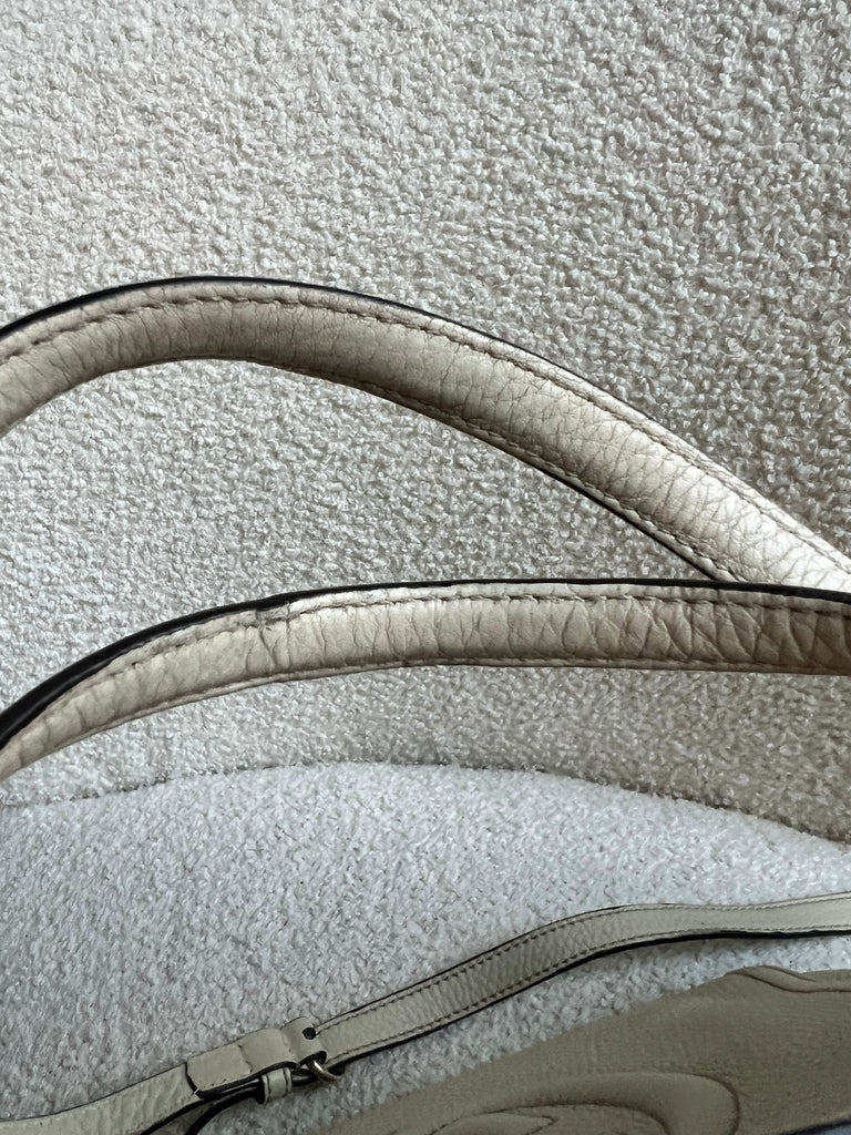 Gucci Soho Working Tote in Eggshell Pebbled Calfskin with pale gold hardware. This medium tote features a detachable strap is both stylish and practical and ideal for day to day use. Lightweight and easy to carry, this style can be carried in the crook of the arm, carried in hand or worn over the shoulder/cross body.