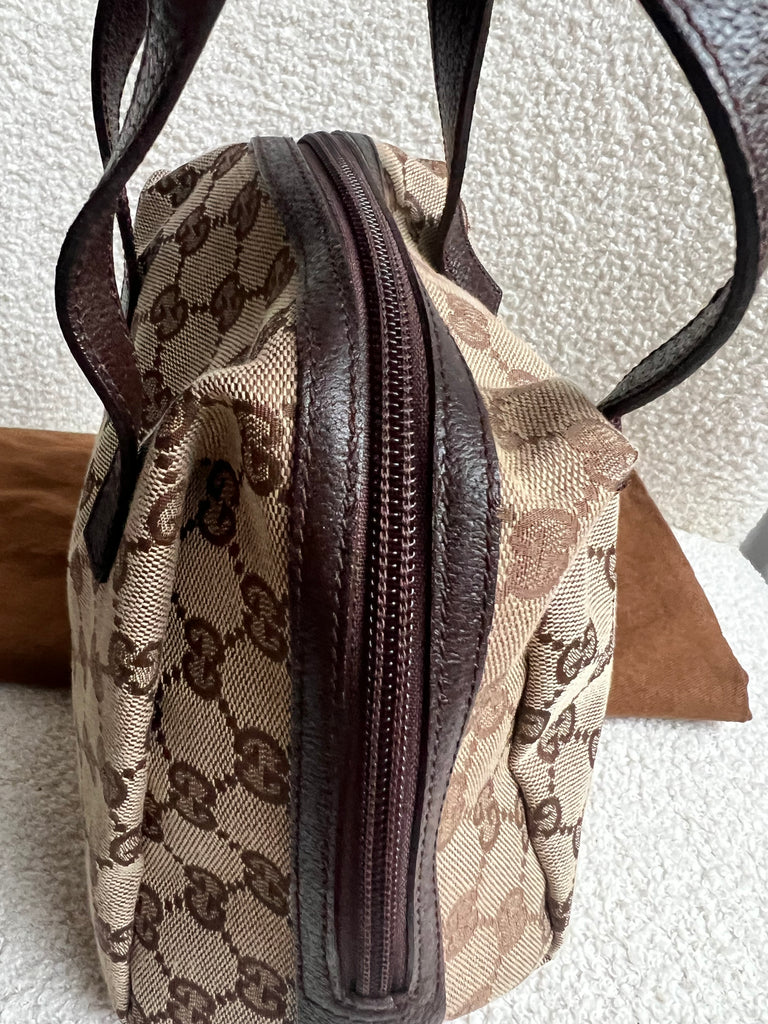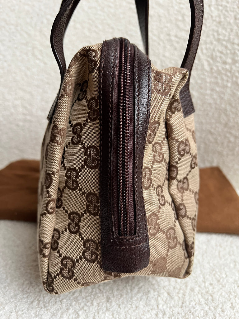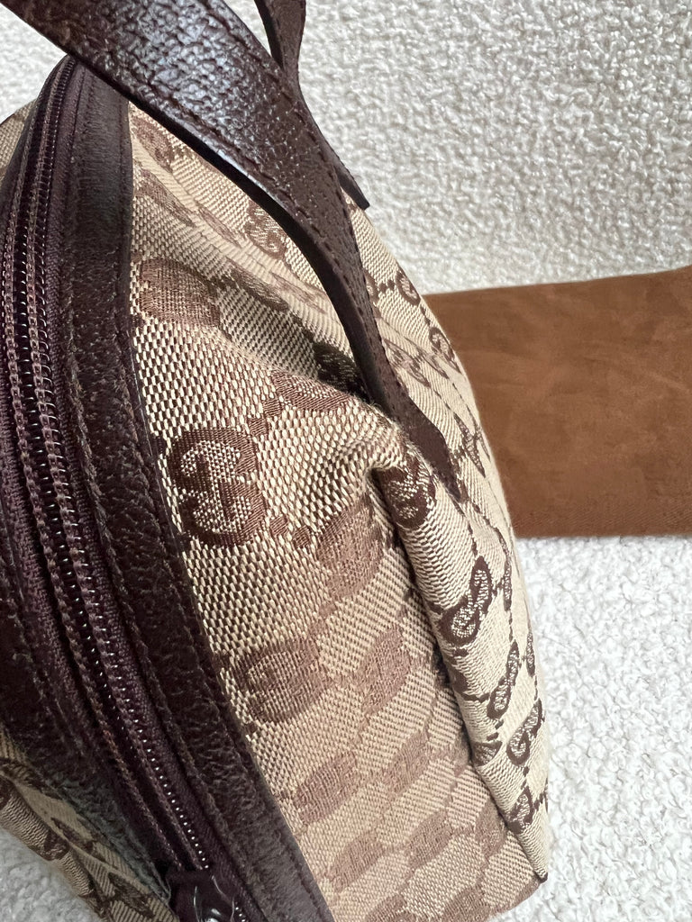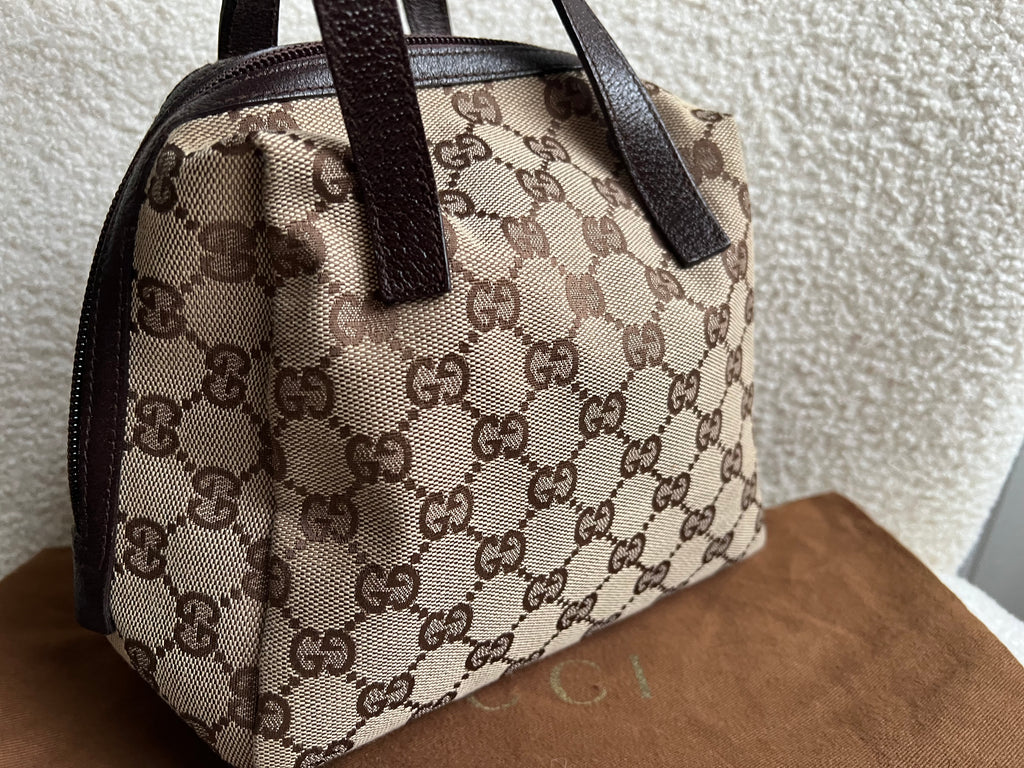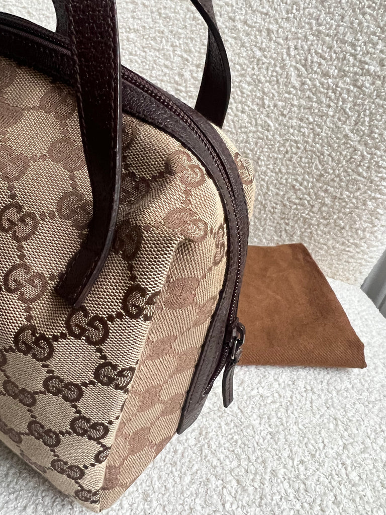 Gucci Mini bag in GG Canvas with brown leather trim and gold hardware. This compact tore style bag is cute and stylish. Can be carried in hand or in the crook of the arm.