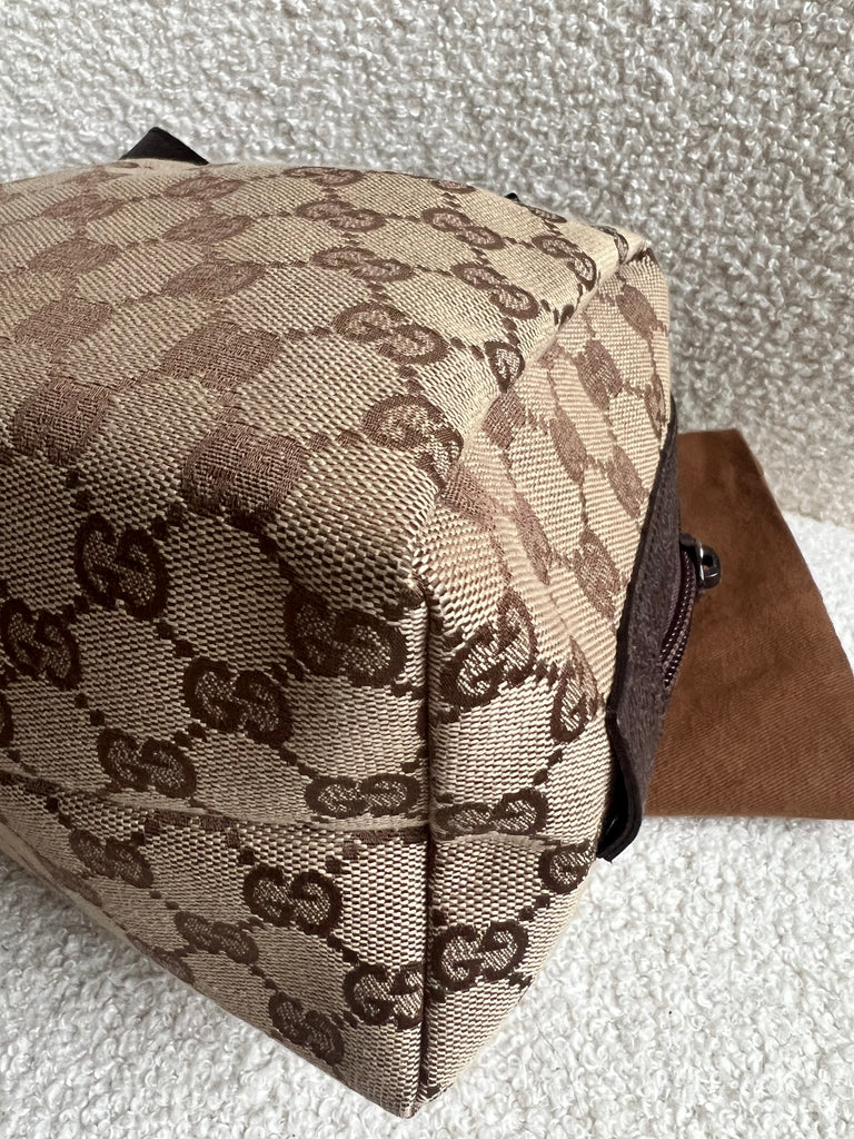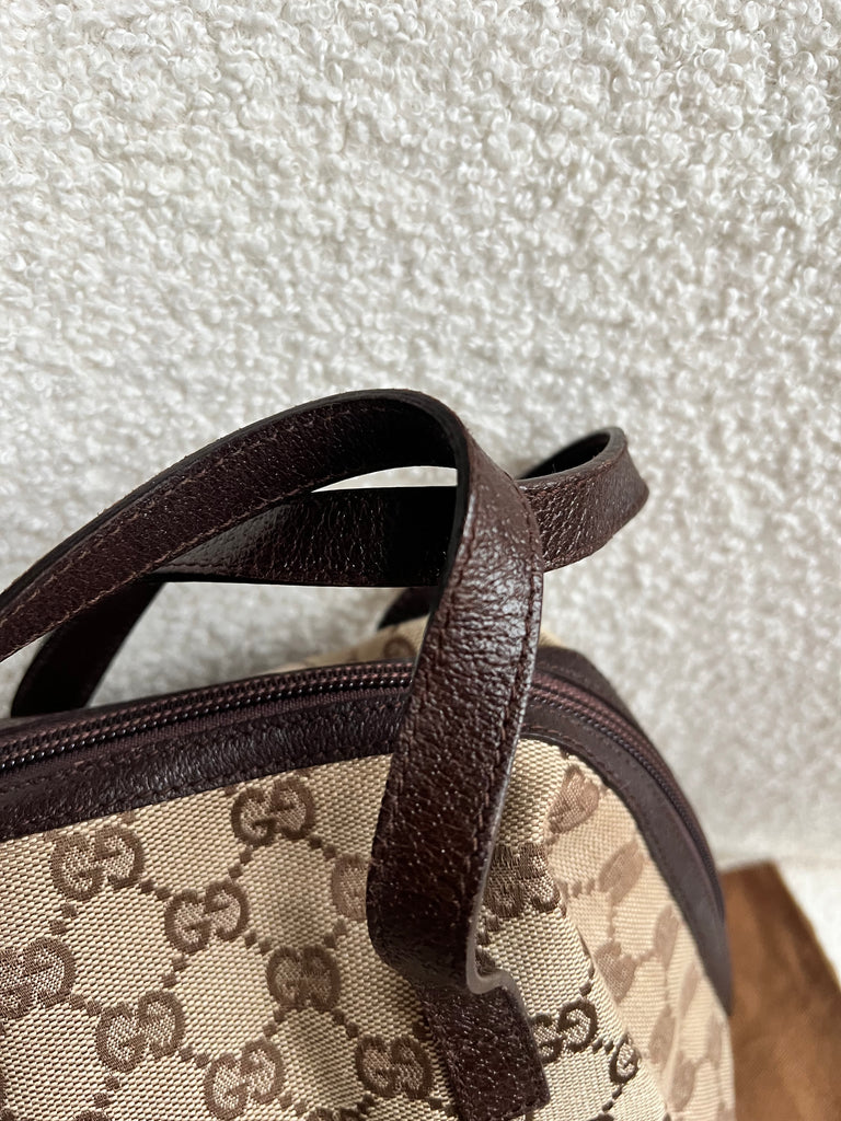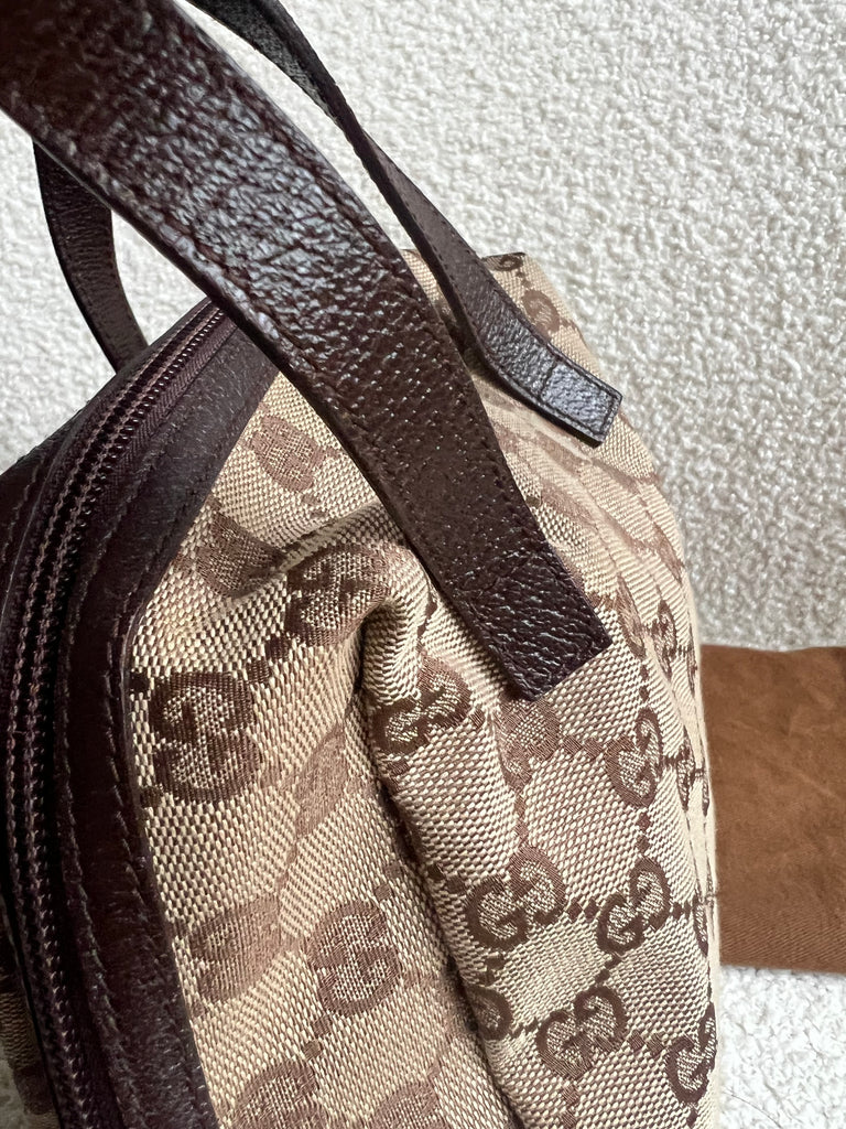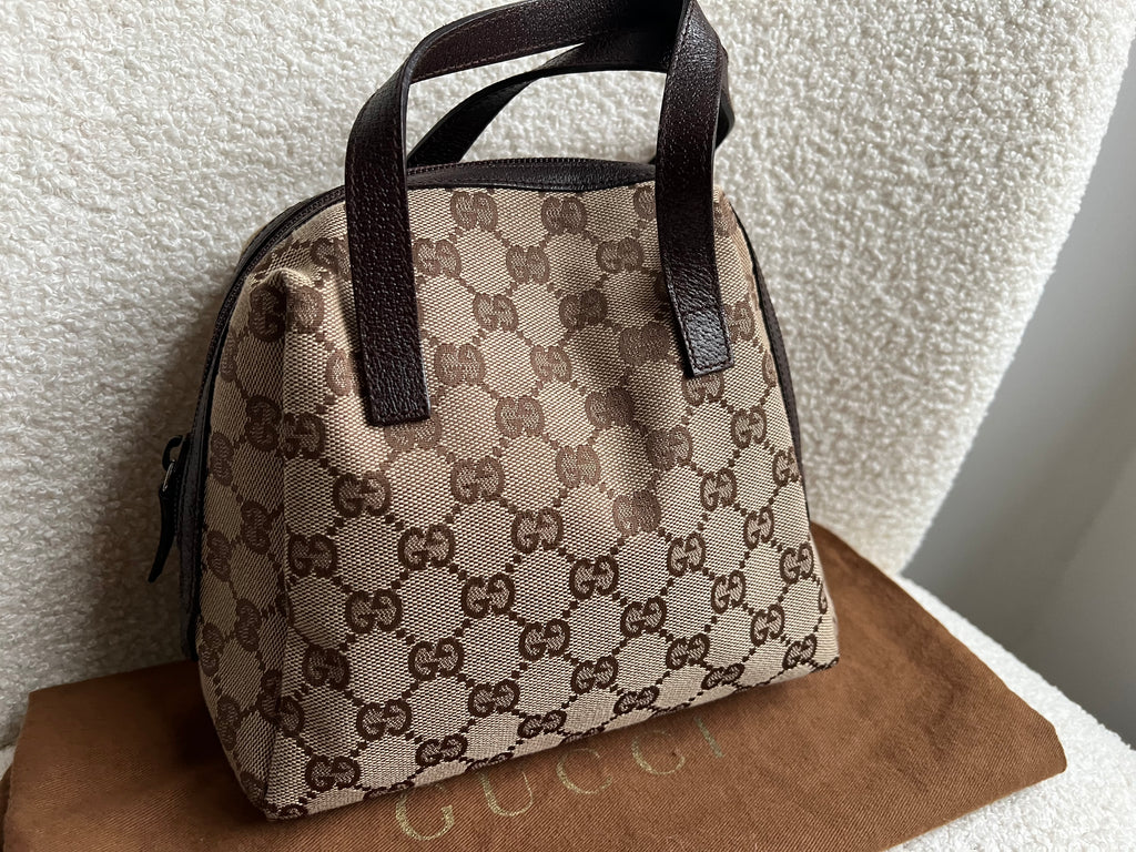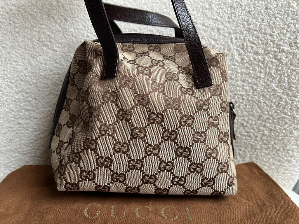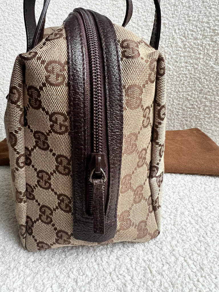 Gucci Mini bag in GG Canvas with brown leather trim and gold hardware. This compact tore style bag is cute and stylish. Can be carried in hand or in the crook of the arm.