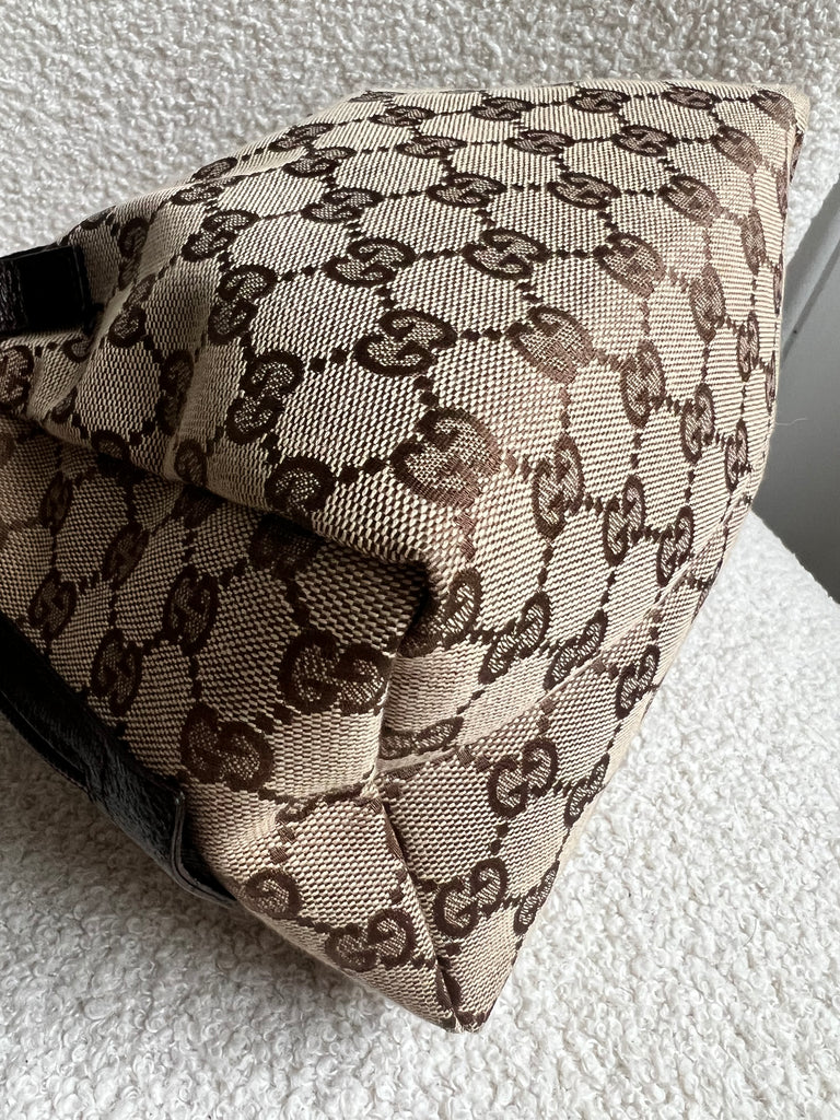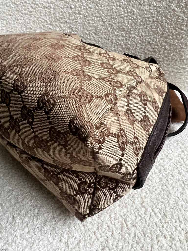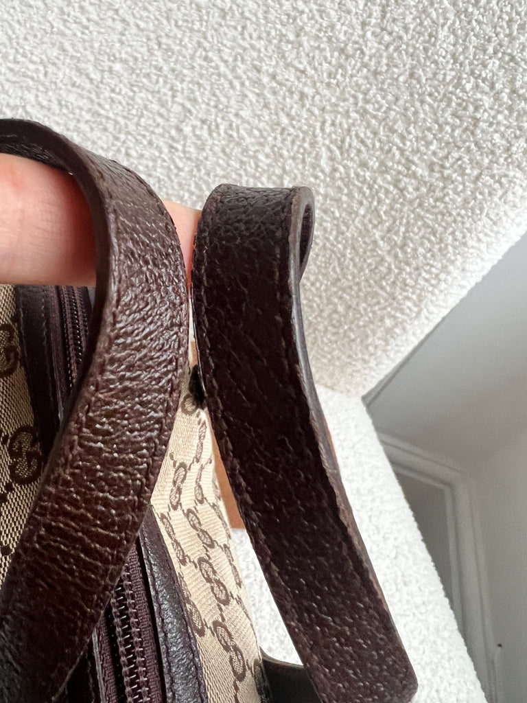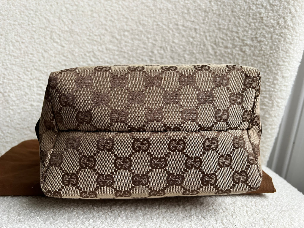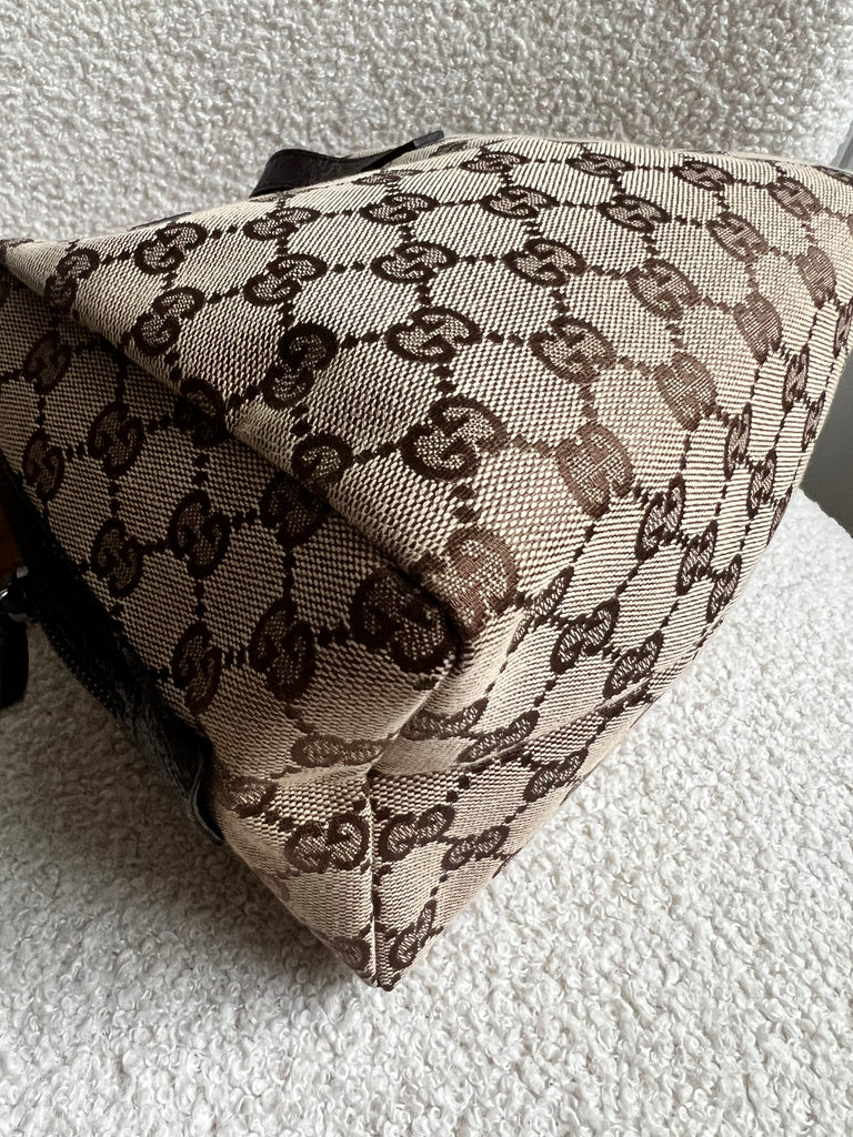 Gucci Mini bag in GG Canvas with brown leather trim and gold hardware. This compact tore style bag is cute and stylish. Can be carried in hand or in the crook of the arm.