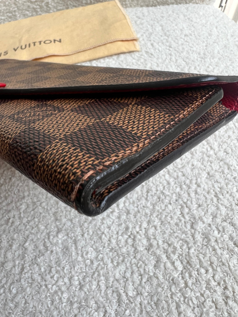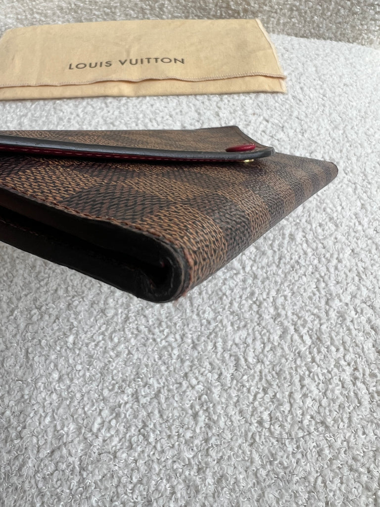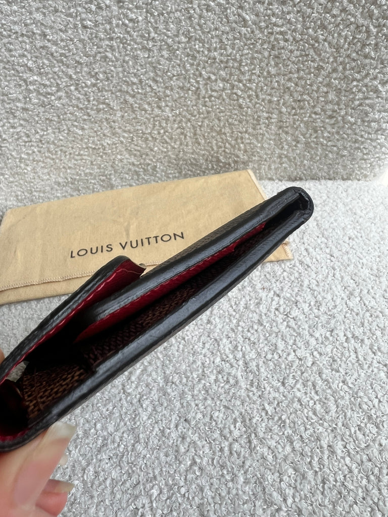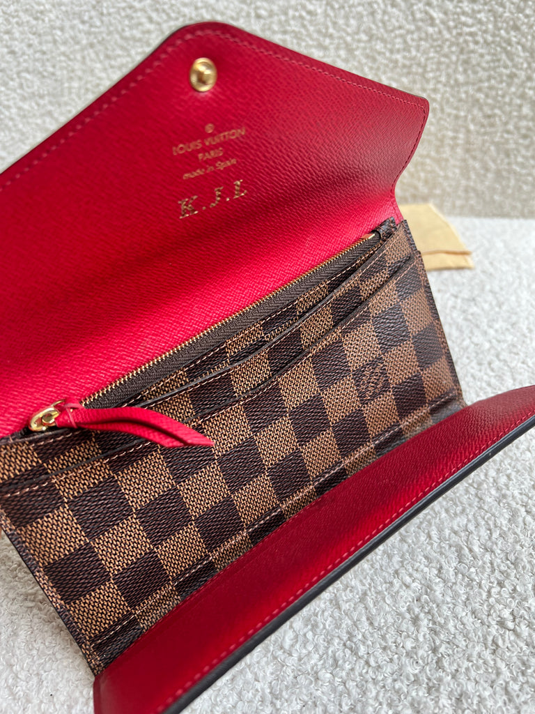 Louis Vuitton Josephine Wallet in Damier Ebene and cherry red interior with gold hardware. Its envelope-style flap, which is secured with a color-matched press-stud, lifts to reveal a well-organized interior with a main compartment, Removable zipped coin insert and card slots. KJL initials have been hotstamped under the flap.