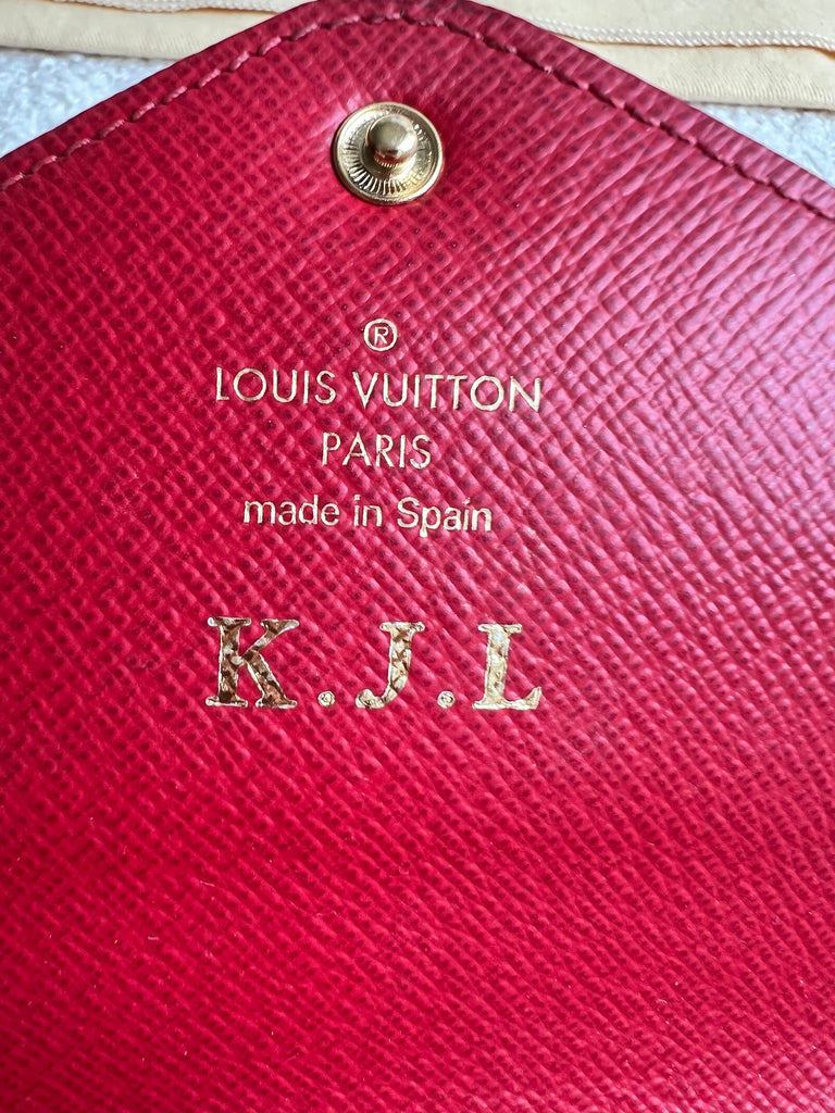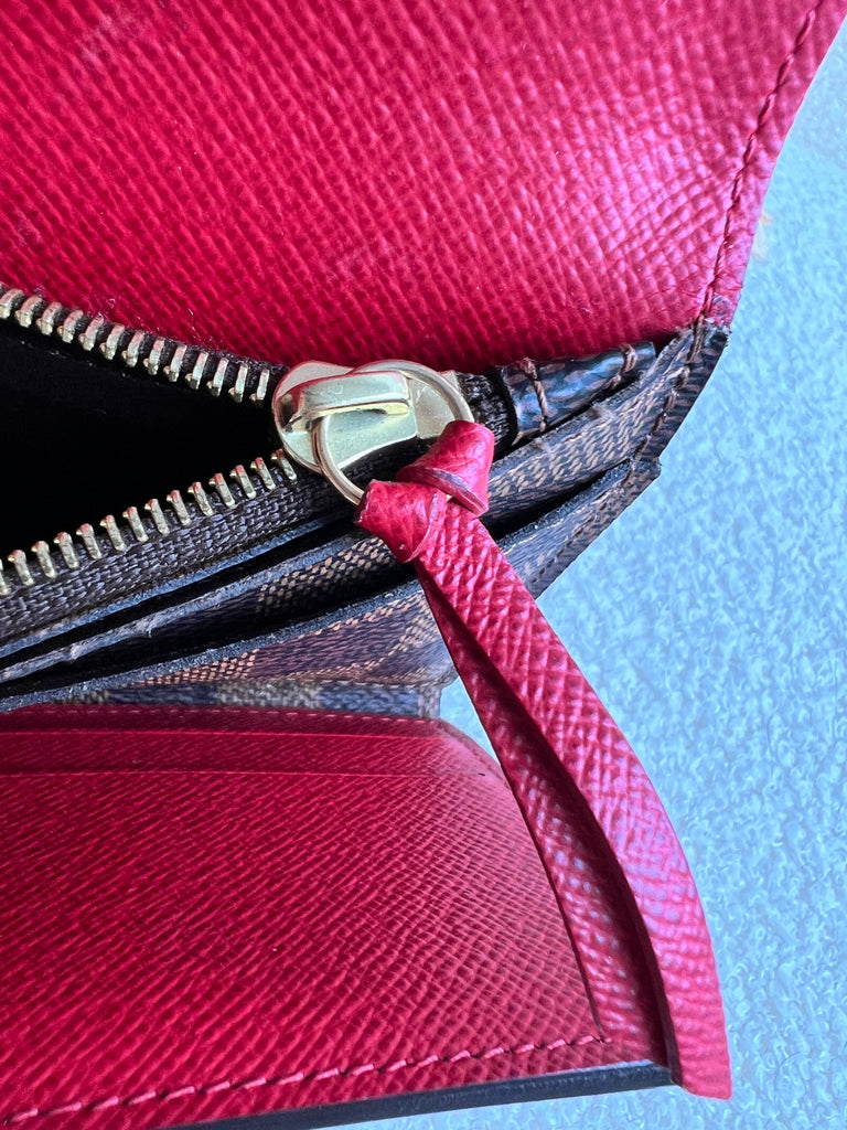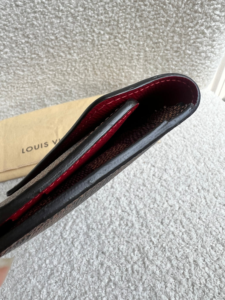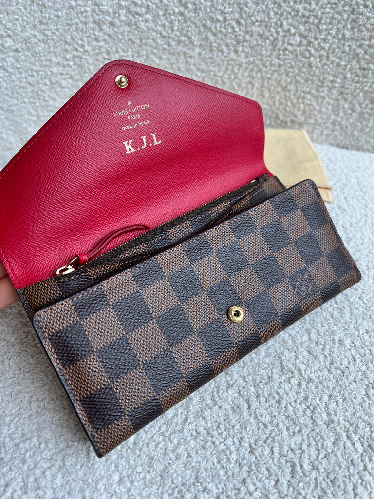 Louis Vuitton Josephine Wallet in Damier Ebene and cherry red interior with gold hardware. Its envelope-style flap, which is secured with a color-matched press-stud, lifts to reveal a well-organized interior with a main compartment, Removable zipped coin insert and card slots. KJL initials have been hotstamped under the flap.