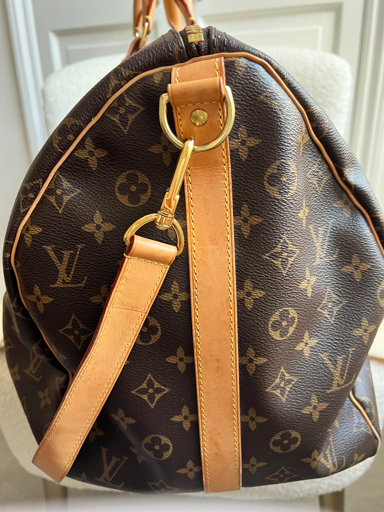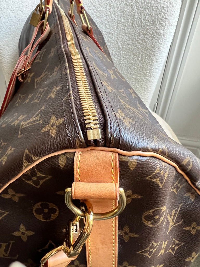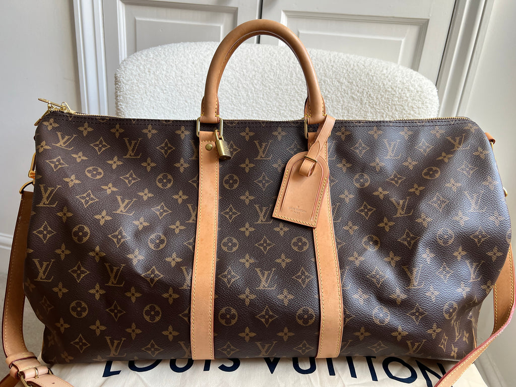 Louis Vuitton Keepall Bandouliere 55 in Monogram Canvas with Gold Hardware. This iconic bag embodies the spirit of modern travel. Light, supple and stylish, this cabin friendly is perfect for weekends away or short travel. Can be carried in hand or over shoulder using detachable strap. Highly sought after. microchip item (post 2021).