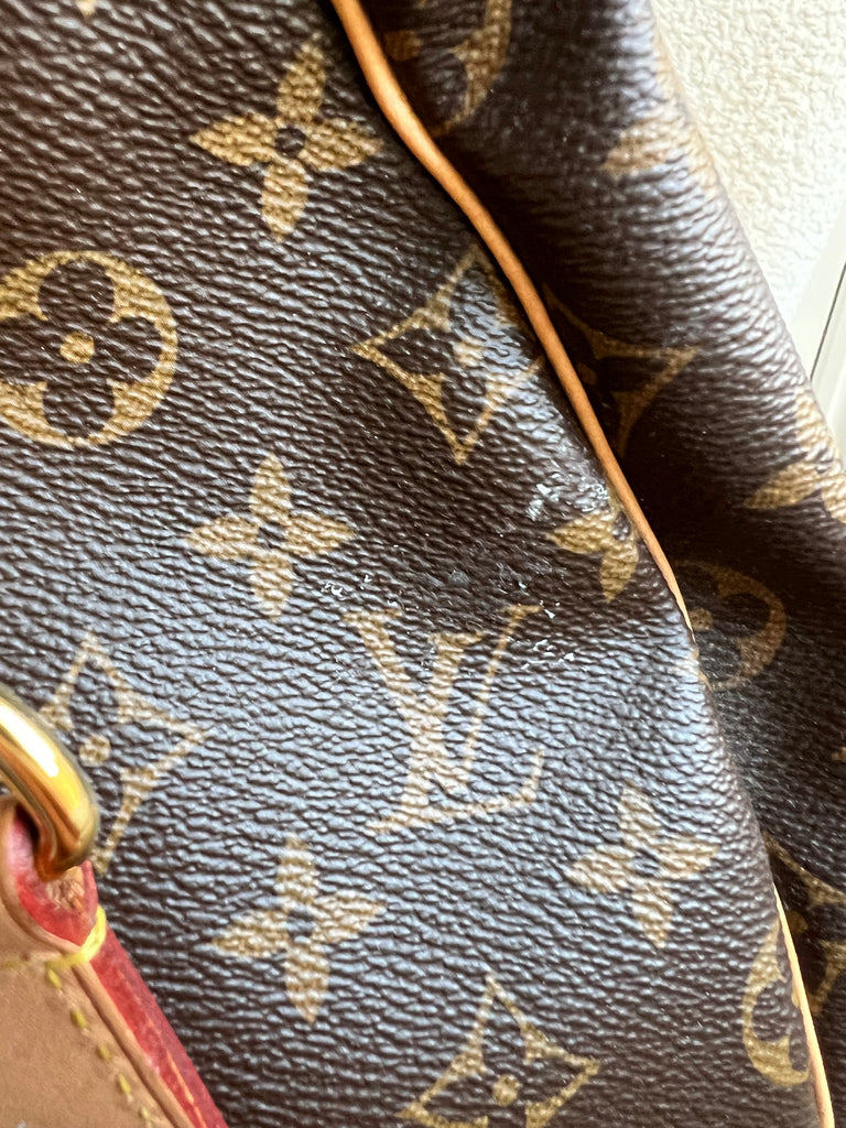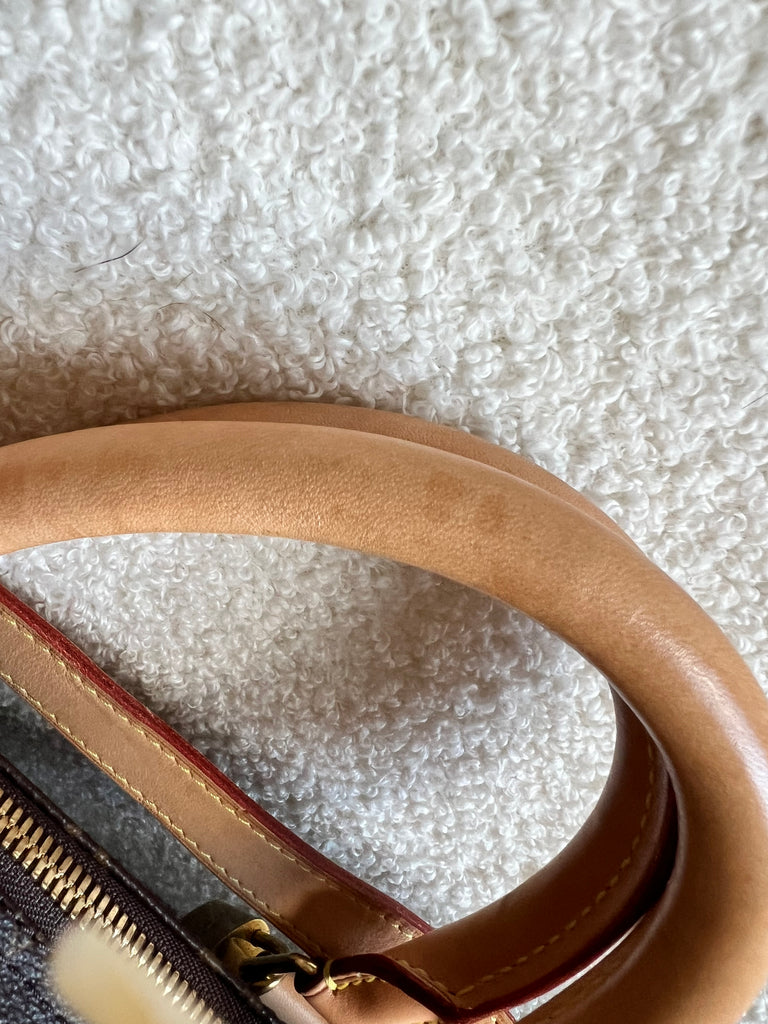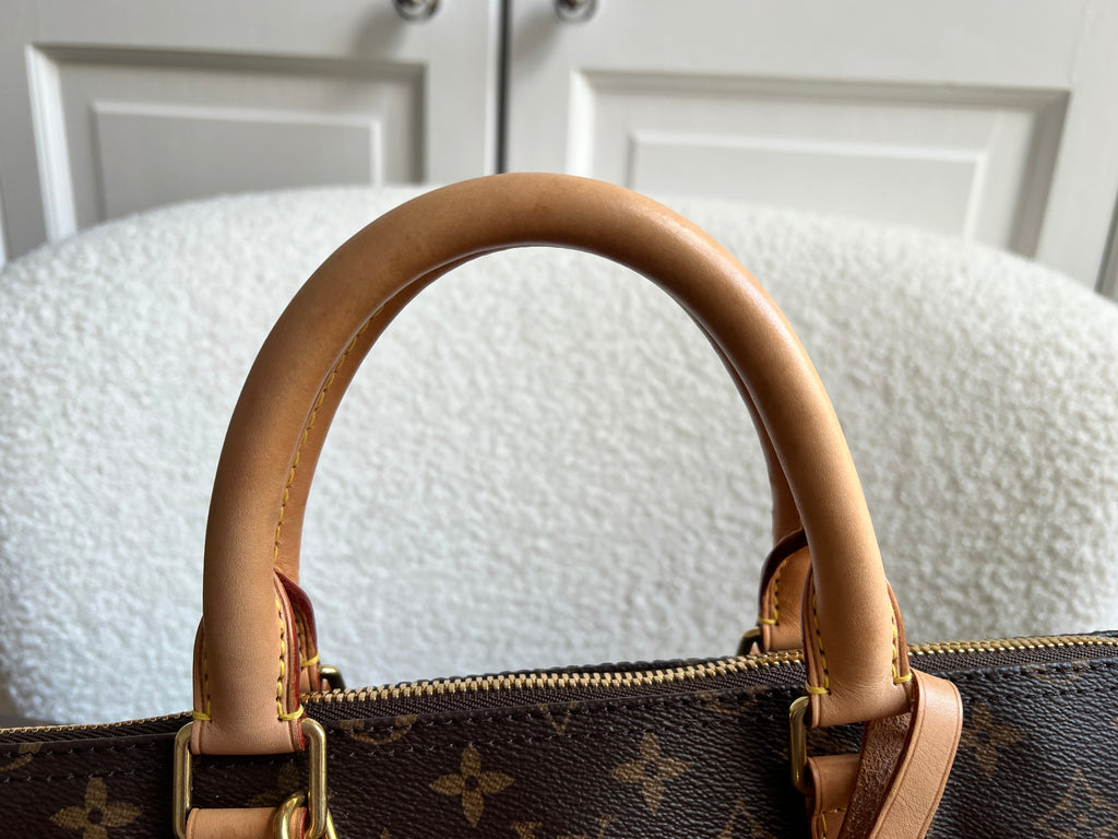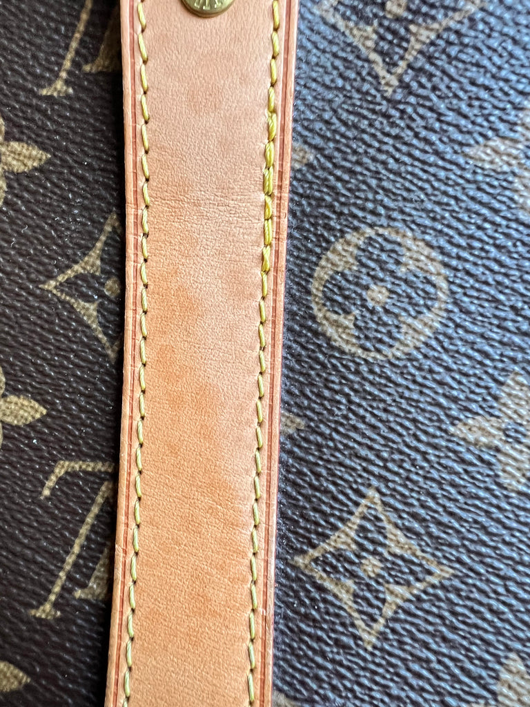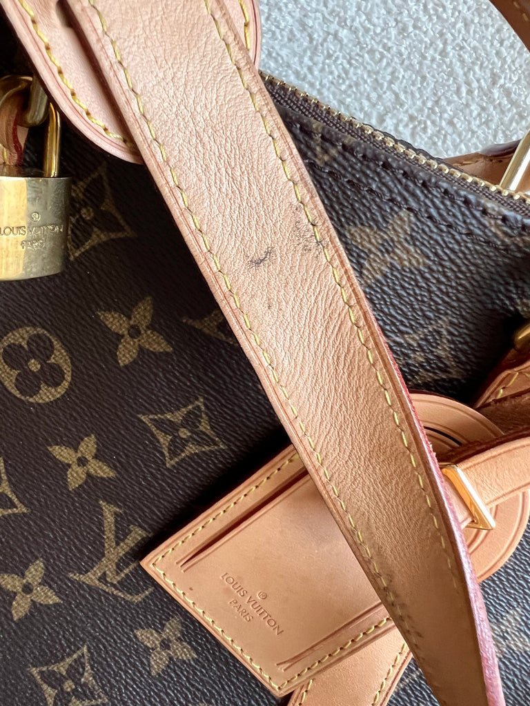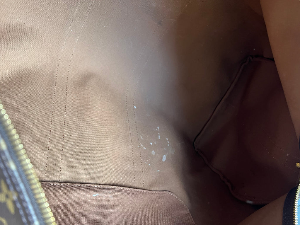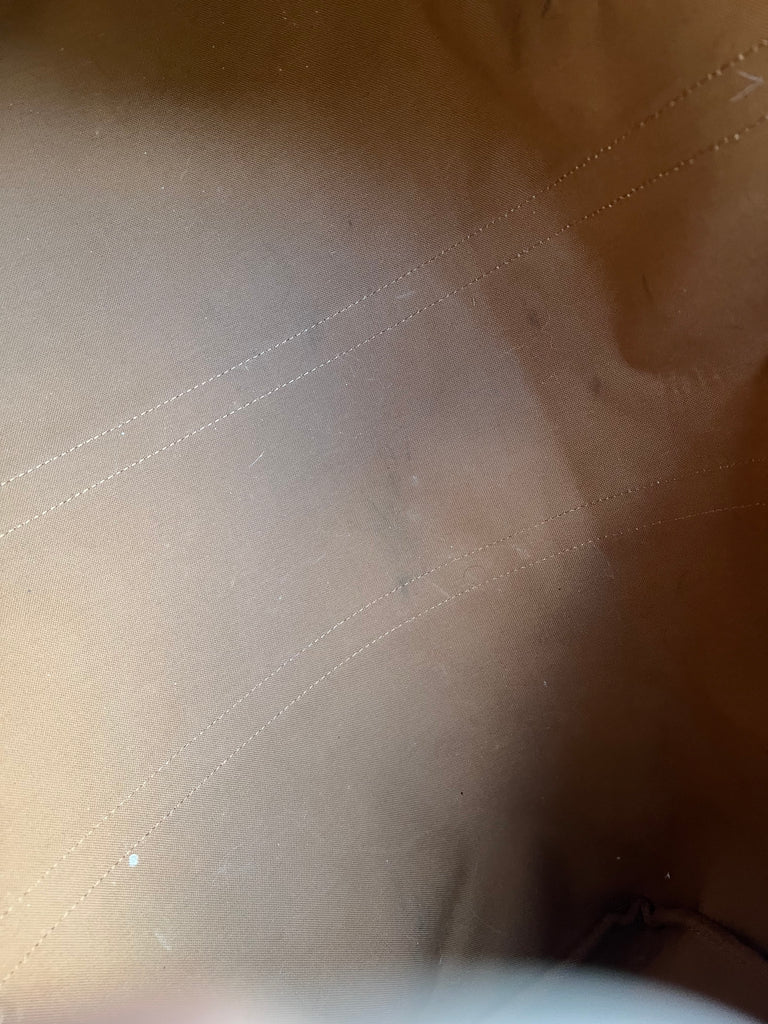 Exterior: Overall good to very good condition with some general signs of wear. Some darkening / watermarks to leather sections as pictured. Small marks to the canvas. Some general marks to handles and strap.