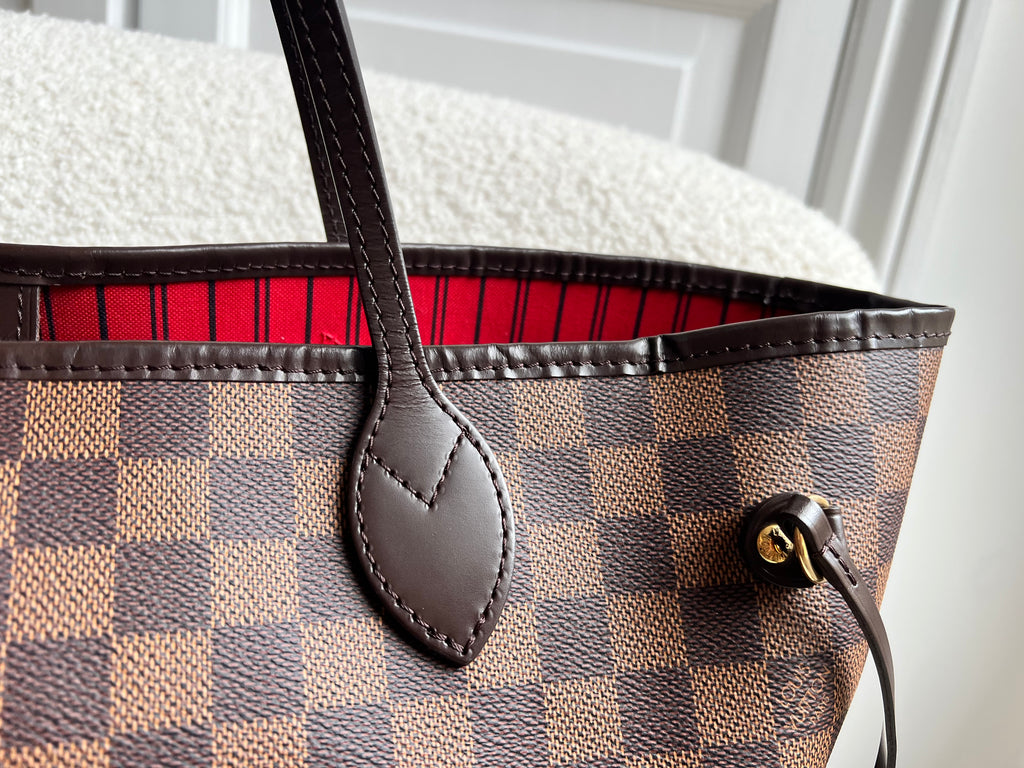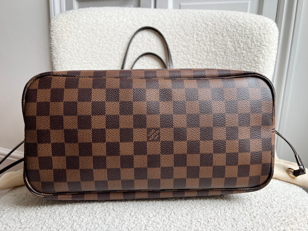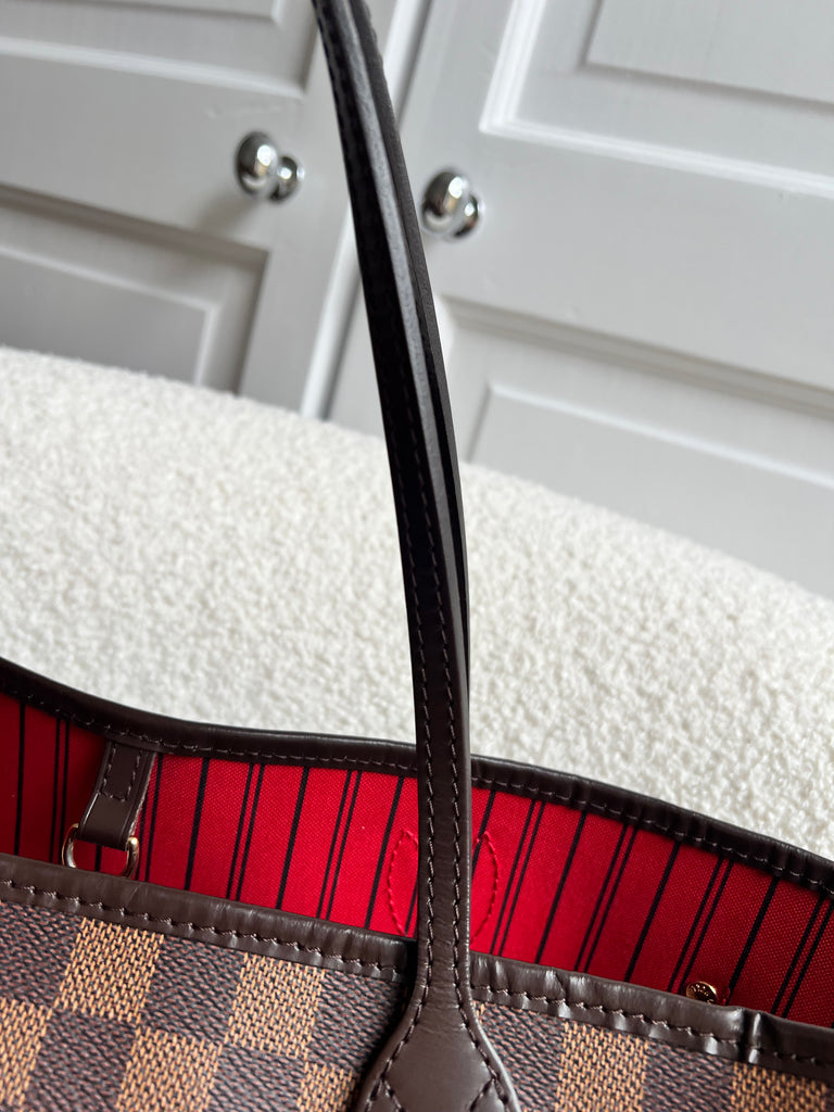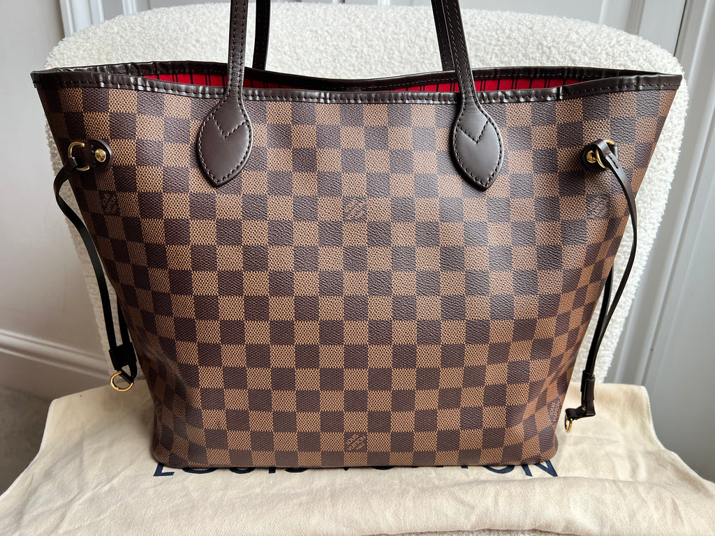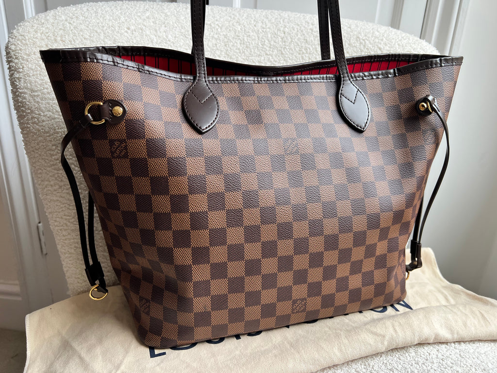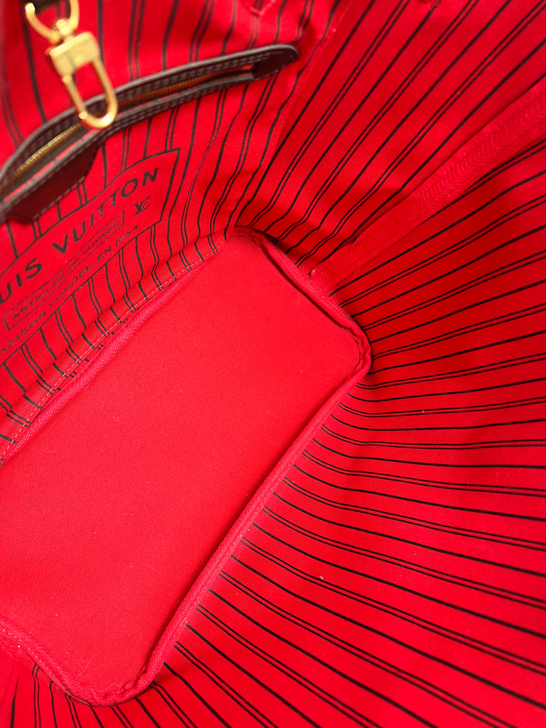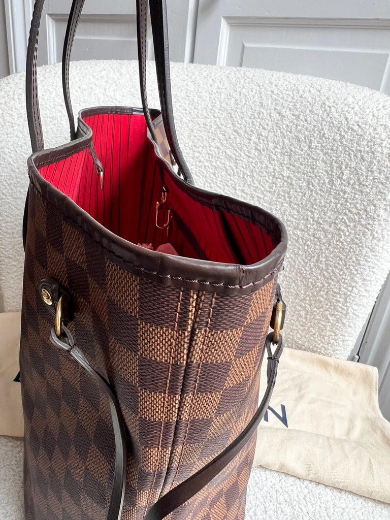 Louis Vuitton Neverfull MM in Damier Ebene with Cherry Red Lining. The "middle" size of the Neverfull, this one of Louis Vuitton's most popular style, if not the most popular. Both trendy and chic, ideal for day to day or work use especially as the coated canvas is durable and resilient. Slightly slouchy in shape, this bag can be carried in the crook of the arm or comfortably over shoulder. Note that this item does not come with the removable clutch pouch.