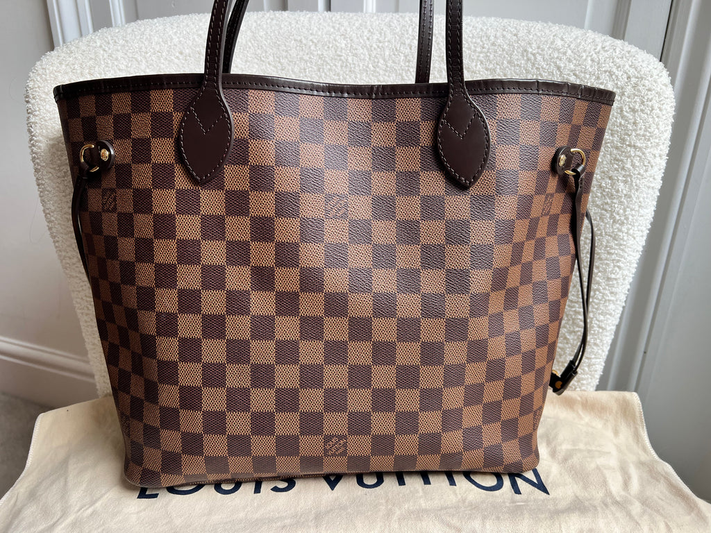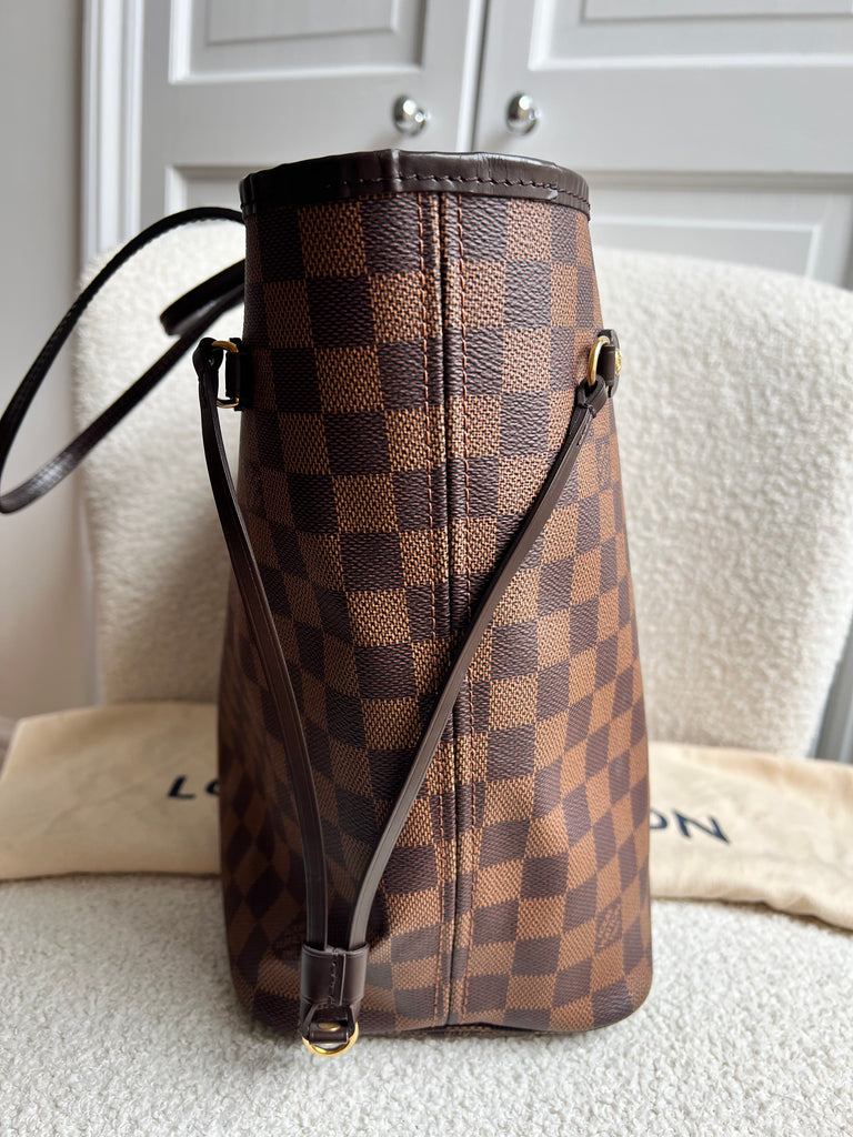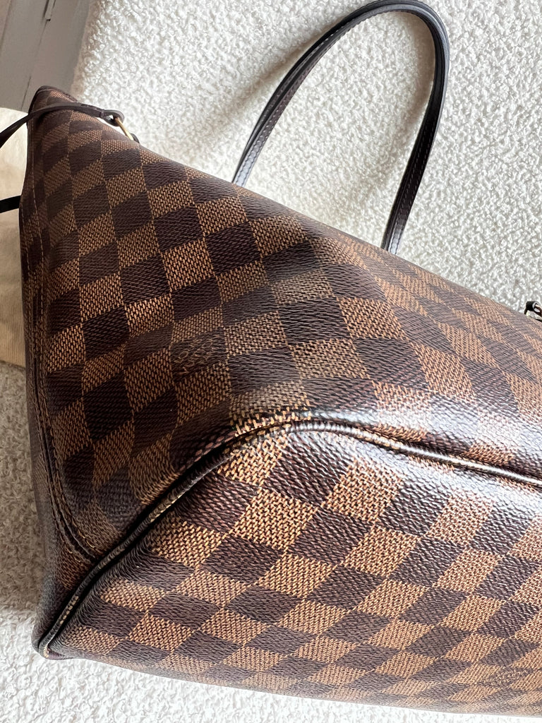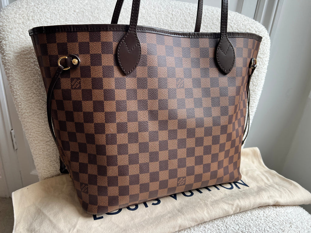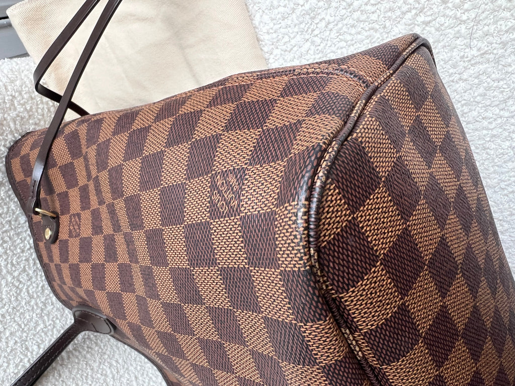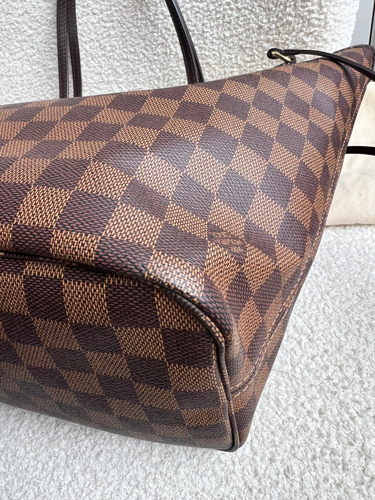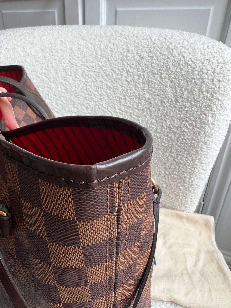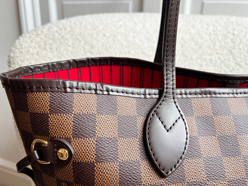 Louis Vuitton Neverfull MM in Damier Ebene with Cherry Red Lining. The "middle" size of the Neverfull, this one of Louis Vuitton's most popular style, if not the most popular. Both trendy and chic, ideal for day to day or work use especially as the coated canvas is durable and resilient. Slightly slouchy in shape, this bag can be carried in the crook of the arm or comfortably over shoulder. Note that this item does not come with the removable clutch pouch.