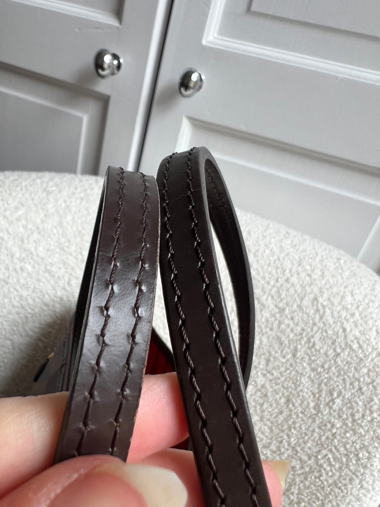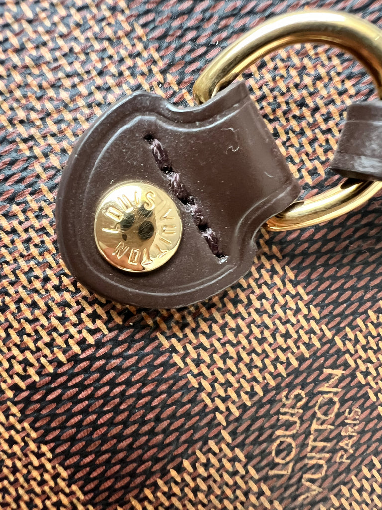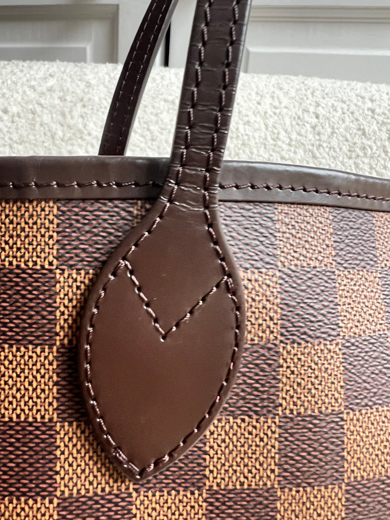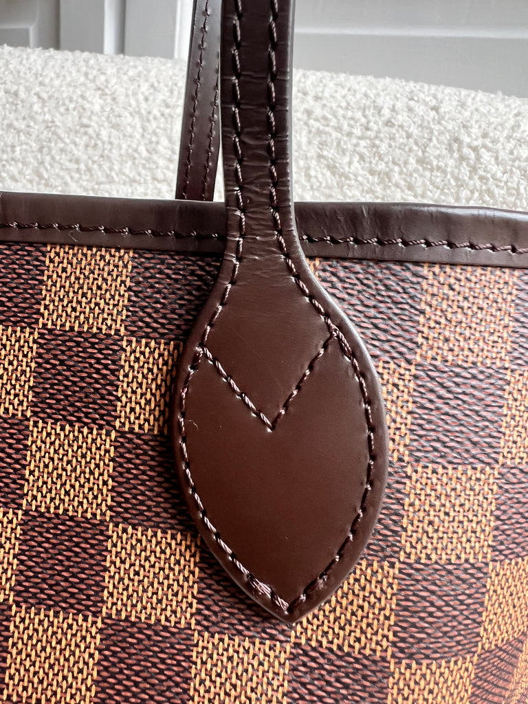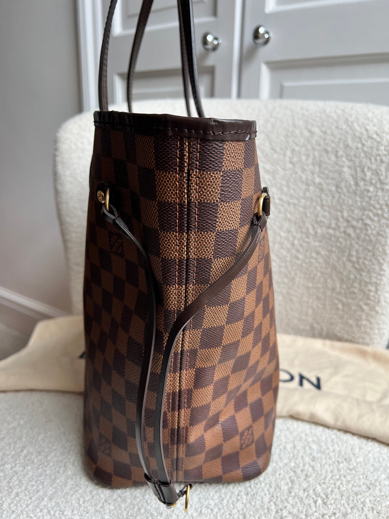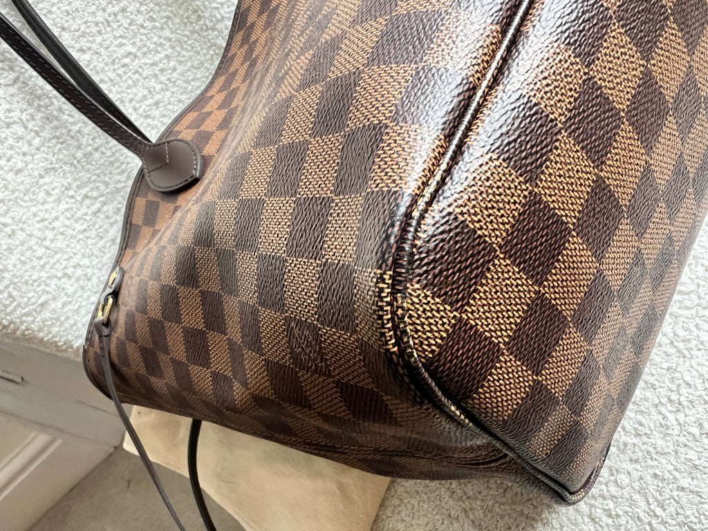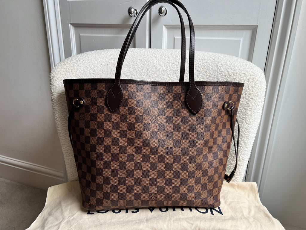Louis Vuitton Neverfull MM in Damier Ebene with Cherry Red Lining. The "middle" size of the Neverfull, this one of Louis Vuitton's most popular style, if not the most popular. Both trendy and chic, ideal for day to day or work use especially as the coated canvas is durable and resilient. Slightly slouchy in shape, this bag can be carried in the crook of the arm or comfortably over shoulder. Note that this item does not come with the removable clutch pouch.