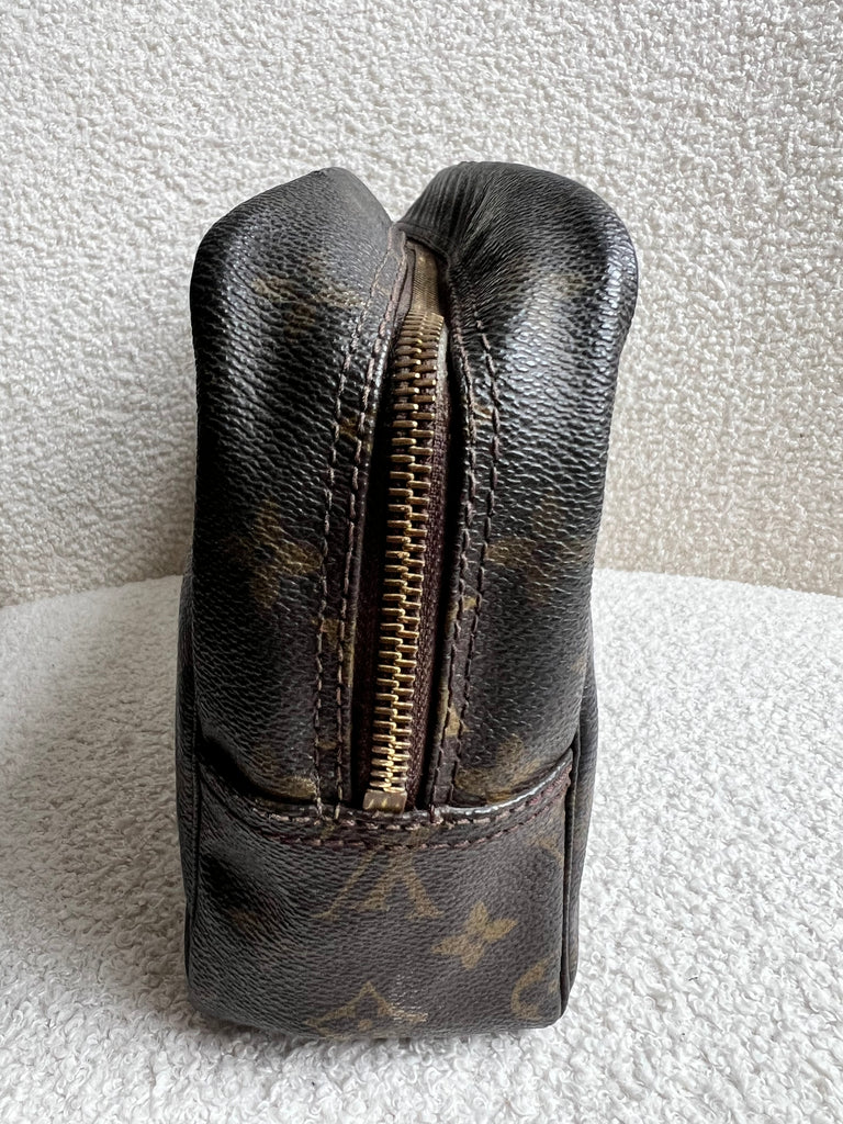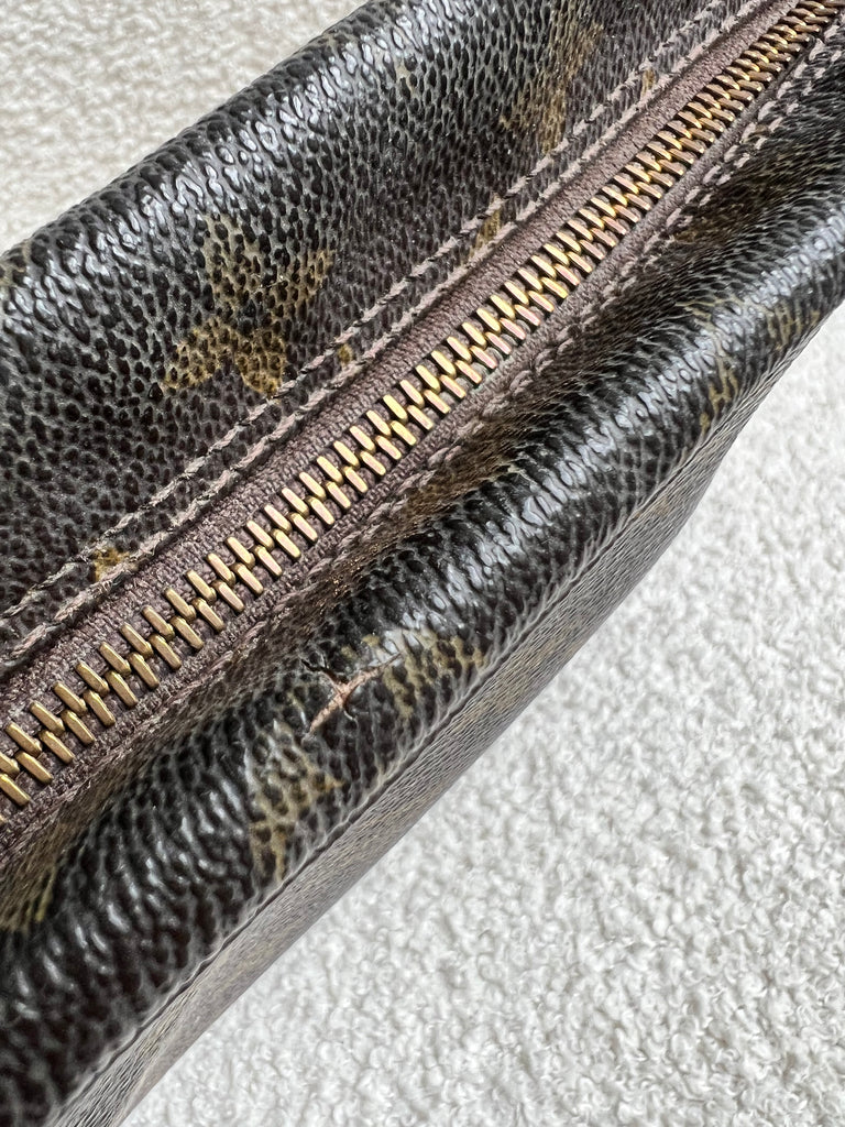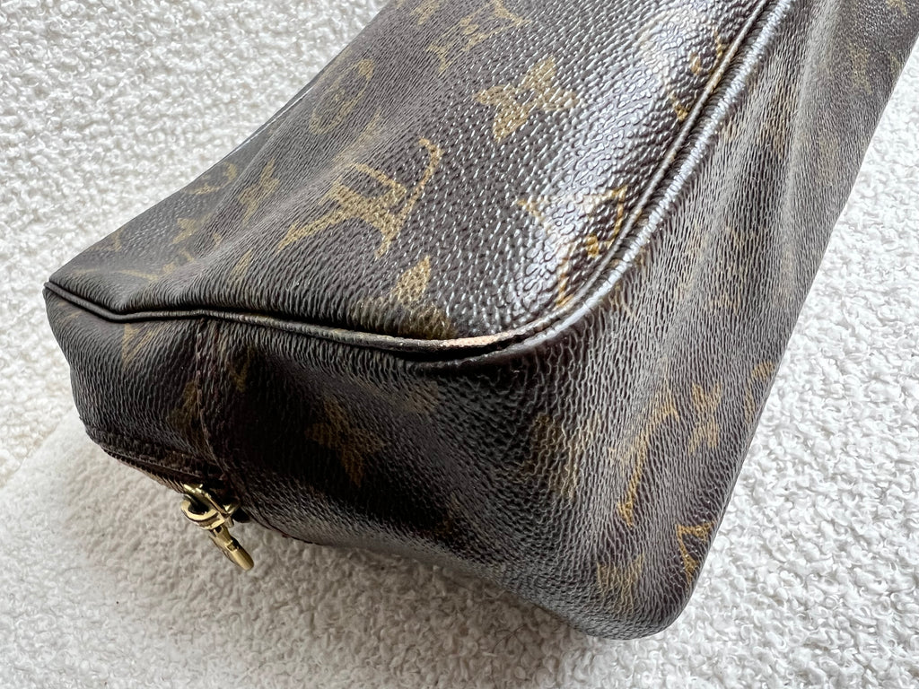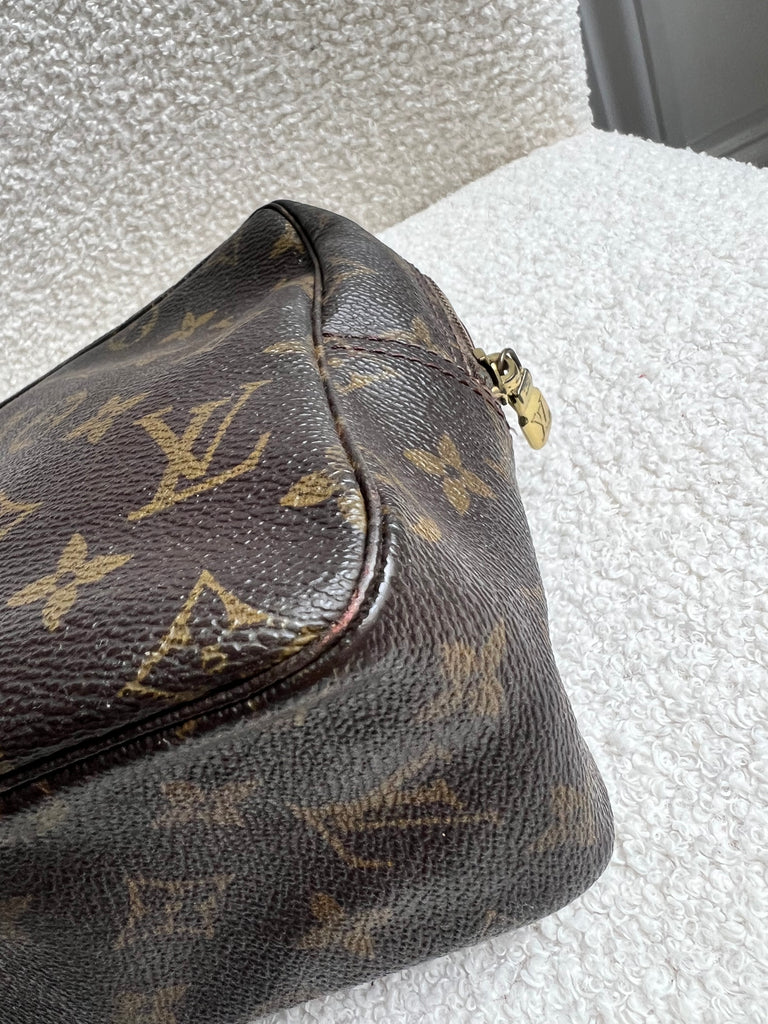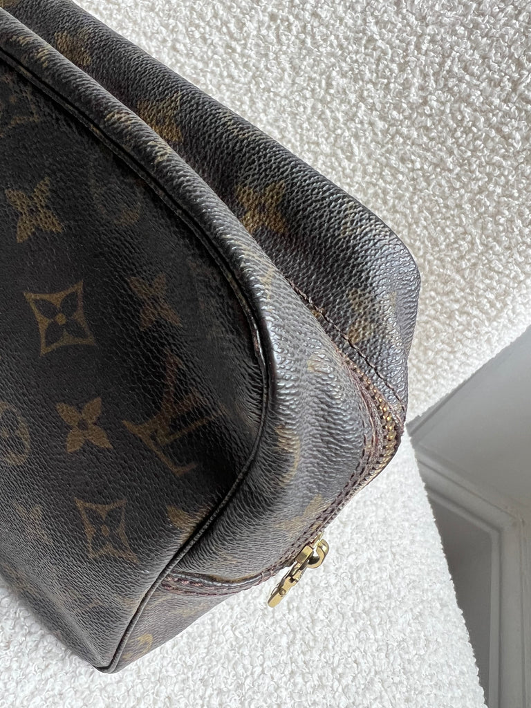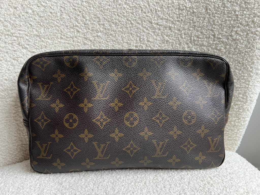 Louis Vuitton Trousse 28 in Monogram canvas with gold hardware. This large wash bag type pouch is crafted in monogram canvas and has a zipper closure. Could be used as a handheld clutch, a makeup bag or cosmetic pouch, or a smaller bag to be held inside luggage.