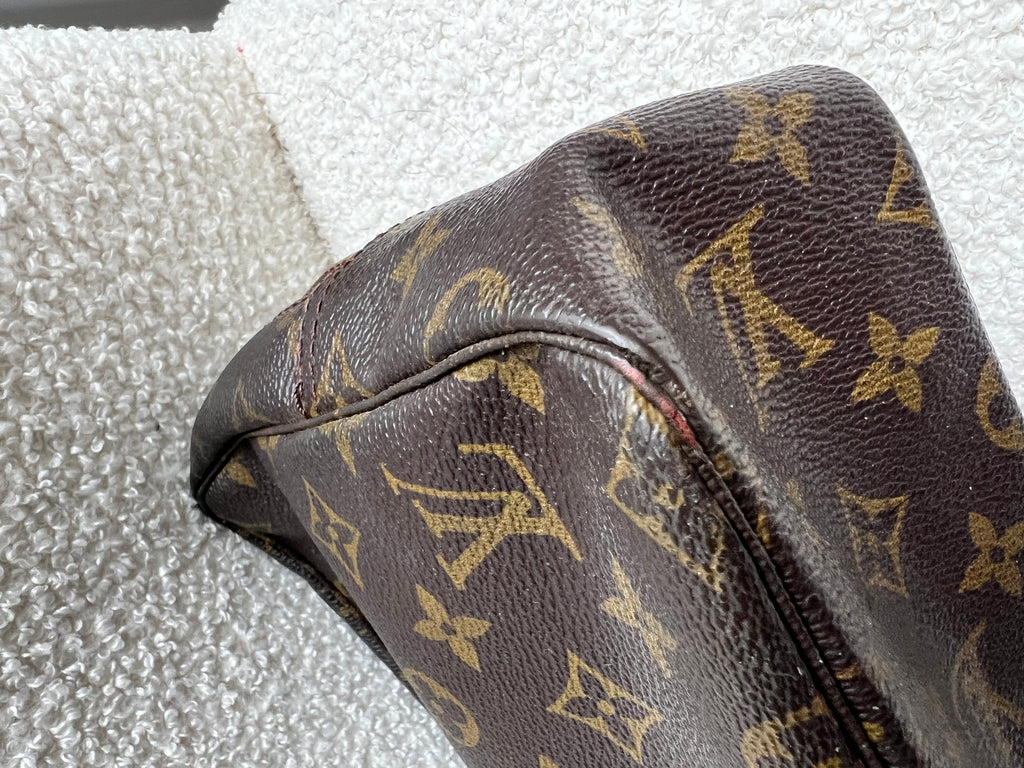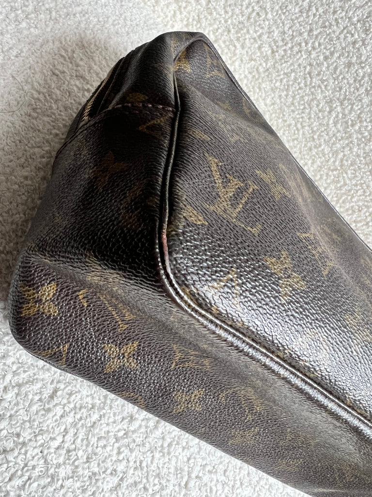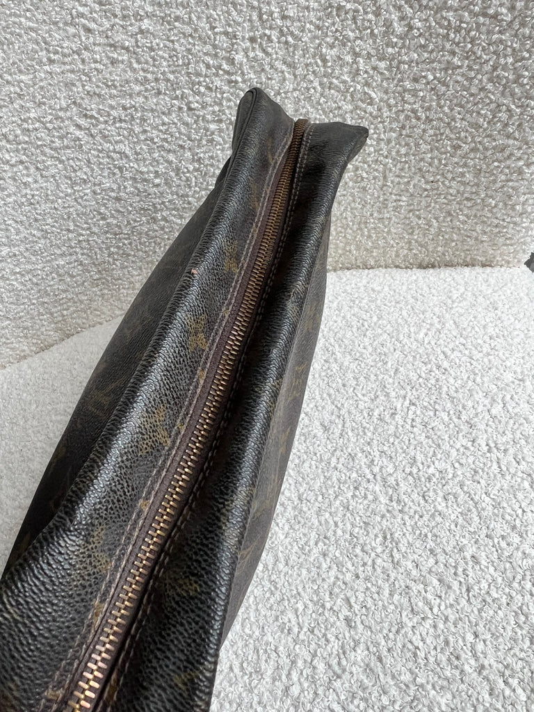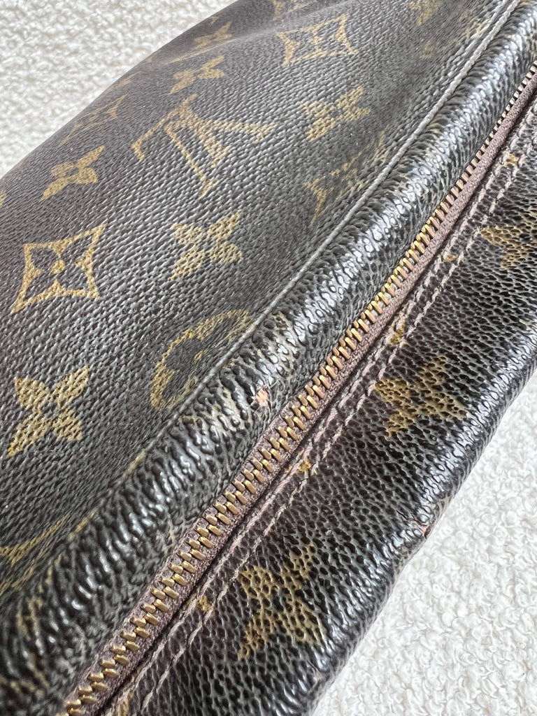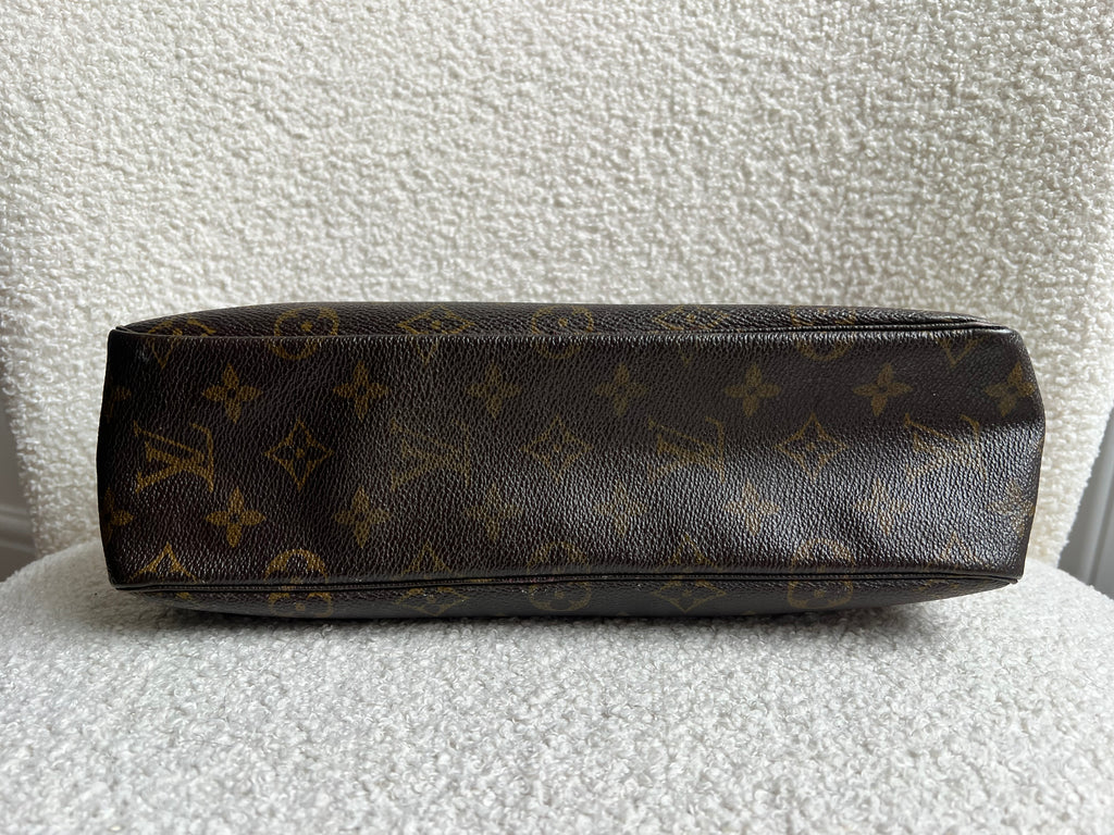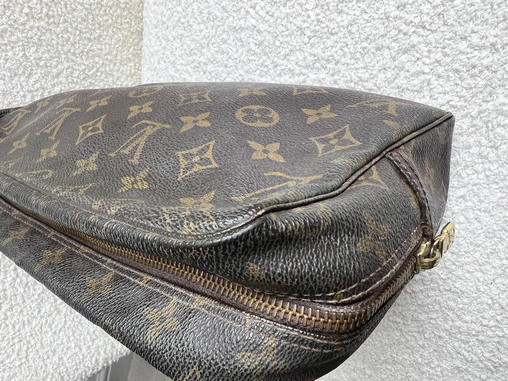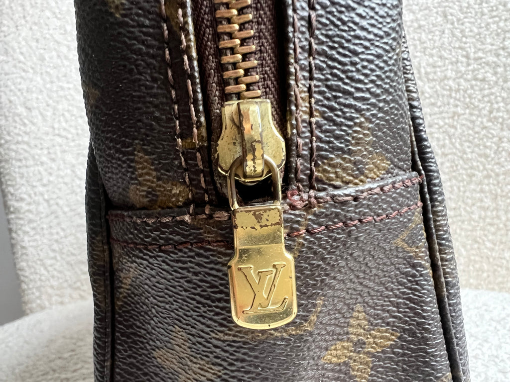 Louis Vuitton Trousse 28 in Monogram canvas with gold hardware. This large wash bag type pouch is crafted in monogram canvas and has a zipper closure. Could be used as a handheld clutch, a makeup bag or cosmetic pouch, or a smaller bag to be held inside luggage.