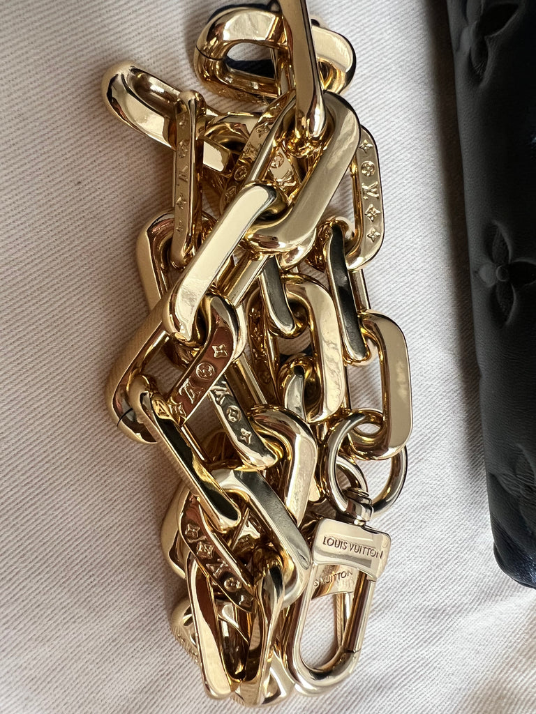 Louis Vuitton Coussin PM in Black Monogram-embossed puffy lambskin with gold hardware. The pillow-like Coussin bag brings style to the most simple look, giving it an effortless fashion-forward allure. Practice in size and style, it can be worn cross-body with the strap, is a chain baguette or comfortably carried under arm.