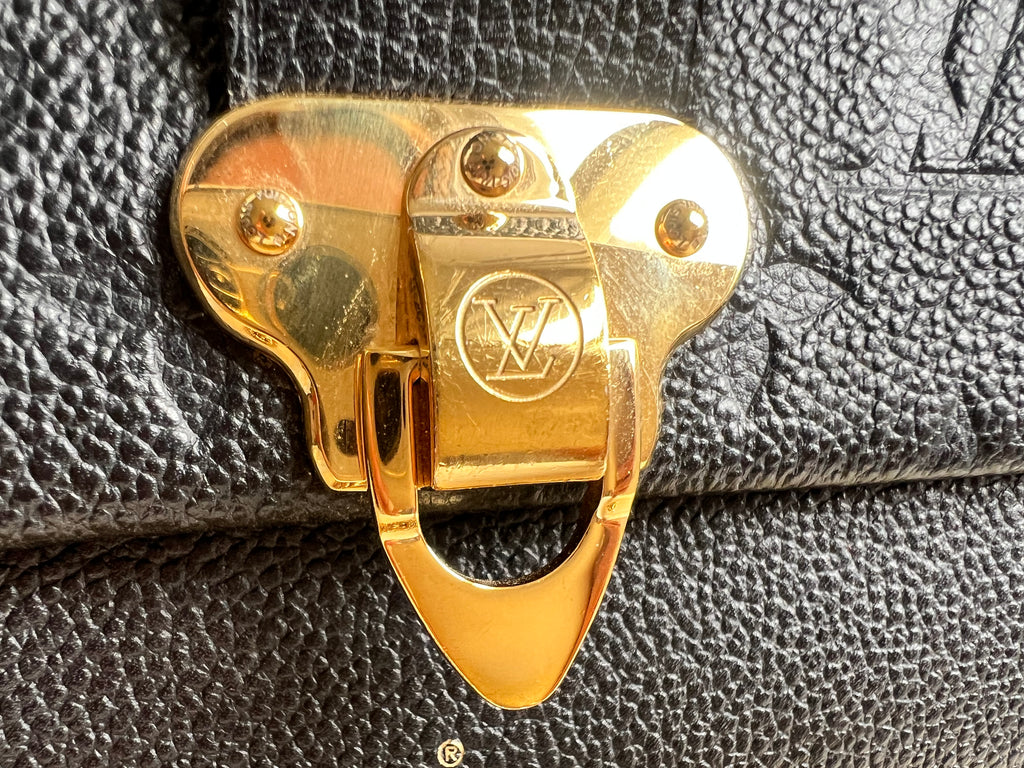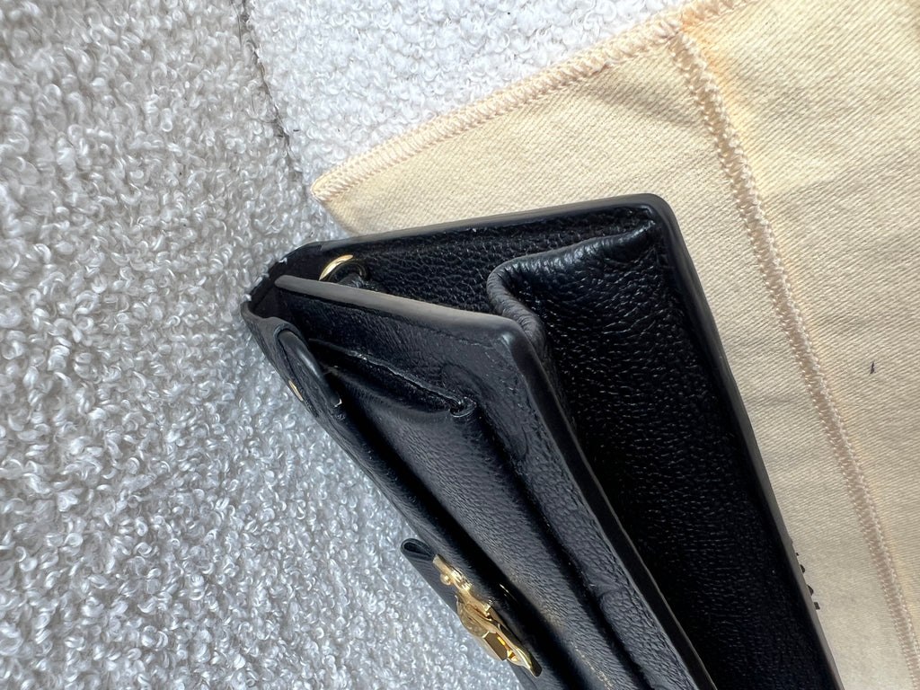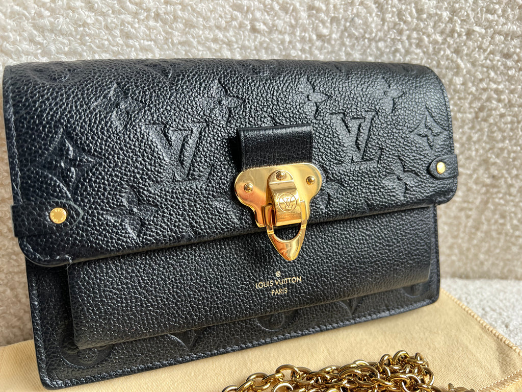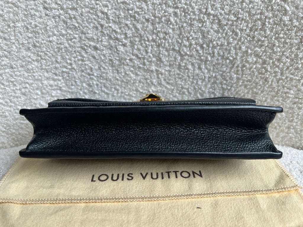 Louis Vuitton Vavin Wallet on Chain in Black Monogram Empreinte with gold hardware. Reasonable in size for a WOC and both sophisticated and classy. Perfect for evening or event wear. The front pocket, fits a phone, while the inside pockets hold all the essentials. Featuring LV trunk inspired lock closure. Can be worn over shoulder or cross body.