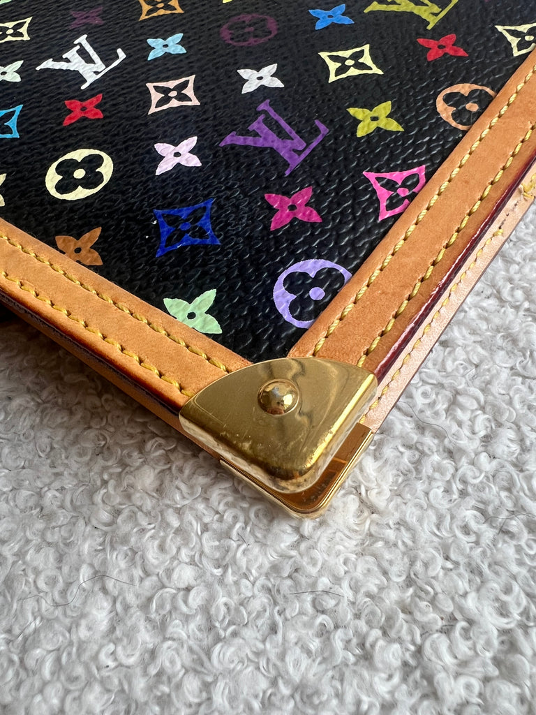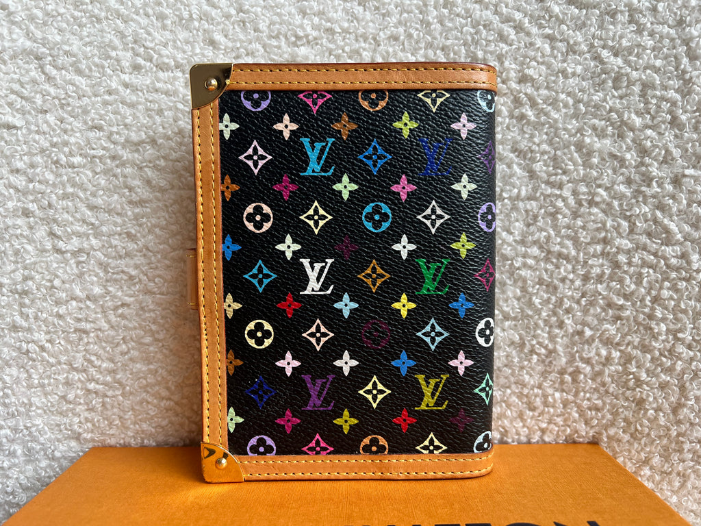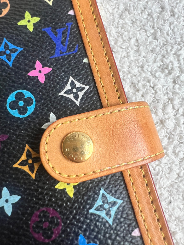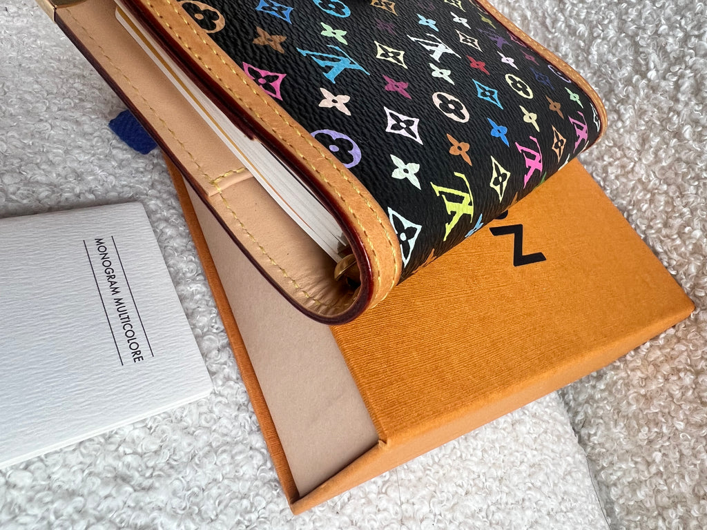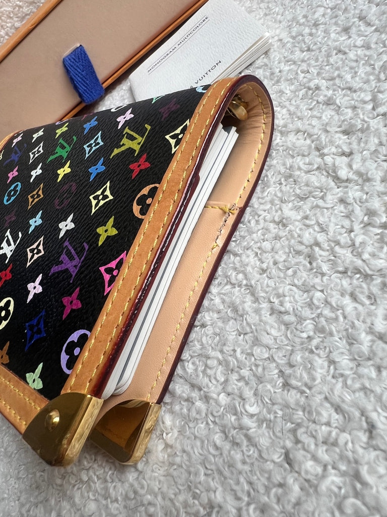Louis Vuitton Agenda PM in Black Multicolore Monogram Canvas with gold hardware. This is part of the popular Takashi Murakami collaboration. This agenda cover comes with some non branded 2023 insets. Comes with 2025 inserts. More refills and inserts can be bought at LV.