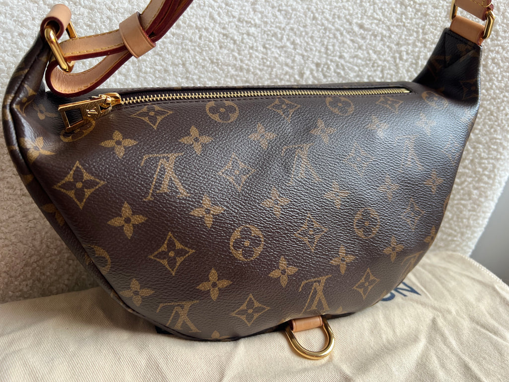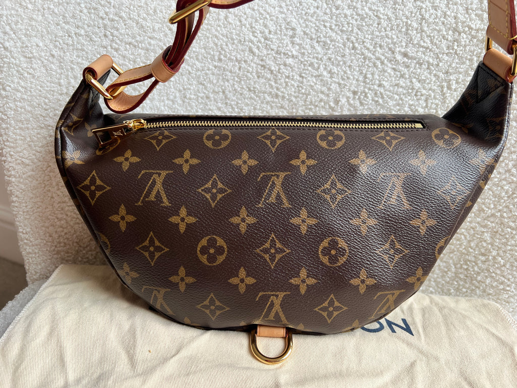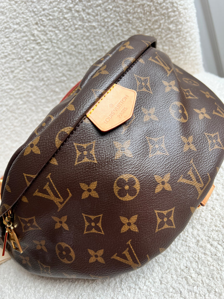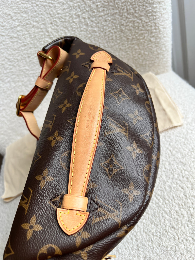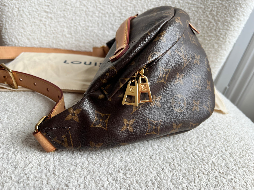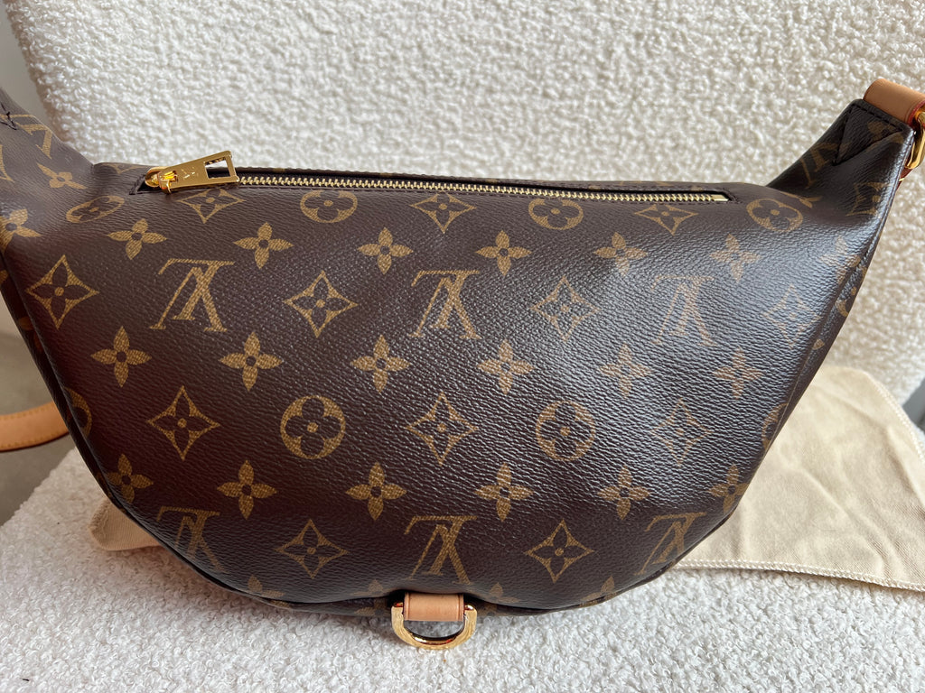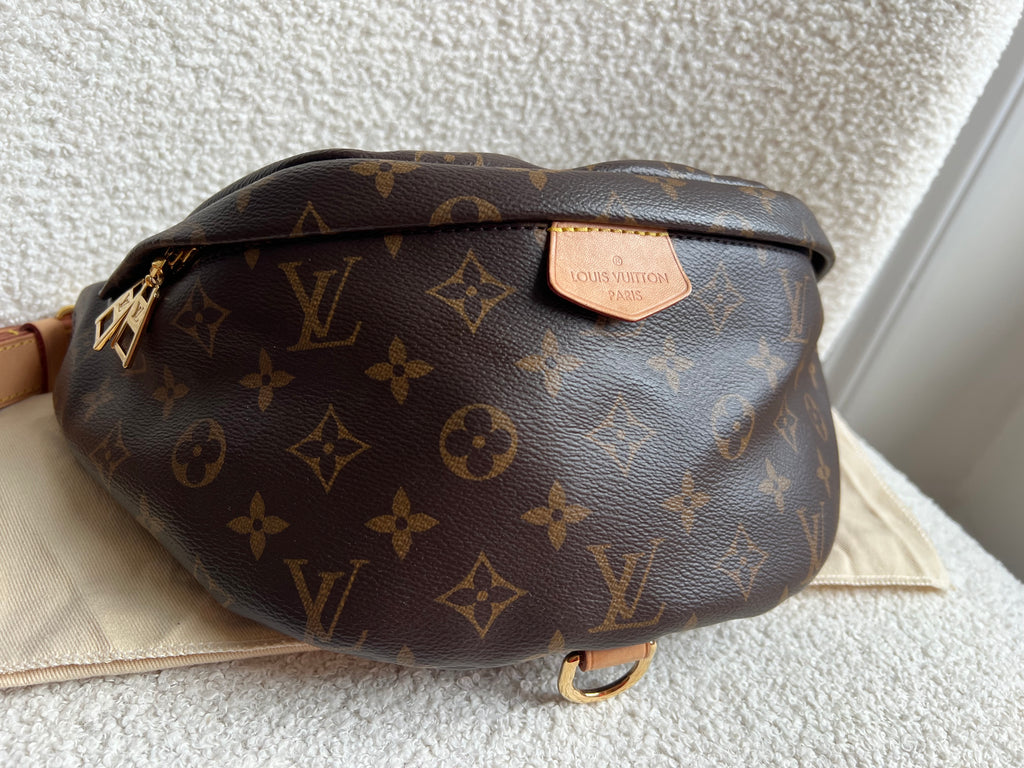 Louis Vuitton Bum Bag in Canvas Monogram with gold hardware. Fashioned in classic Monogram canvas and signed with a “Louis Vuitton Paris” leather patch, this uber-functional bumbag transforms sportwear into the very definition of casual chic. Wear it as a belt bag, cross-body or over the shoulder for a jauntier look. This highly sought after style is no longer available at LV and sells at premium usually. 2020 year.