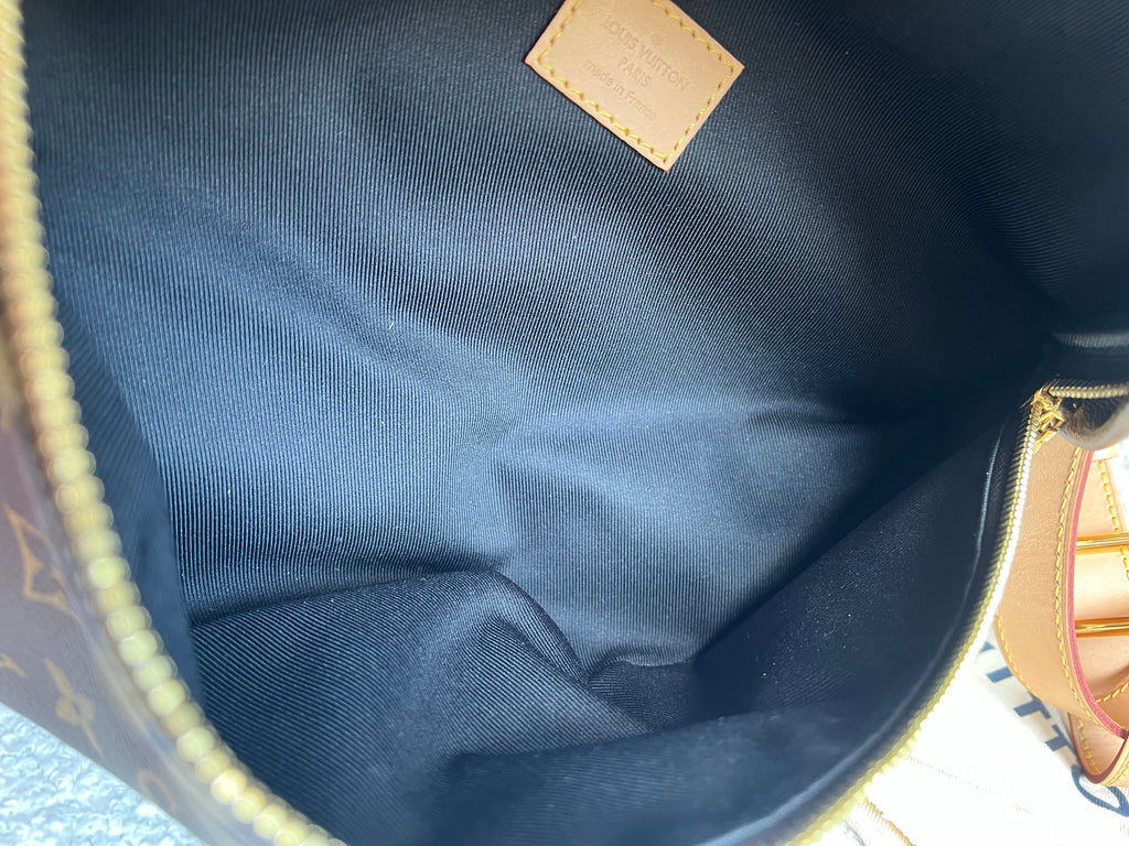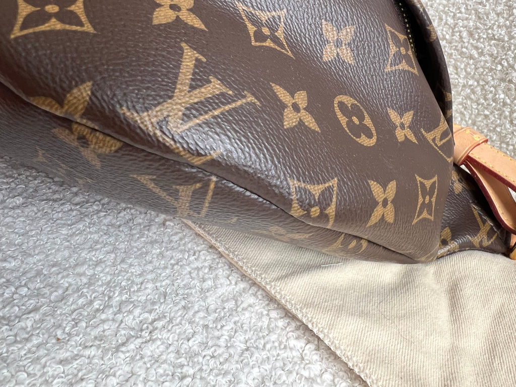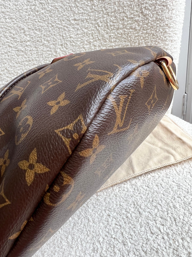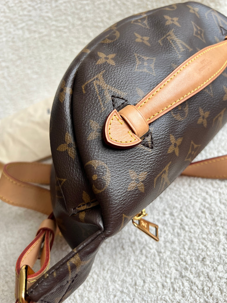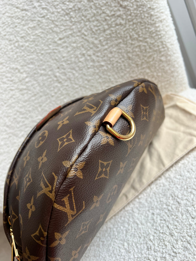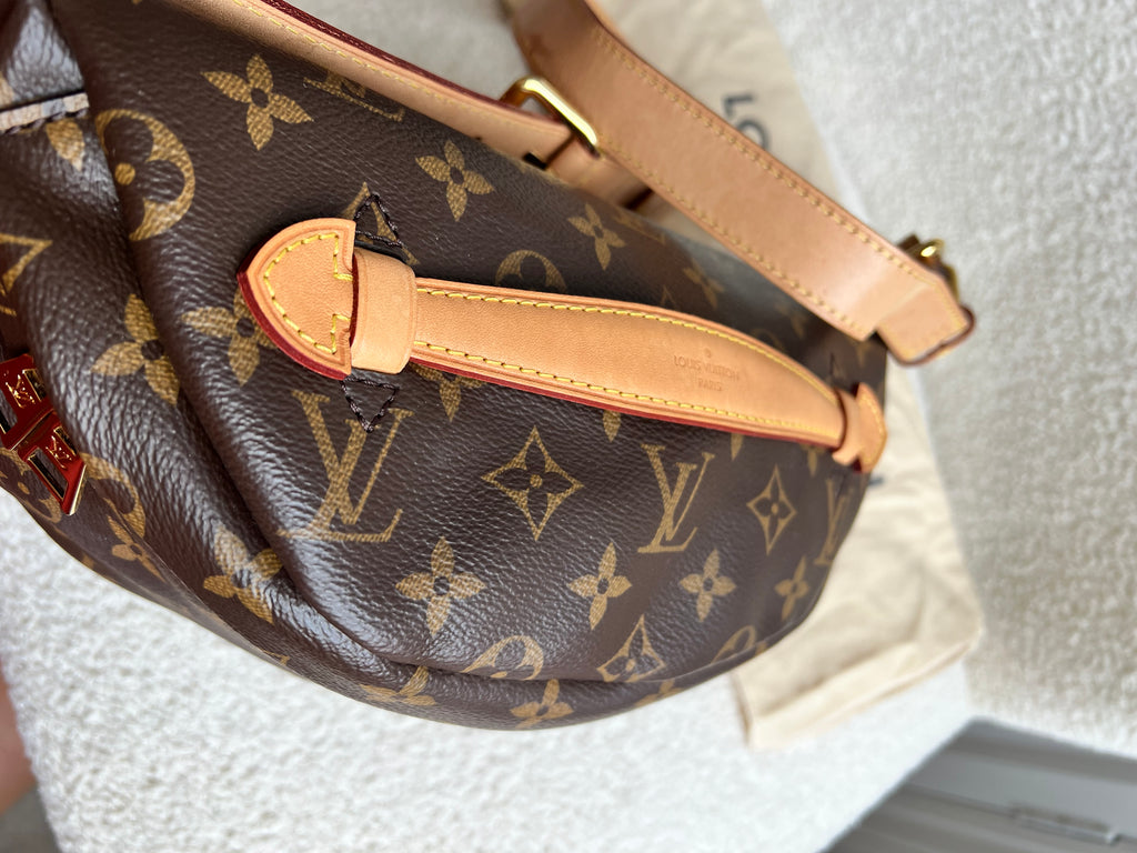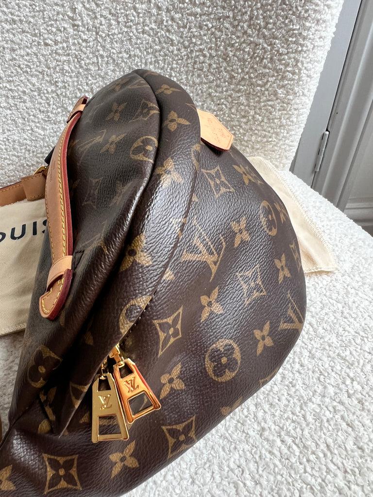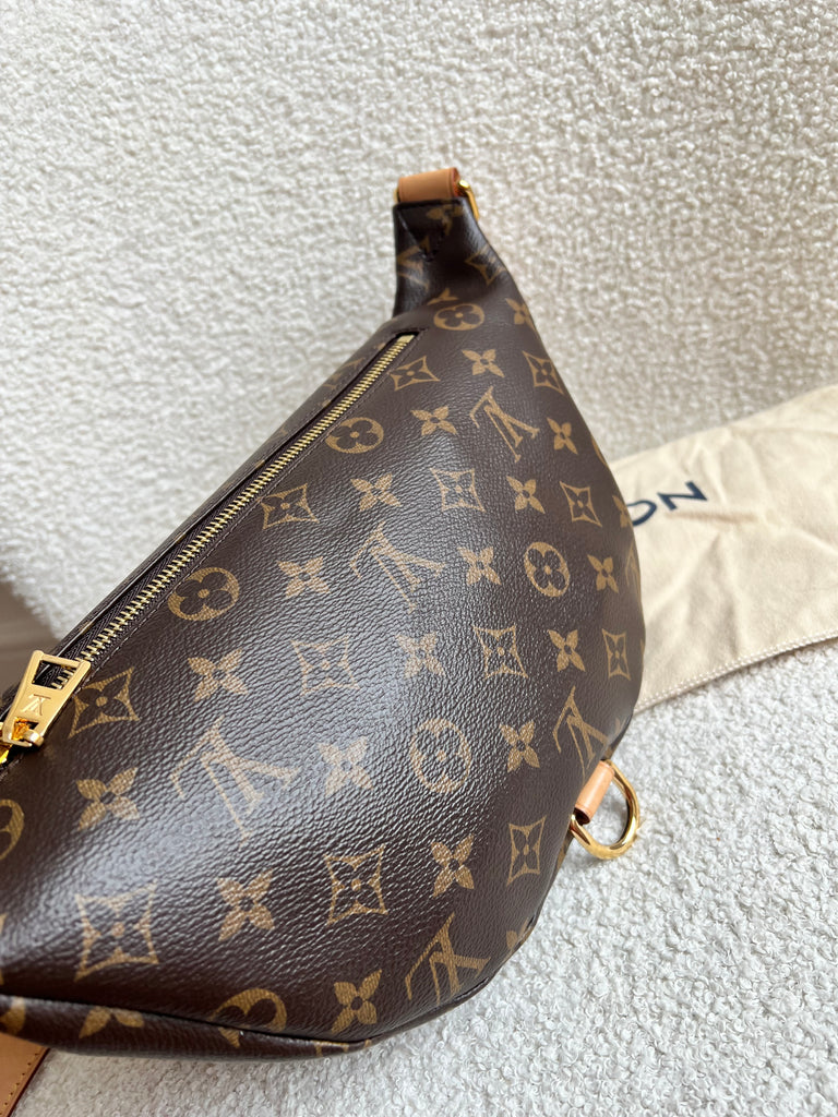 Louis Vuitton Bum Bag in Canvas Monogram with gold hardware. Fashioned in classic Monogram canvas and signed with a “Louis Vuitton Paris” leather patch, this uber-functional bumbag transforms sportwear into the very definition of casual chic. Wear it as a belt bag, cross-body or over the shoulder for a jauntier look. This highly sought after style is no longer available at LV and sells at premium usually. 2020 year.