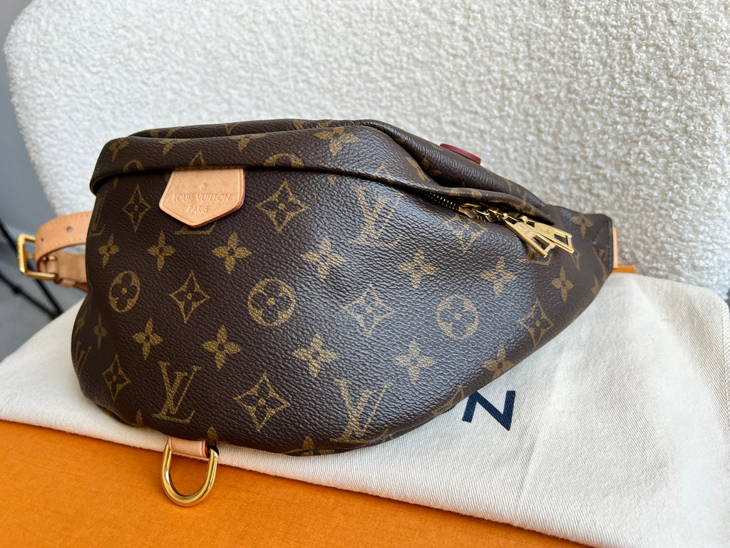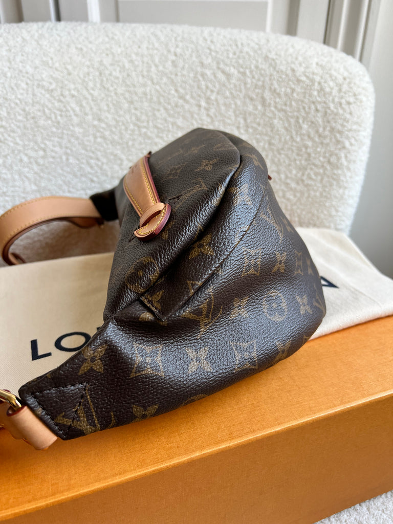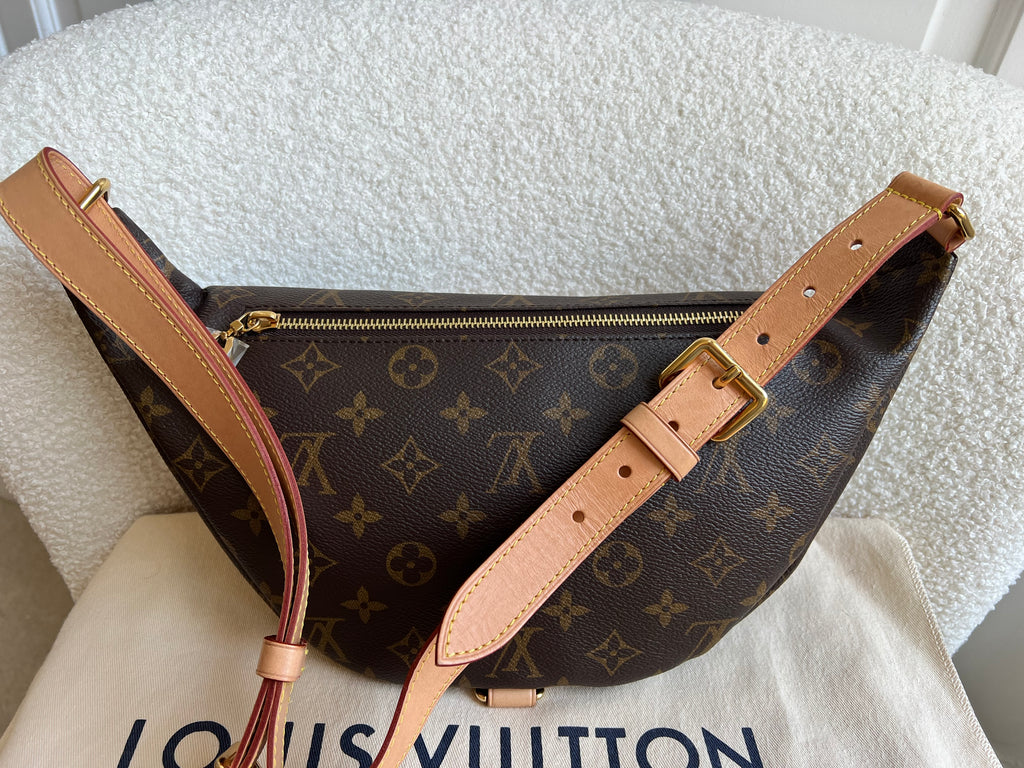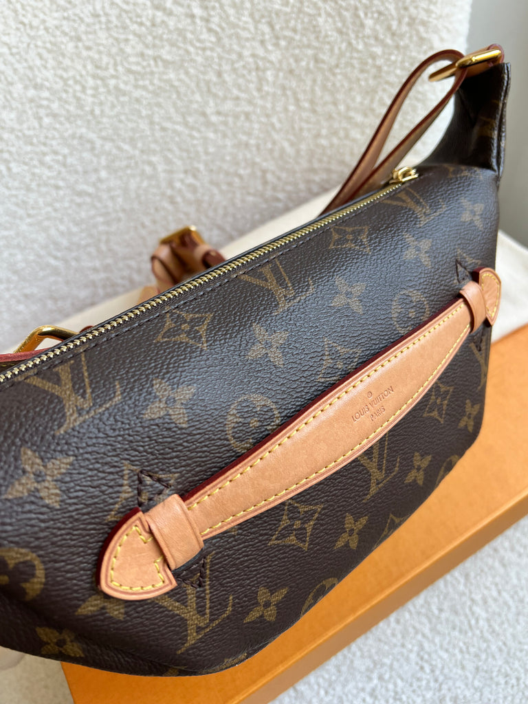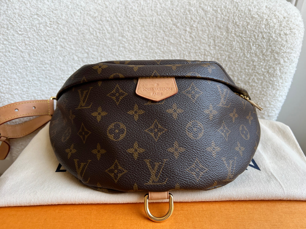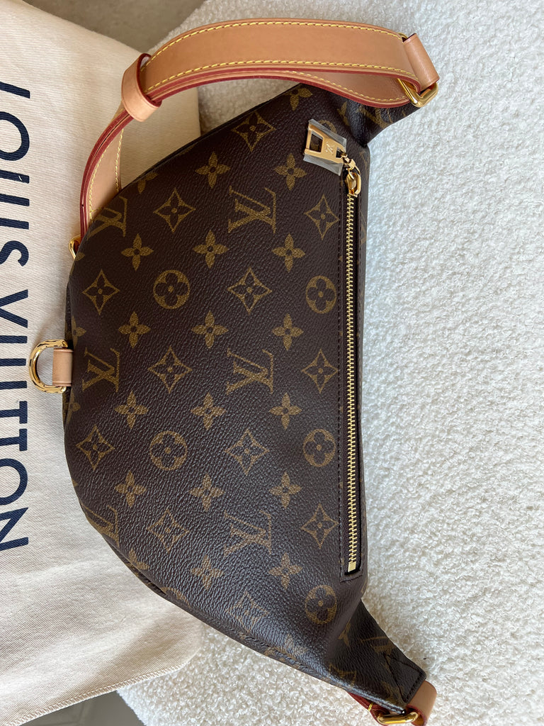 Louis Vuitton Bum Bag in Canvas Monogram with gold hardware. Fashioned in classic Monogram canvas and signed with a “Louis Vuitton Paris” leather patch, this uber-functional bumbag transforms sportwear into the very definition of casual chic. Wear it as a belt bag, cross-body or over the shoulder for a jauntier look. This highly sought after style is no longer available at LV and sells at premium usually. 2020 year.