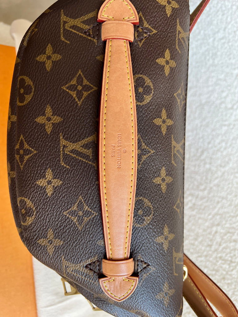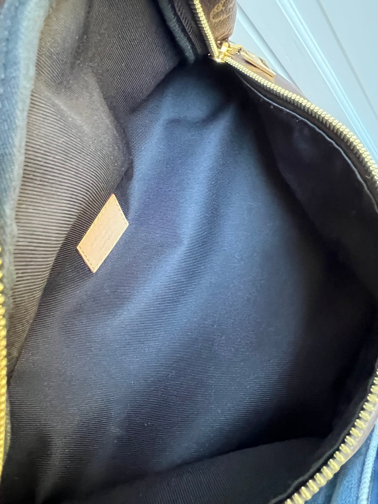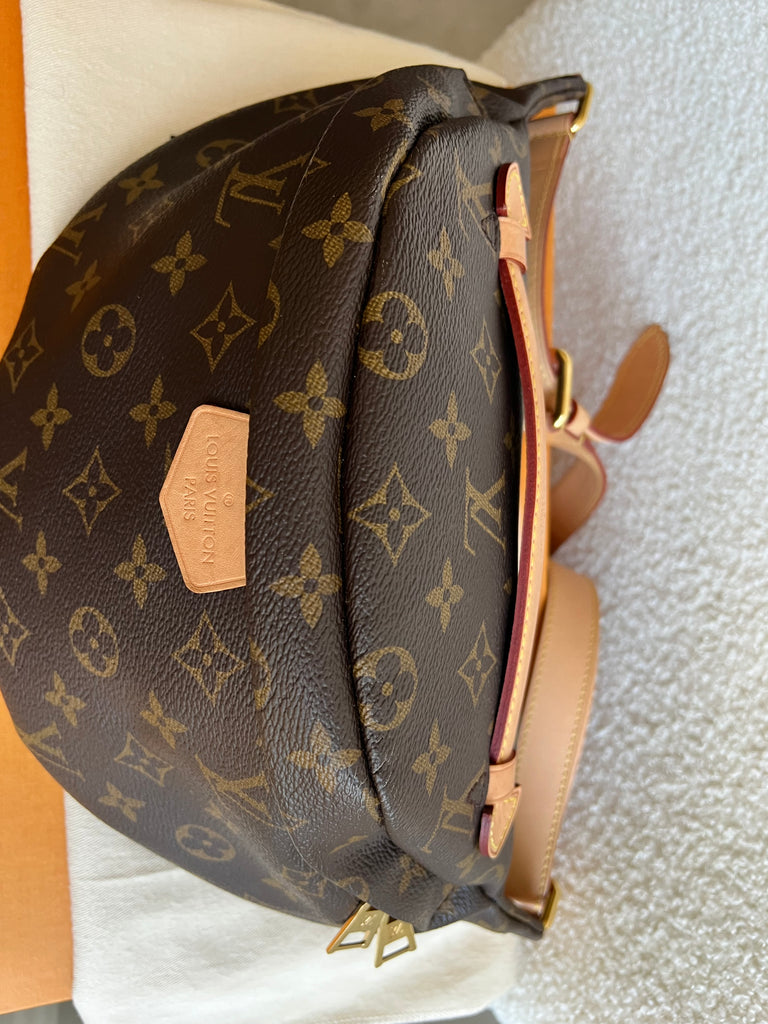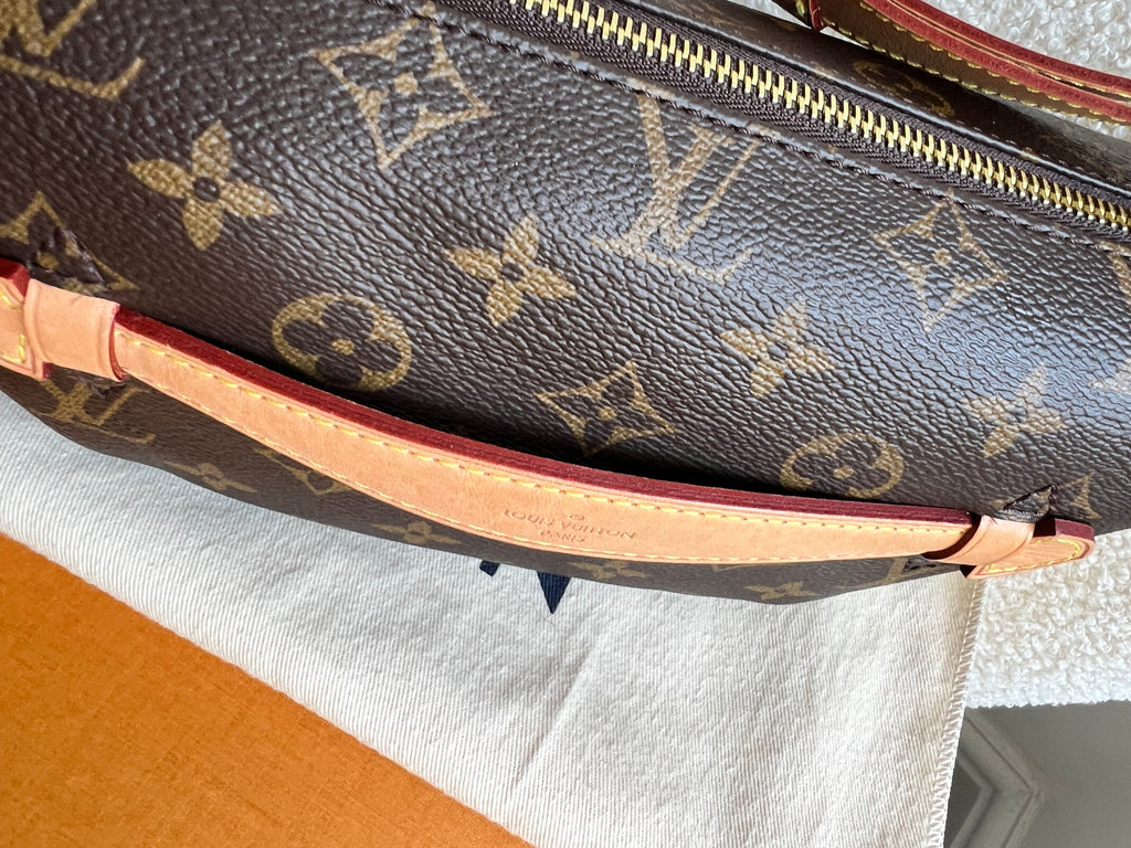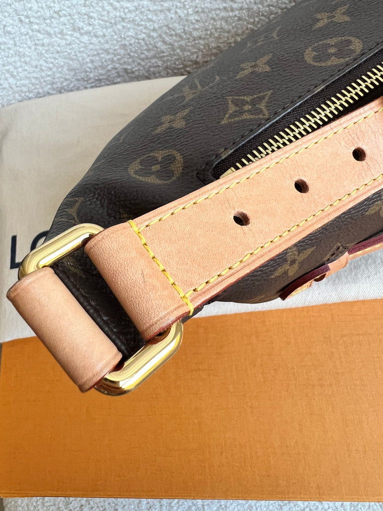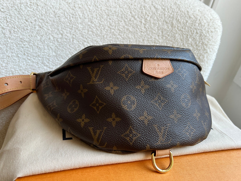 Louis Vuitton Bum Bag in Canvas Monogram with gold hardware. Fashioned in classic Monogram canvas and signed with a “Louis Vuitton Paris” leather patch, this uber-functional bumbag transforms sportwear into the very definition of casual chic. Wear it as a belt bag, cross-body or over the shoulder for a jauntier look. This highly sought after style is no longer available at LV and sells at premium usually. 2020 year.