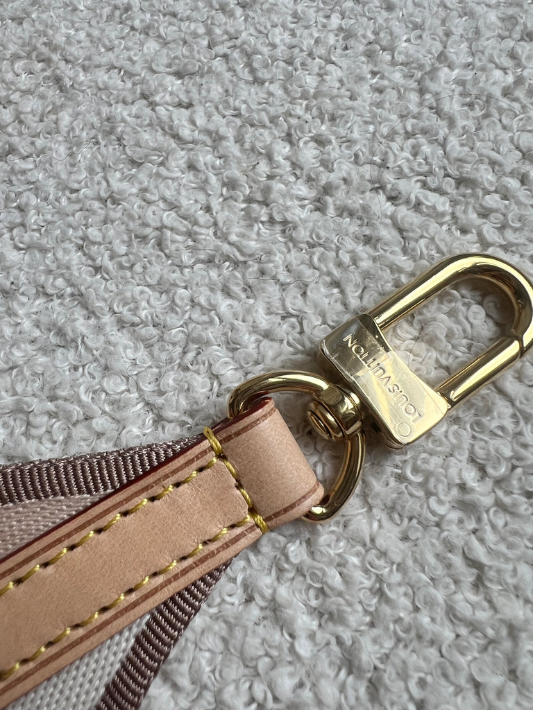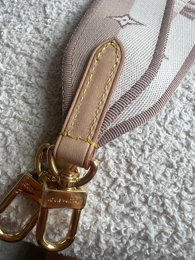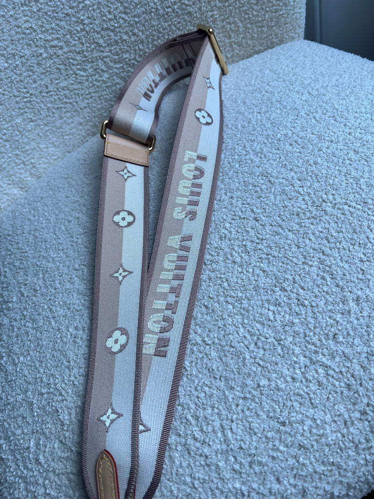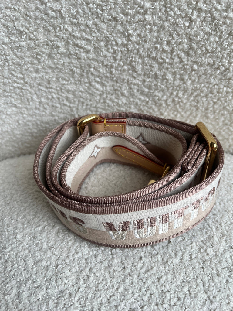Louis Vuitton Bandouliere in cream/beige with gold hardware. The Jacquard Strap can be attached to many Louis Vuitton bags and adjusted for different carry options. Woven with the House signature. The strap is crafted from hard-wearing nylon, complemented by gold-tone hardware.