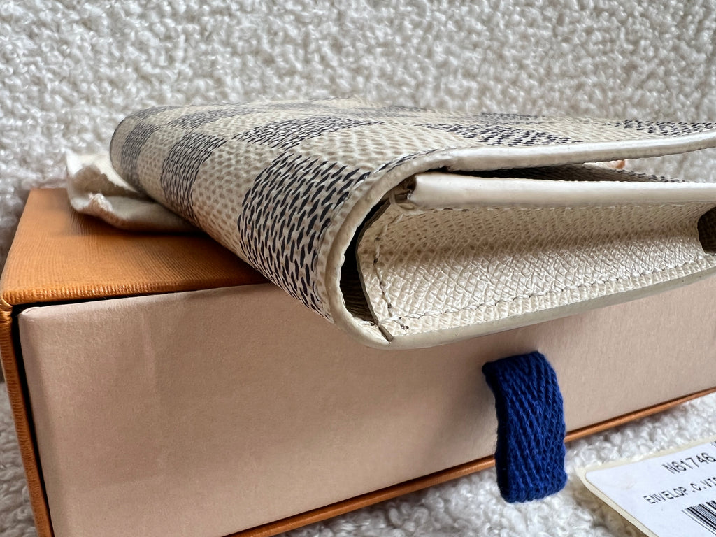 Louis Vuitton Carte de Visite Holder in Damier Azur canvas. In Damie Azur coated canvas, the slim and refined Enveloppe Carte de Visite slips effortlessly into any pocket or bag. Its press-stud closure ensures that your business or credit cards stay safe.
