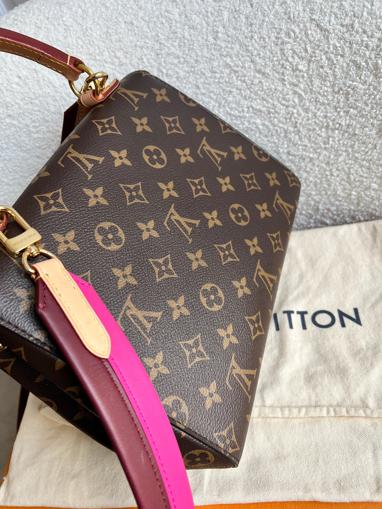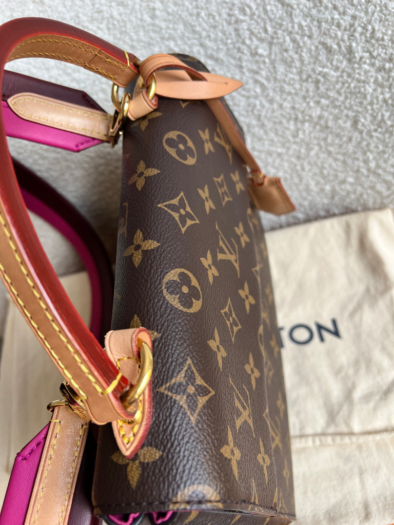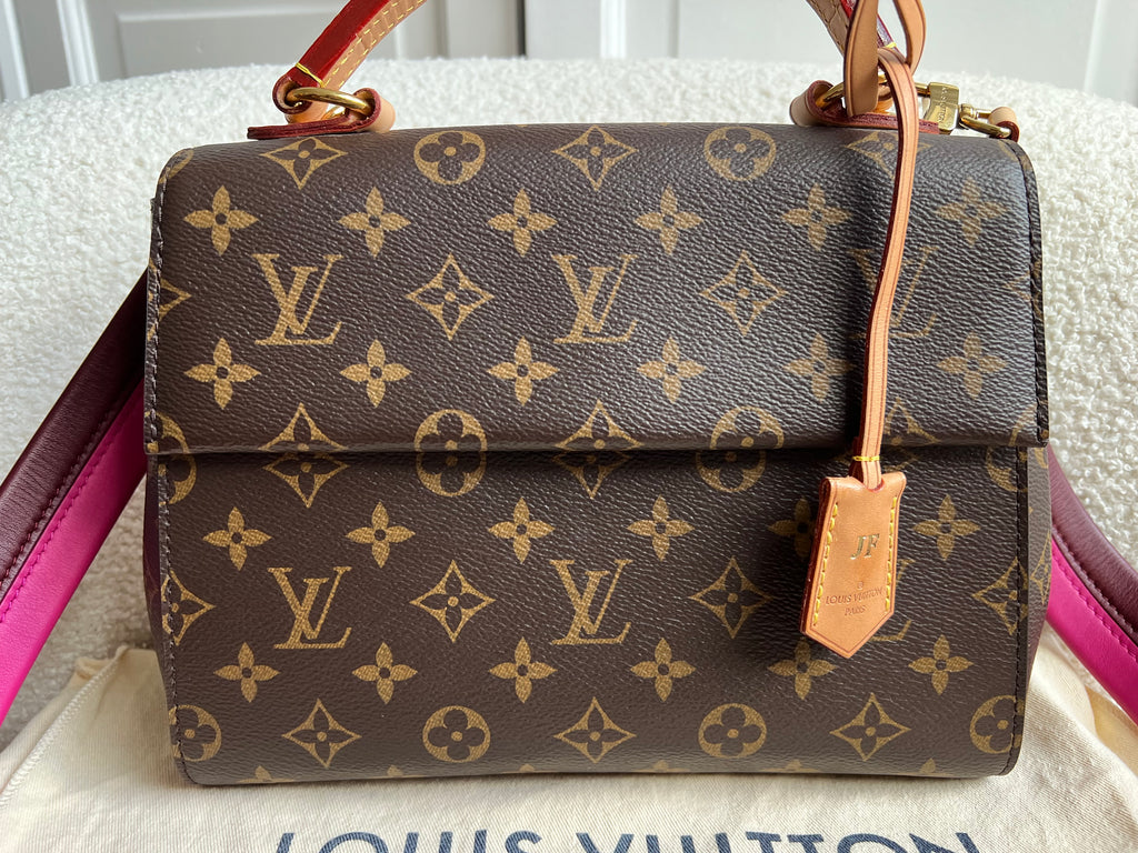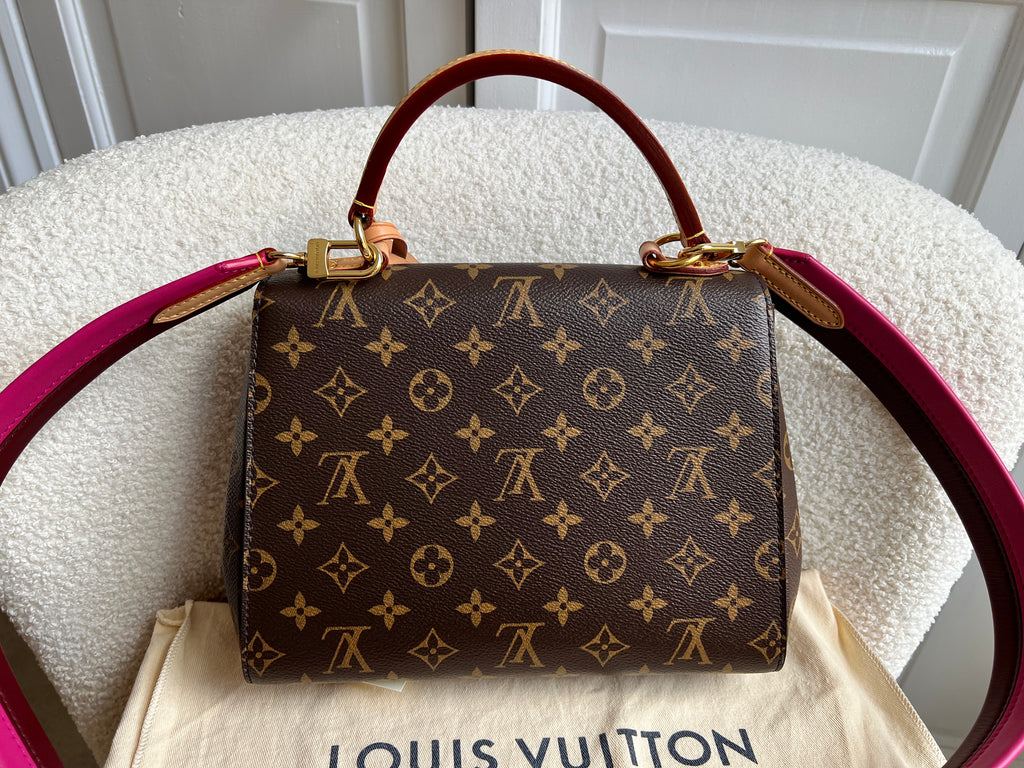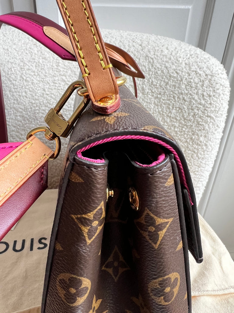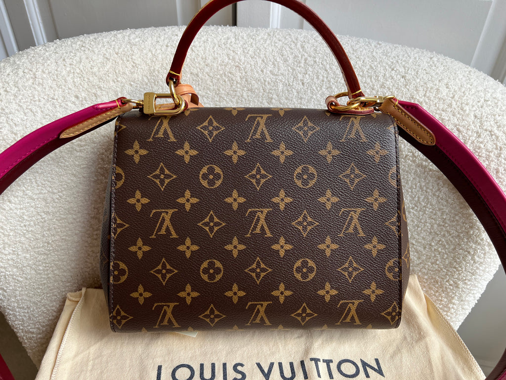 Louis Vuitton Cluny BB in Monogram Canvas with gold hardware. Worn cross-body or carried in ladylike fashion by its top handle, this timeless bag is designed for busy lifestyles. It opens wide for easy access to the smartly organised interior, while the magnetic flap and zipped inner pocket keep belongings secure. Can be worn cross body using the pink textile strap.