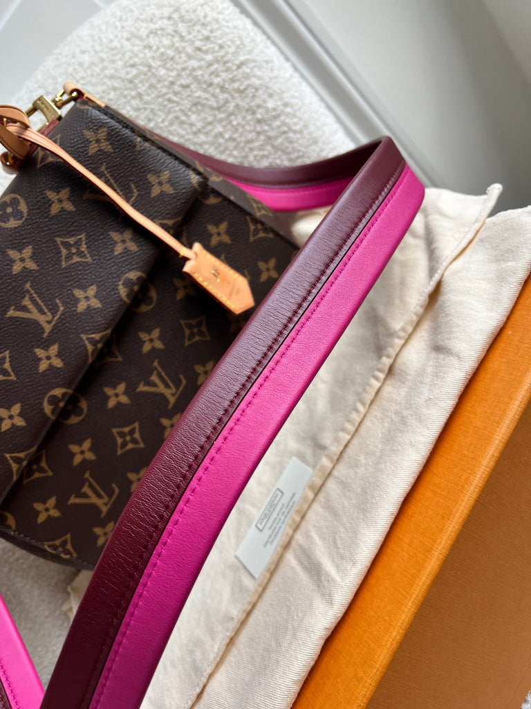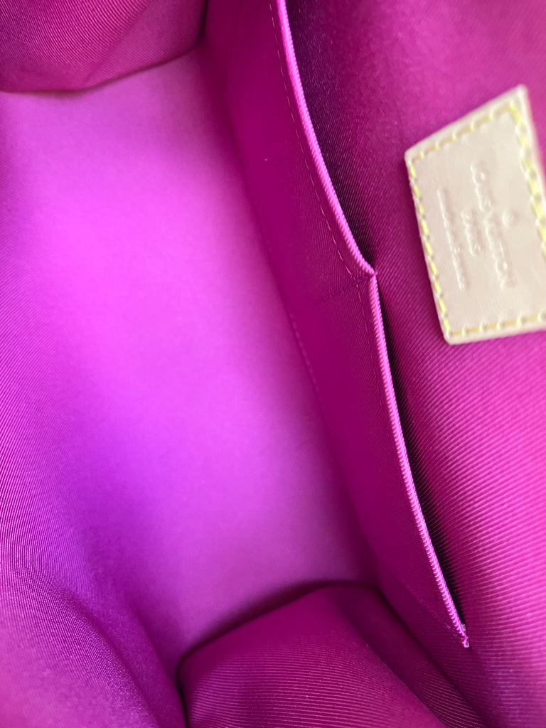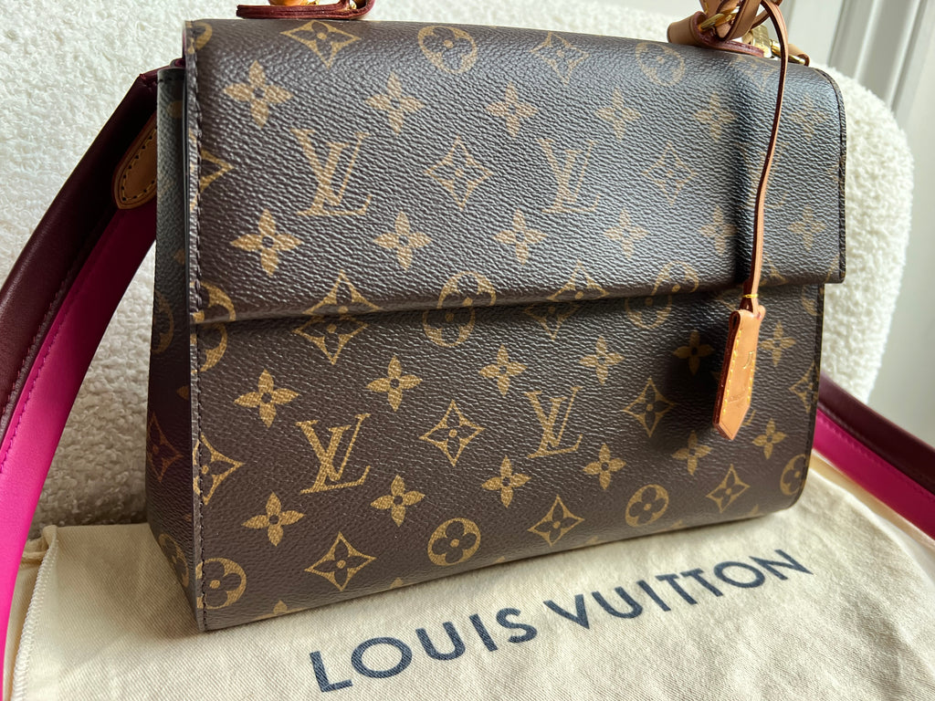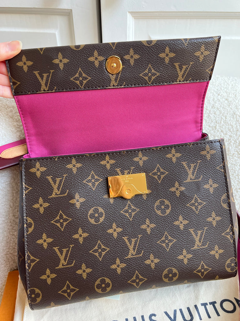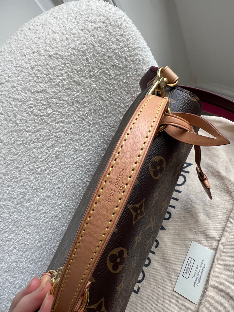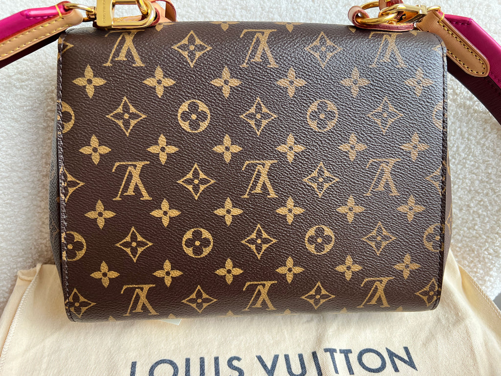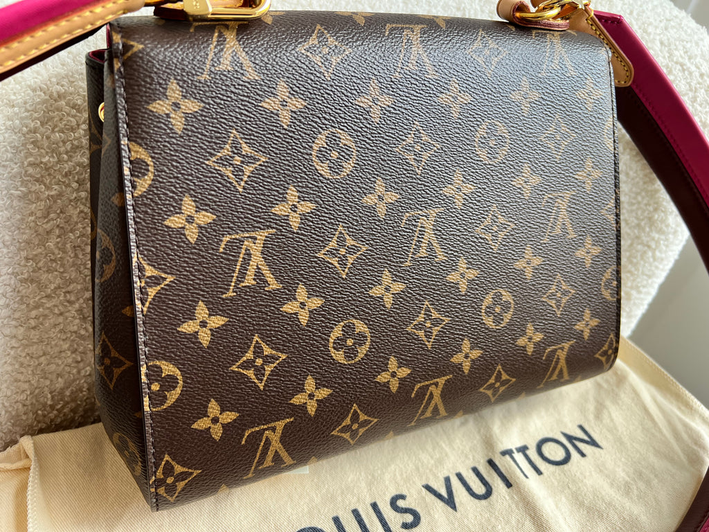 Louis Vuitton Cluny BB in Monogram Canvas with gold hardware. Worn cross-body or carried in ladylike fashion by its top handle, this timeless bag is designed for busy lifestyles. It opens wide for easy access to the smartly organised interior, while the magnetic flap and zipped inner pocket keep belongings secure. Can be worn cross body using the pink textile strap.