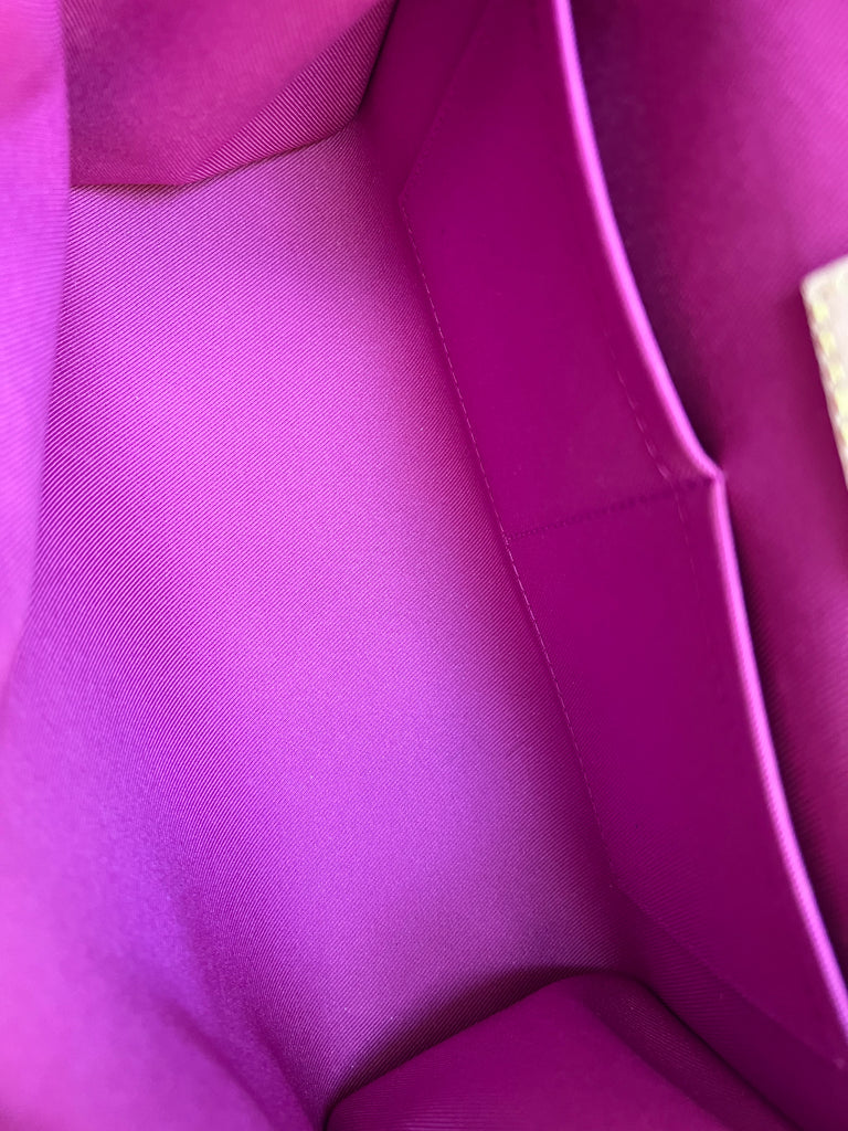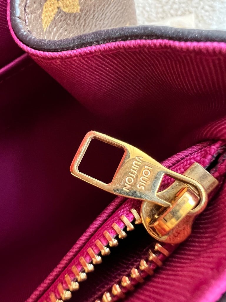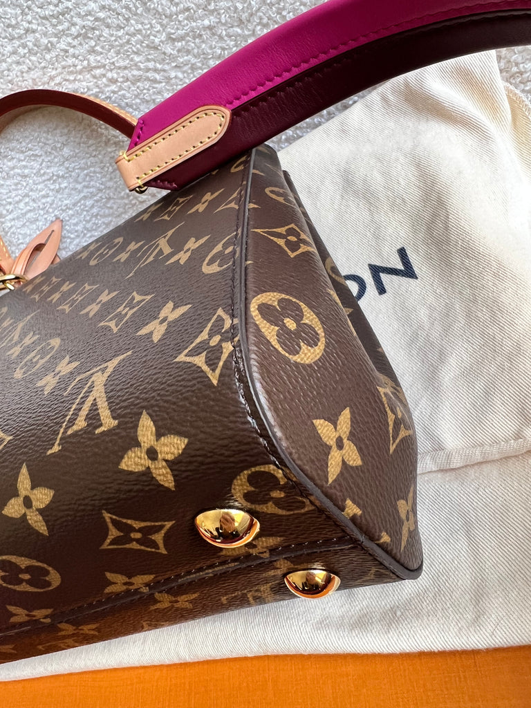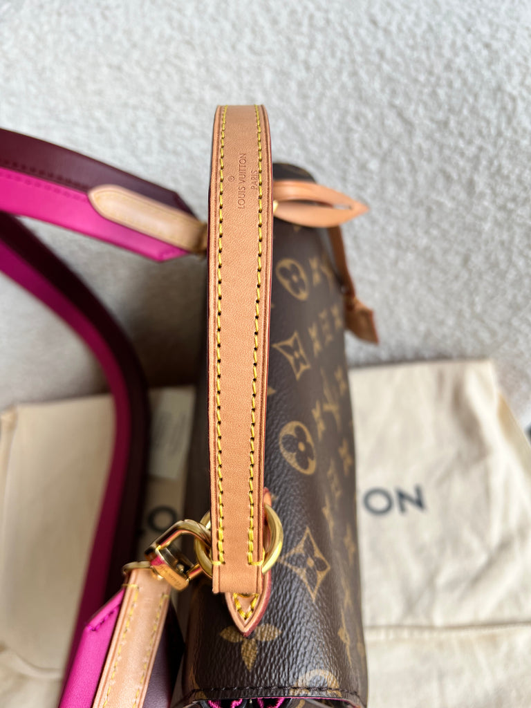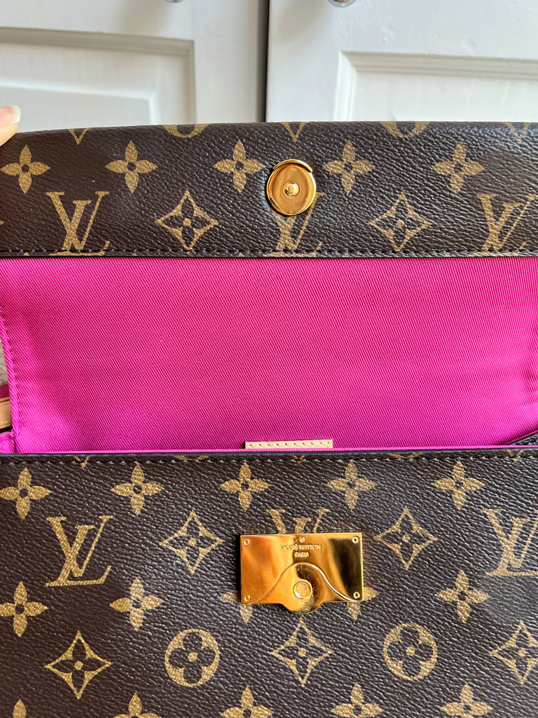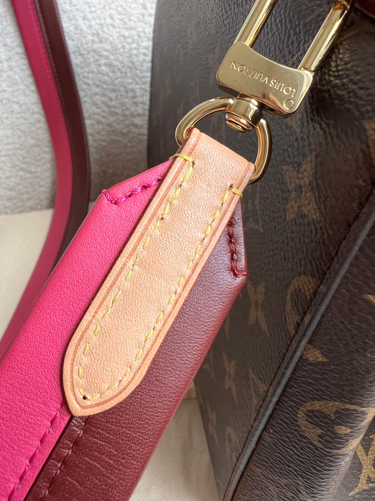 Louis Vuitton Cluny BB in Monogram Canvas with gold hardware. Worn cross-body or carried in ladylike fashion by its top handle, this timeless bag is designed for busy lifestyles. It opens wide for easy access to the smartly organised interior, while the magnetic flap and zipped inner pocket keep belongings secure. Can be worn cross body using the pink textile strap.