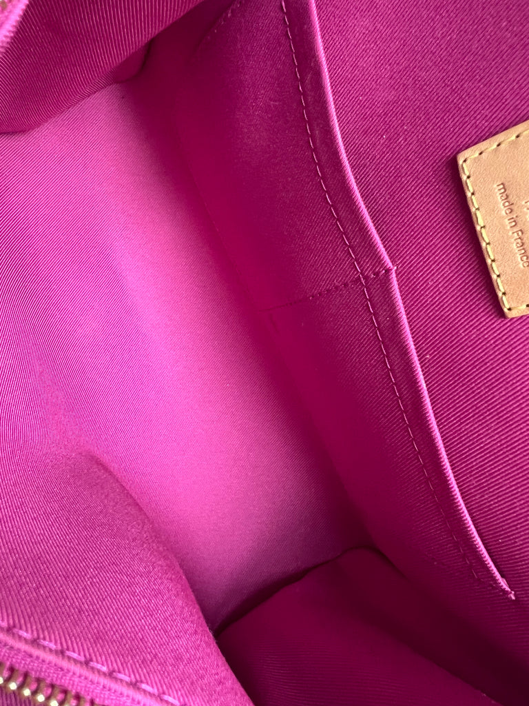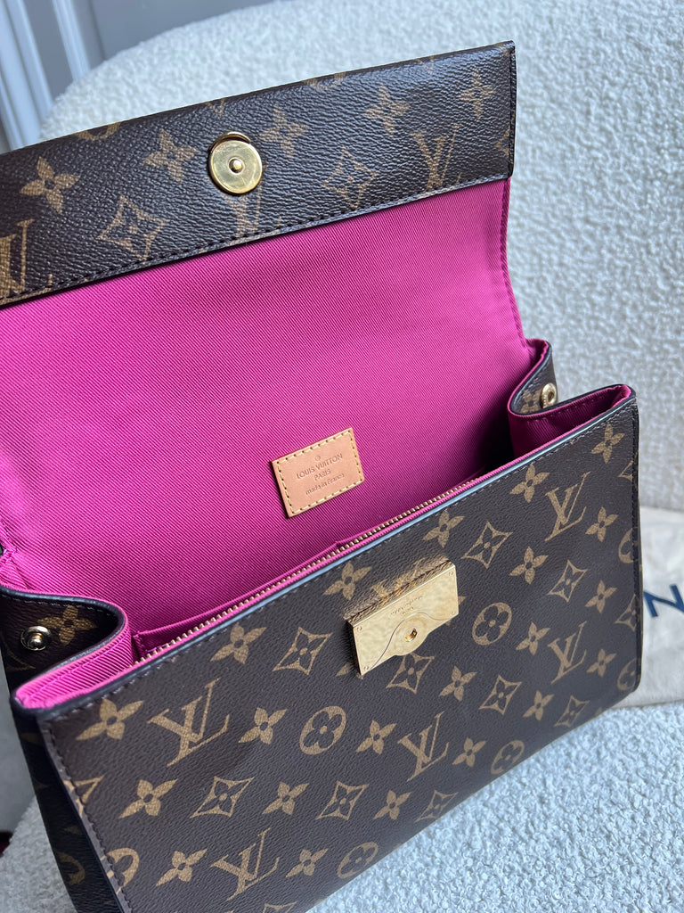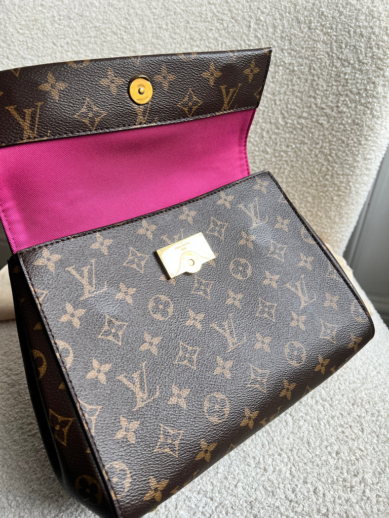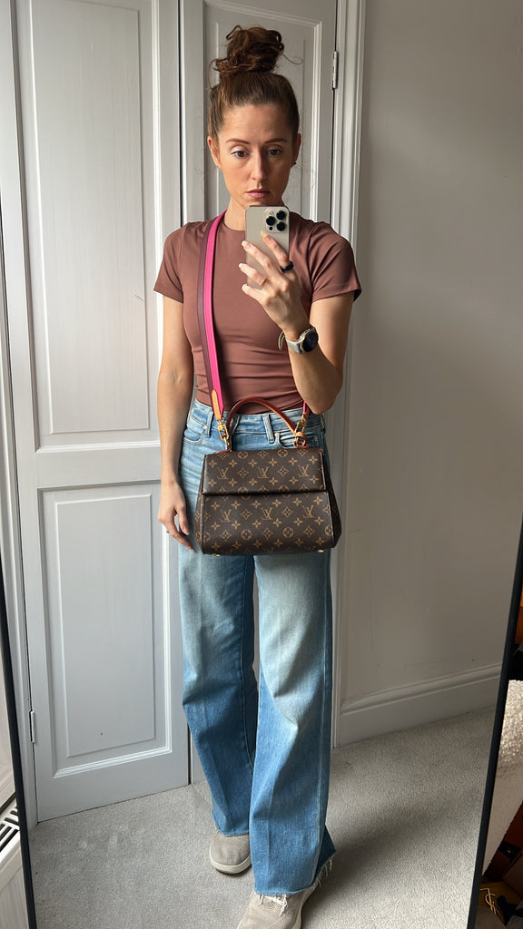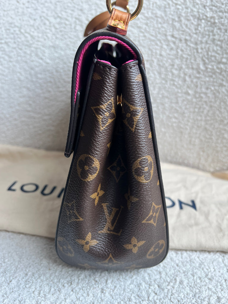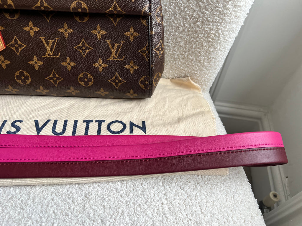 Louis Vuitton Cluny BB in Monogram Canvas with gold hardware. Worn cross-body or carried in ladylike fashion by its top handle, this timeless bag is designed for busy lifestyles. It opens wide for easy access to the smartly organised interior, while the magnetic flap and zipped inner pocket keep belongings secure. Can be worn cross body using the pink textile strap.