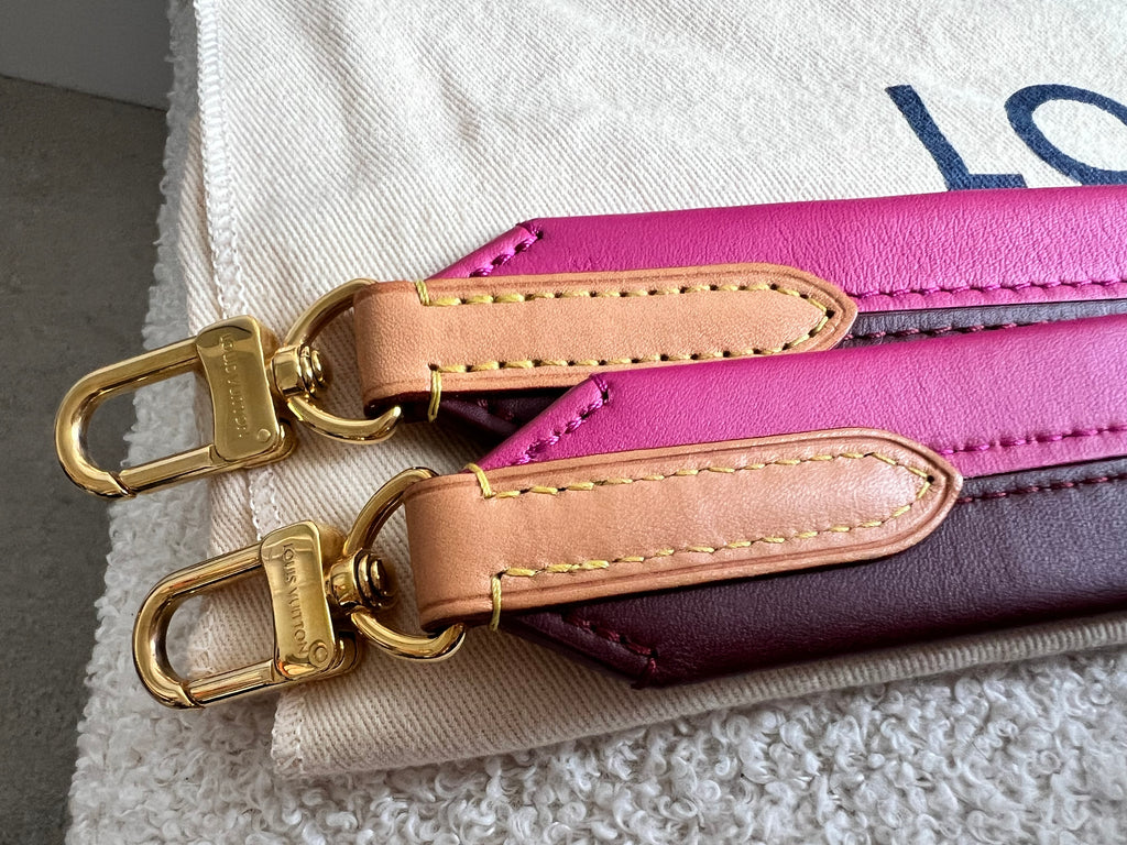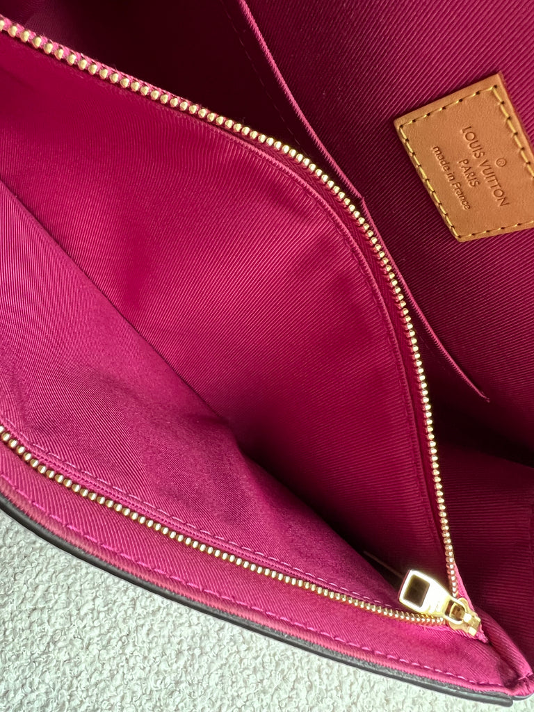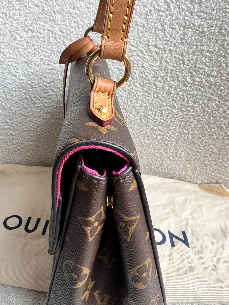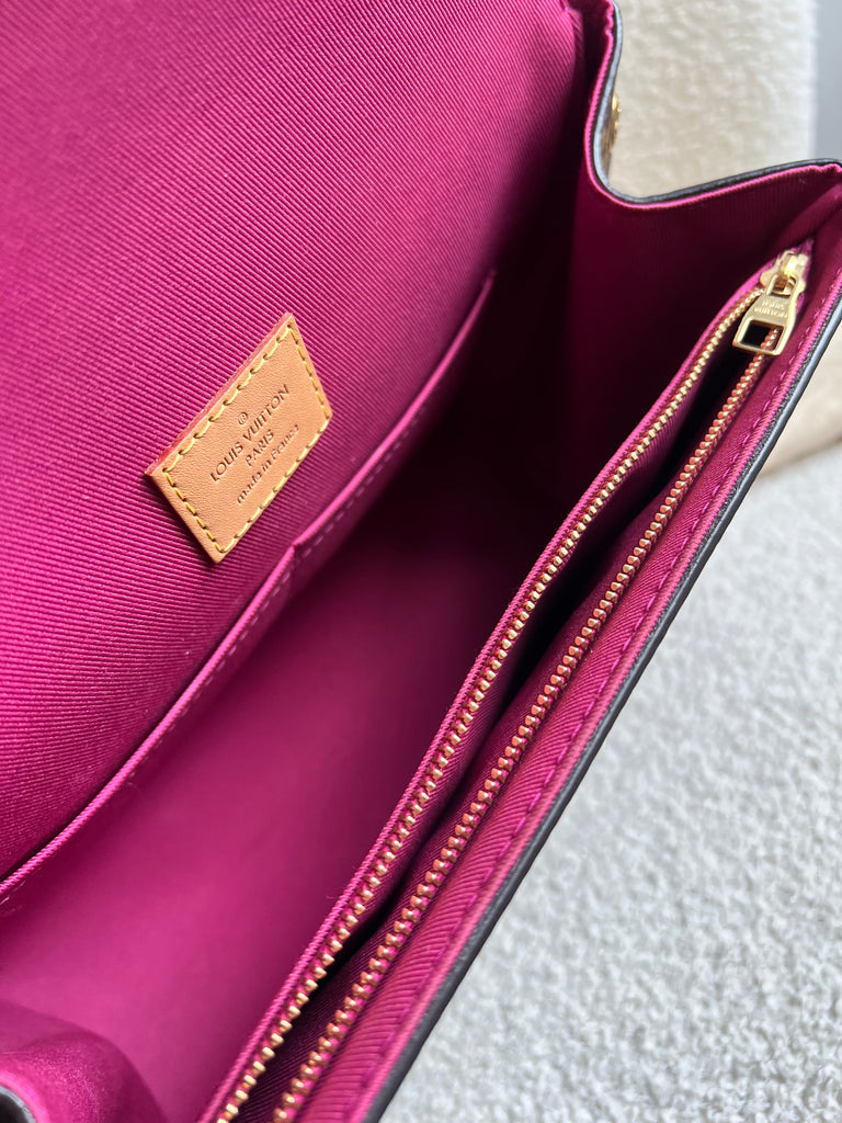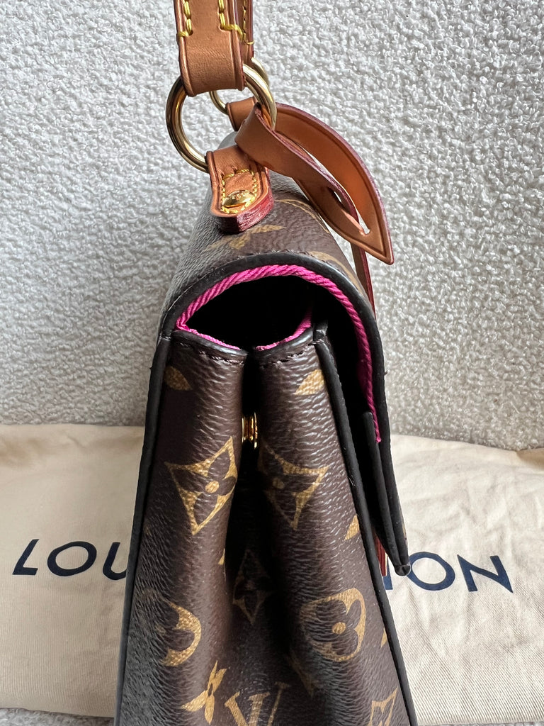 Louis Vuitton Cluny BB in Monogram Canvas with gold hardware. Worn cross-body or carried in ladylike fashion by its top handle, this timeless bag is designed for busy lifestyles. It opens wide for easy access to the smartly organised interior, while the magnetic flap and zipped inner pocket keep belongings secure. Can be worn cross body using the pink textile strap.