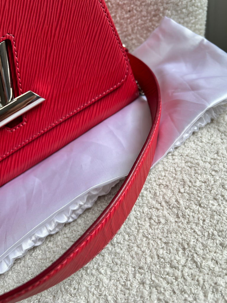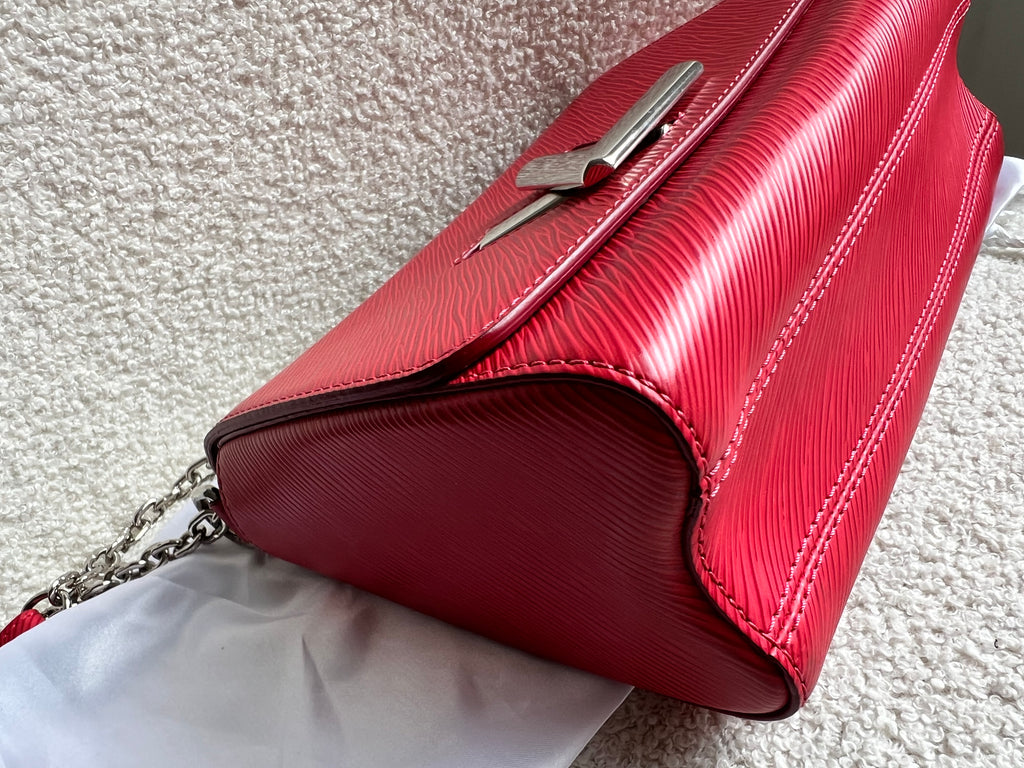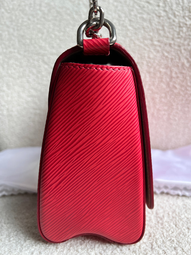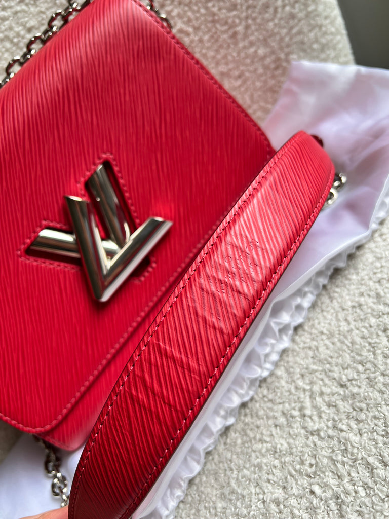Louis Vuitton Twist MM in Coquelicot (Red) Epi Leather with silver hardware. The Twist MM chain bag features the iconic LV twist lock and is a fashionable day to evening style. Reasonably roomy inside, the sliding chain strap can be doubled for shoulder carry or lengthened for cross body wear.
