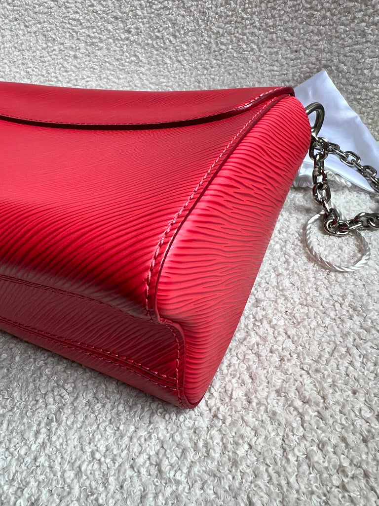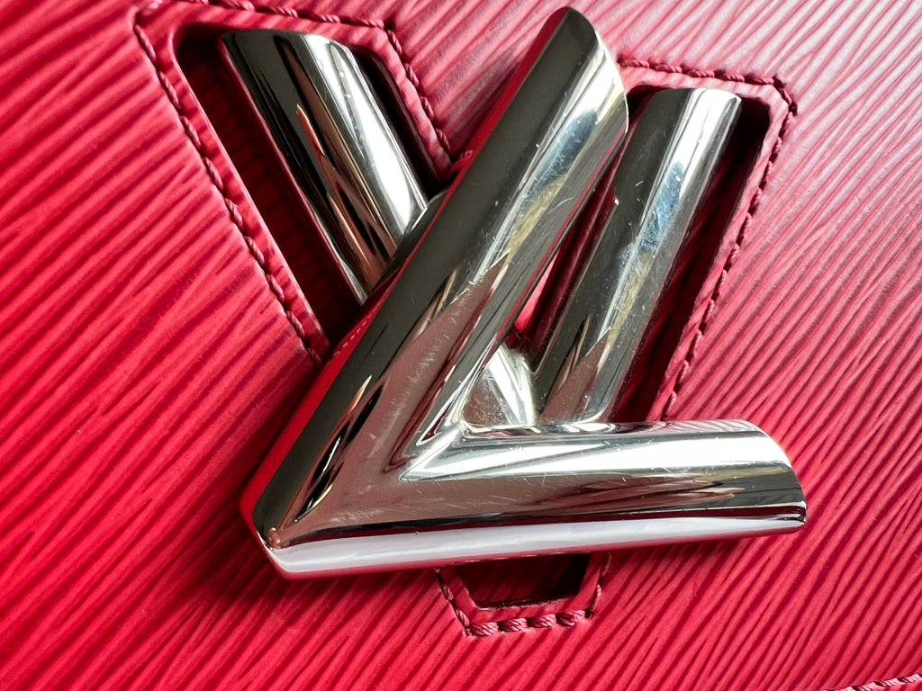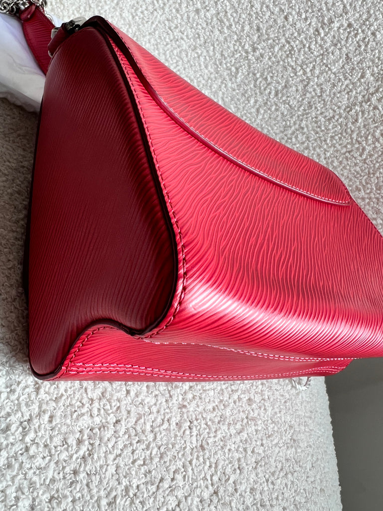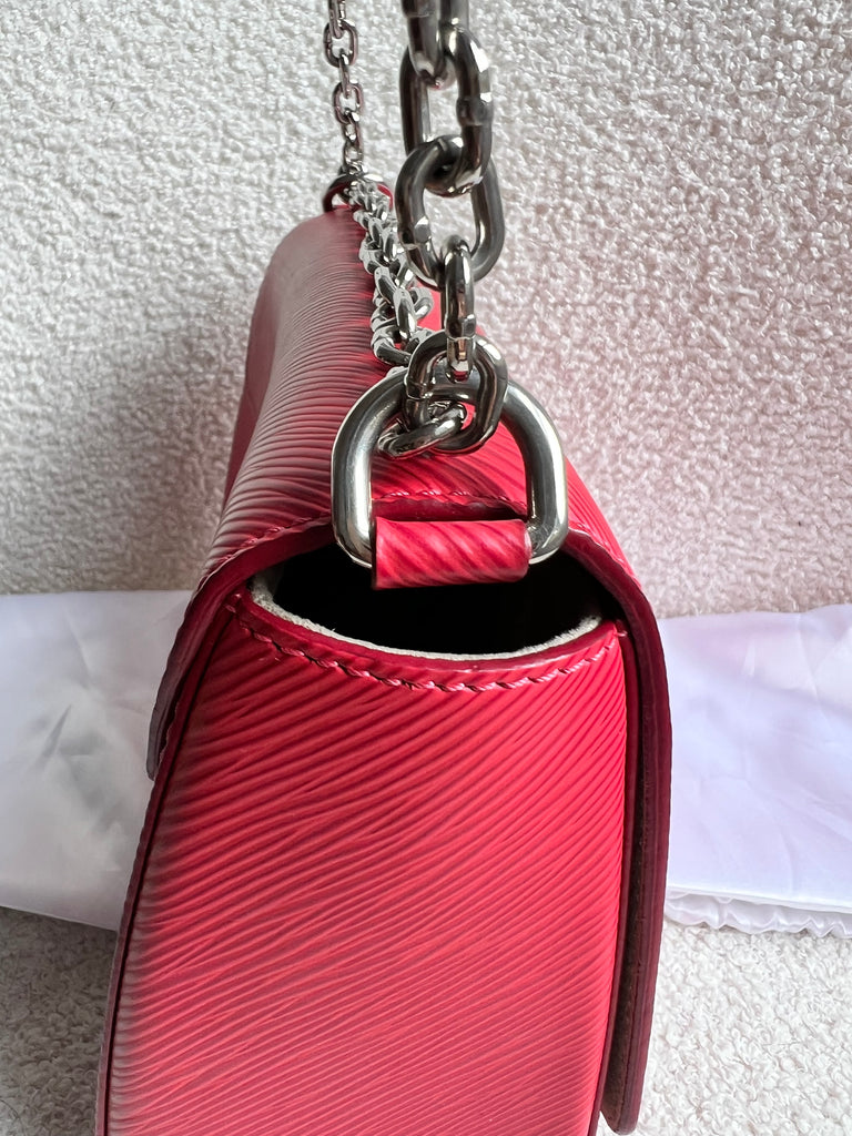 Louis Vuitton Twist MM in Coquelicot (Red) Epi Leather with silver hardware. The Twist MM chain bag features the iconic LV twist lock and is a fashionable day to evening style. Reasonably roomy inside, the sliding chain strap can be doubled for shoulder carry or lengthened for cross body wear.