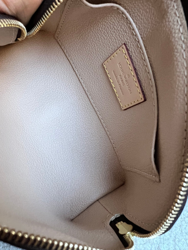 Louis Vuitton Cosmetic Pouch PM in Monogram with gold hardware. This compact cosmetic pouch slips easily into a handbag or suitcase. Its round shape and flat base facilitates access to small products. Highly sought after.
