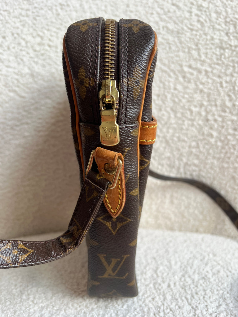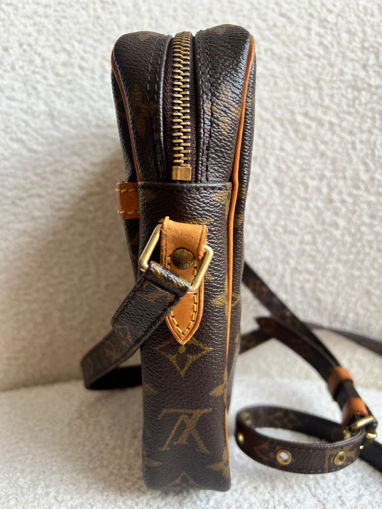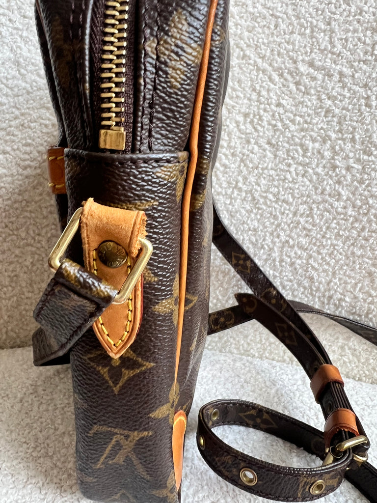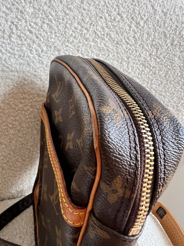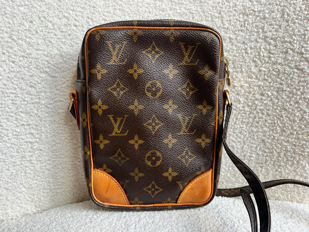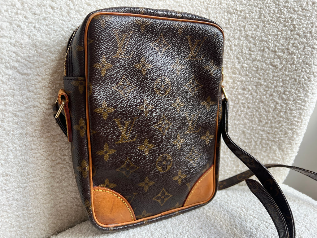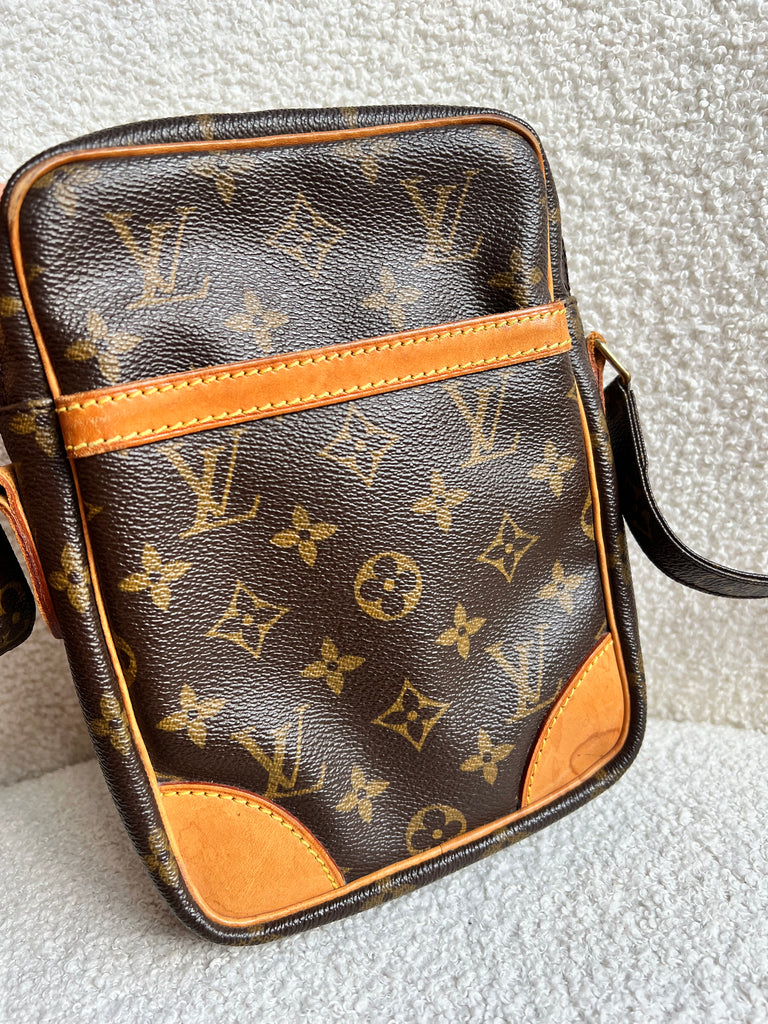 Louis Vuitton Danube in monogram canvas. In the iconic monogram canvas, this messenger style crossbody bag is ideal for those who prefer small/mini hands free bags. Now discontinued, a great example of vintage quality LV. Zipper closure. Perfect "starter" designer bag with a lower price tag than some of Louis Vuitton's other models.