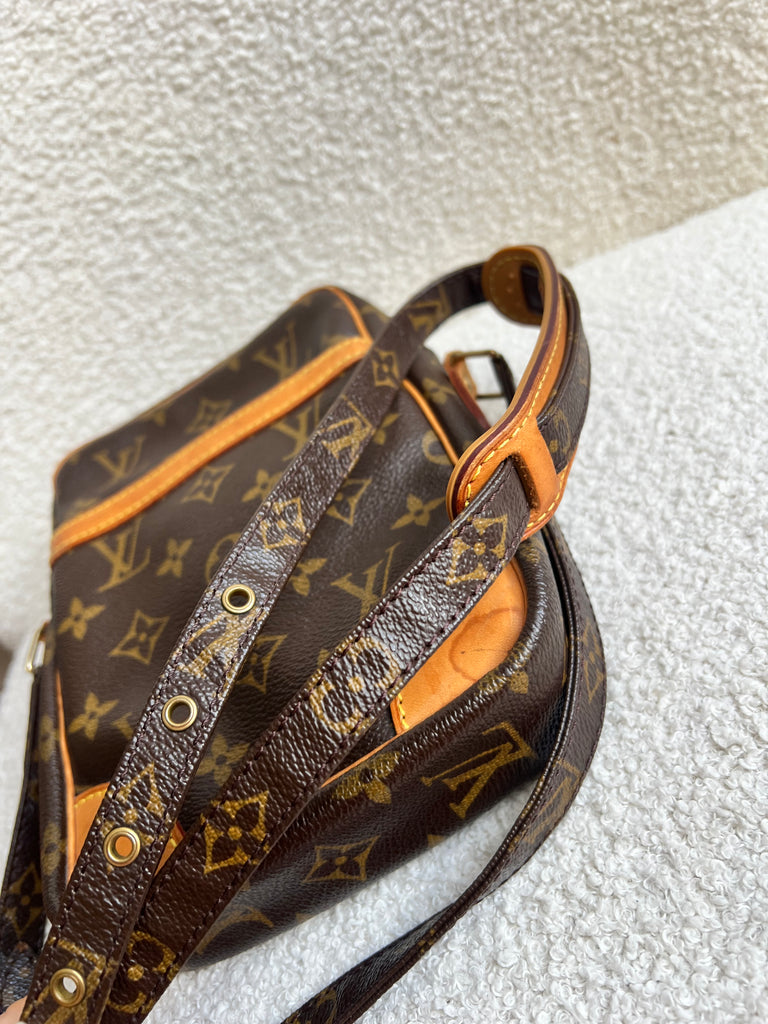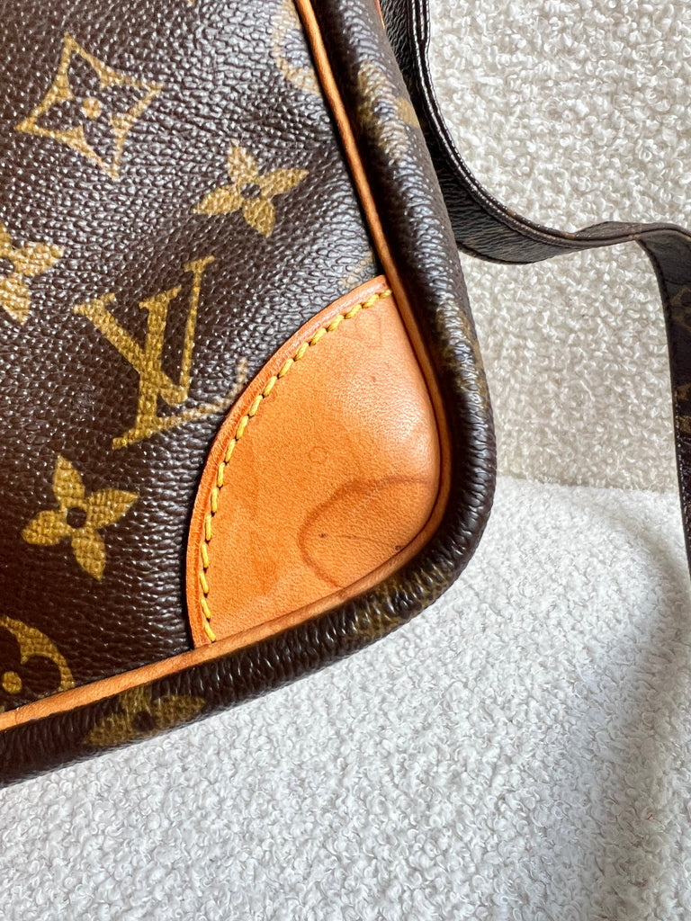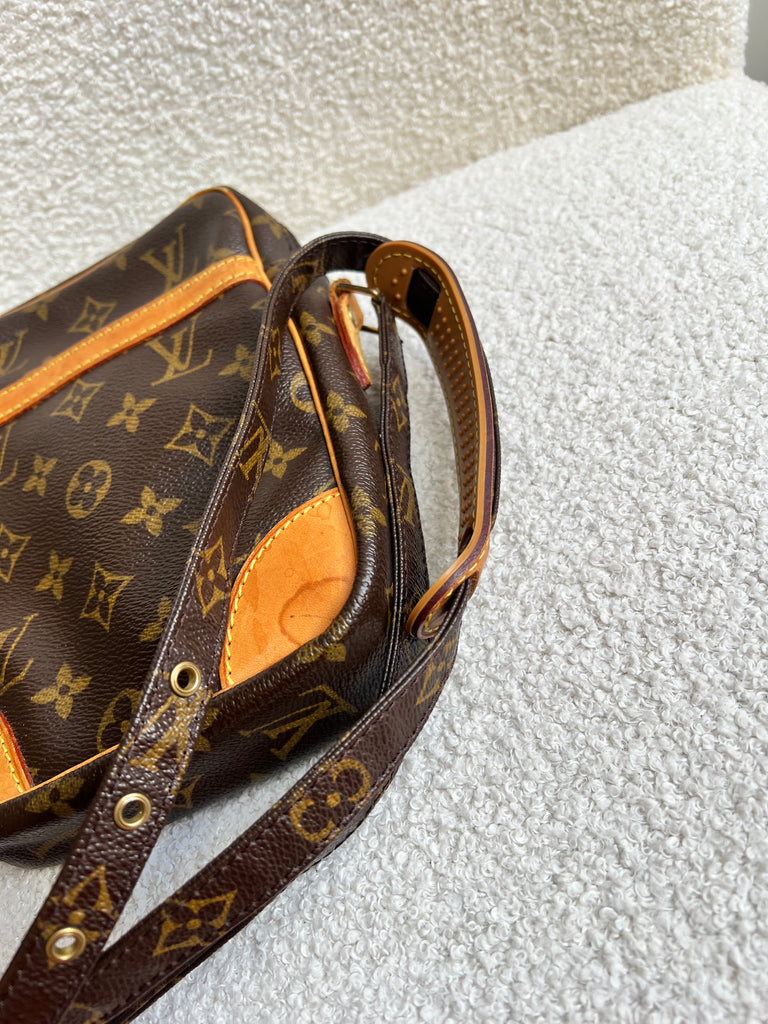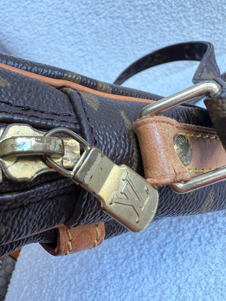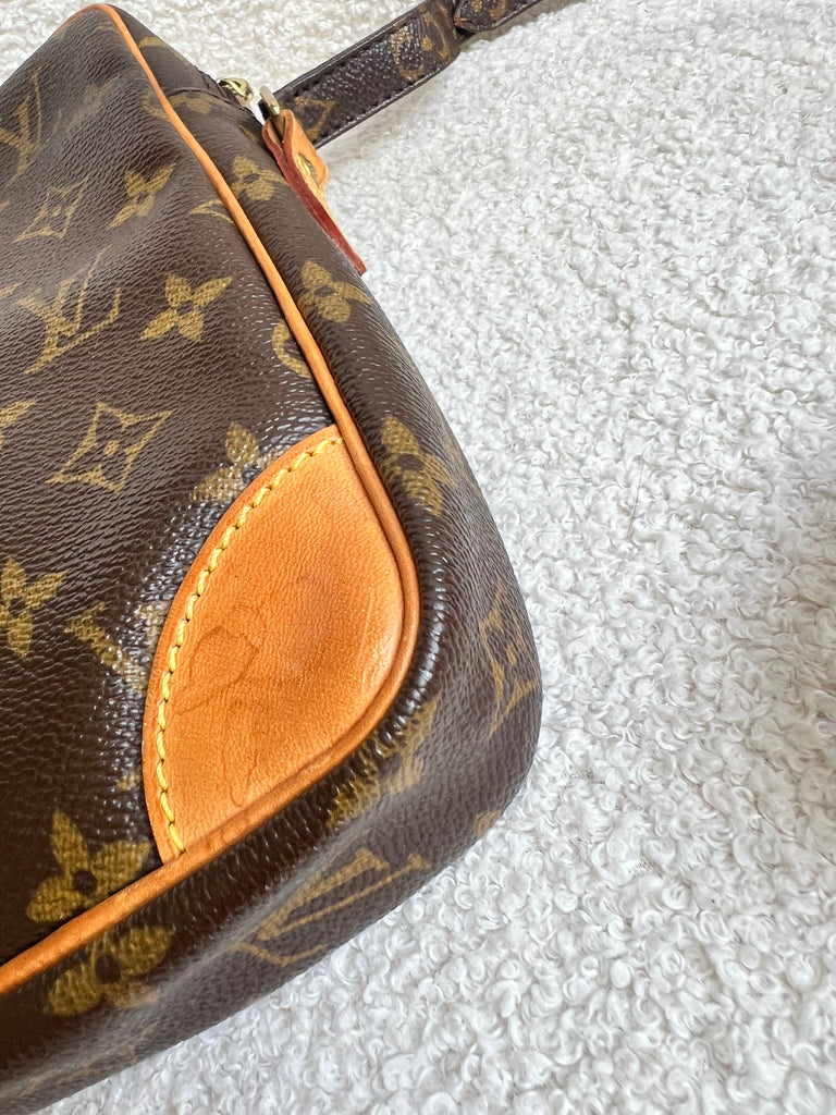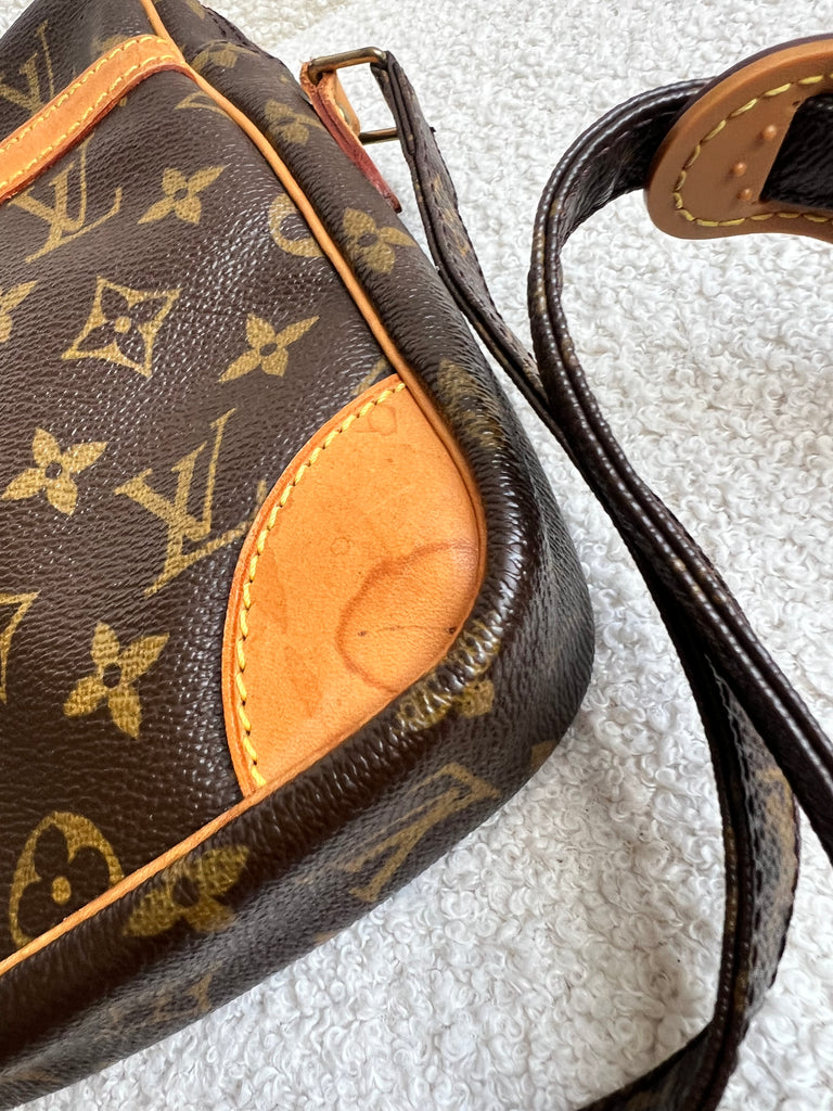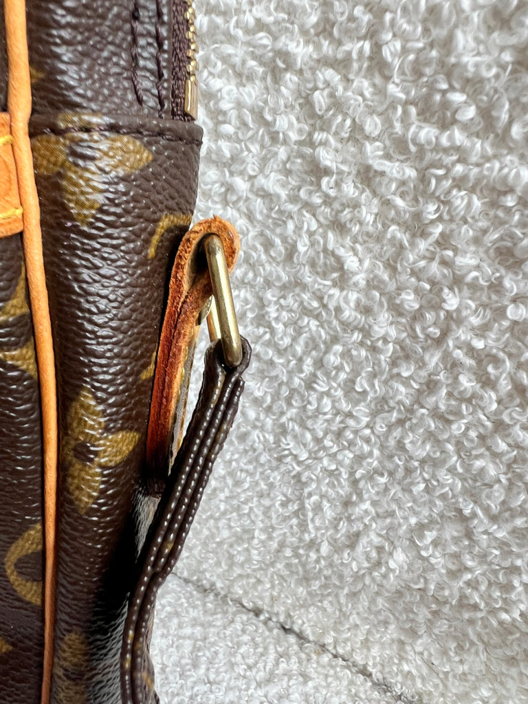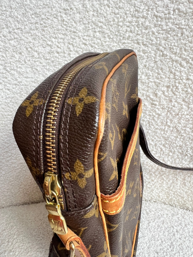 Louis Vuitton Danube in monogram canvas. In the iconic monogram canvas, this messenger style crossbody bag is ideal for those who prefer small/mini hands free bags. Now discontinued, a great example of vintage quality LV. Zipper closure. Perfect "starter" designer bag with a lower price tag than some of Louis Vuitton's other models.