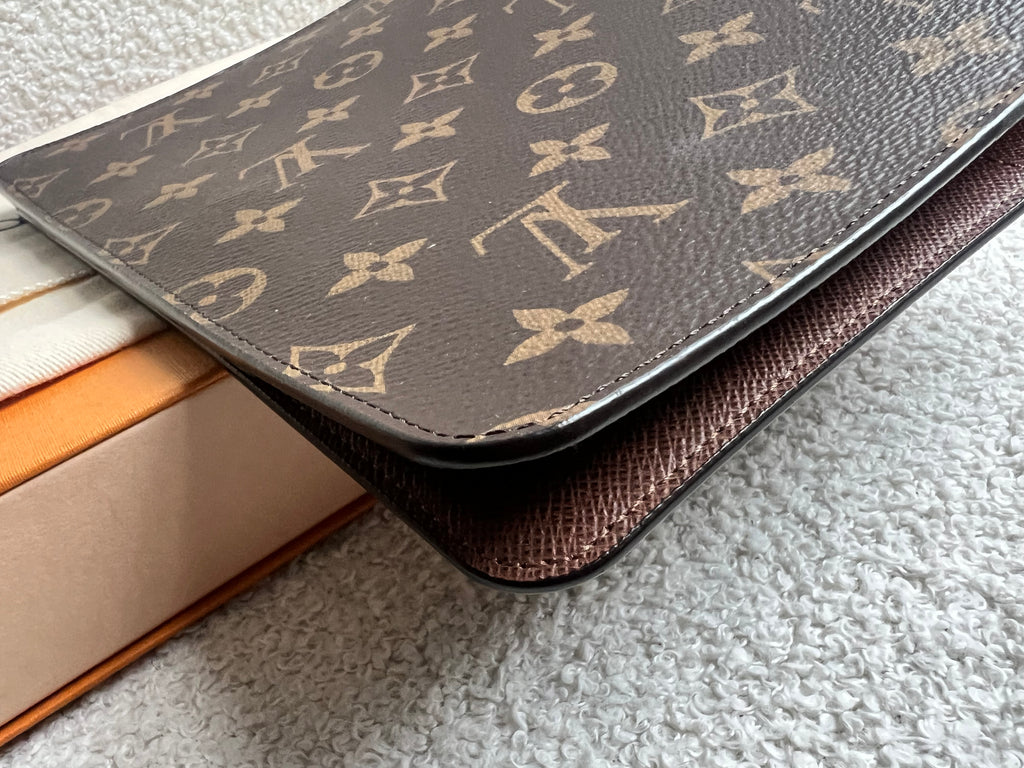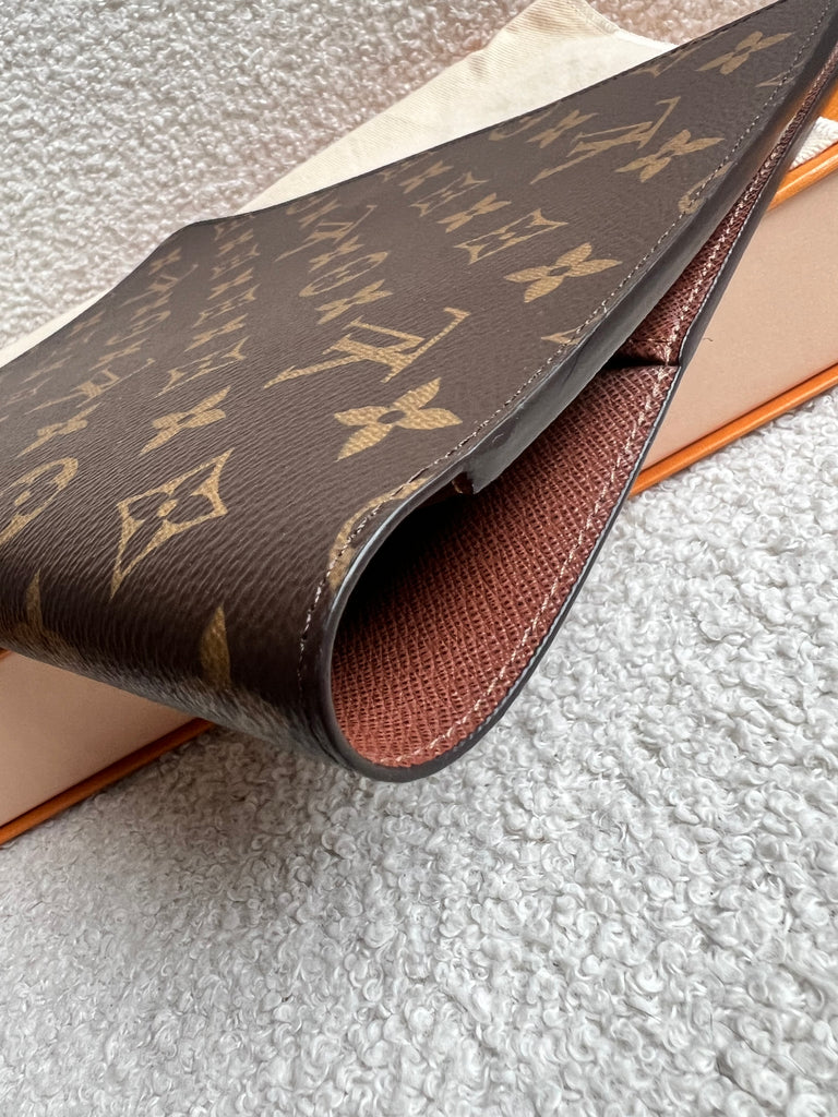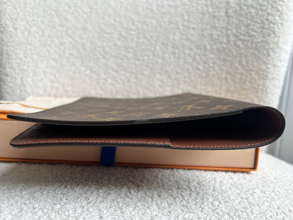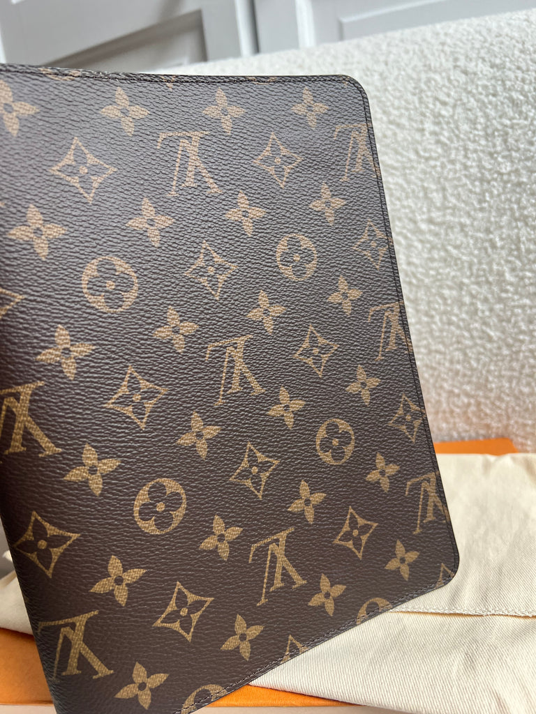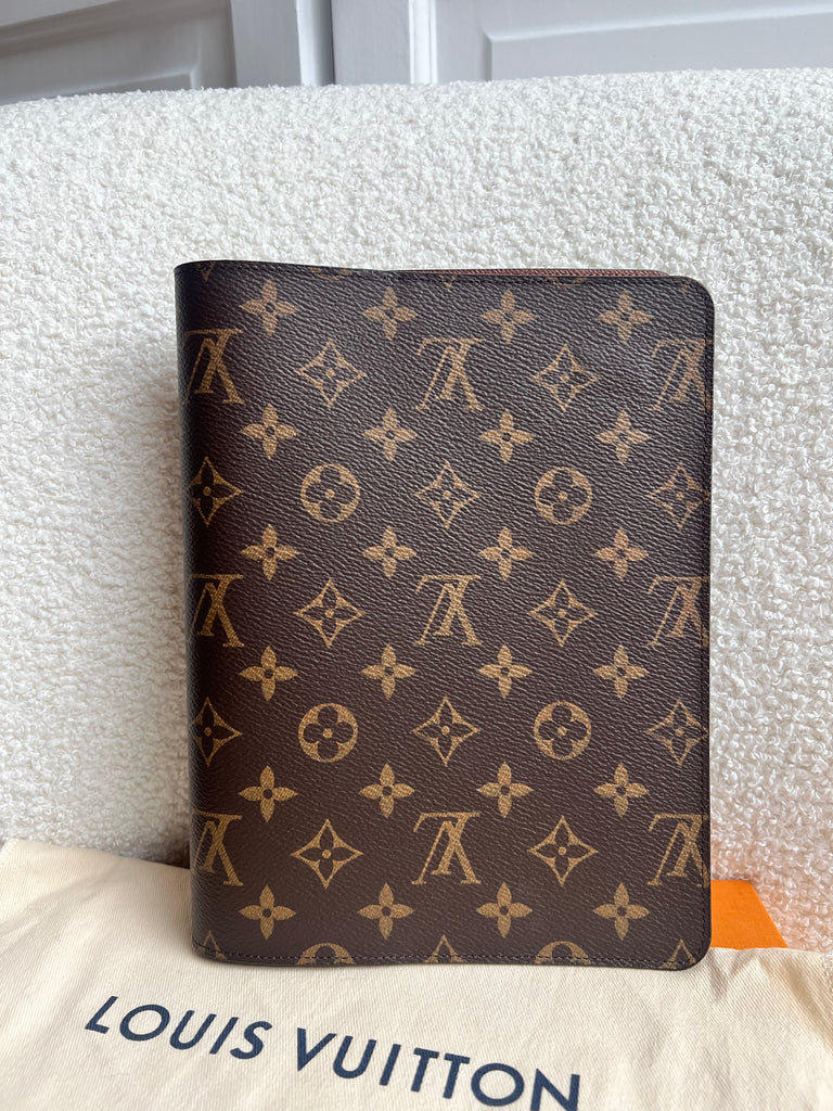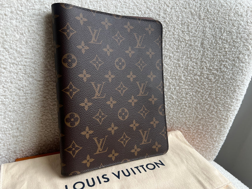 Louis Vuitton Desk Agenda Cover in Monogram Canvas. Designed to stay on the desk, this spacious leather-lined agenda cover in Monogram canvas provides an elegant holder for notes and small papers. Can be paired with a LV agenda refill (not included) or would fit a standard A5 notebook inside. There are also compartments for cards or papers.