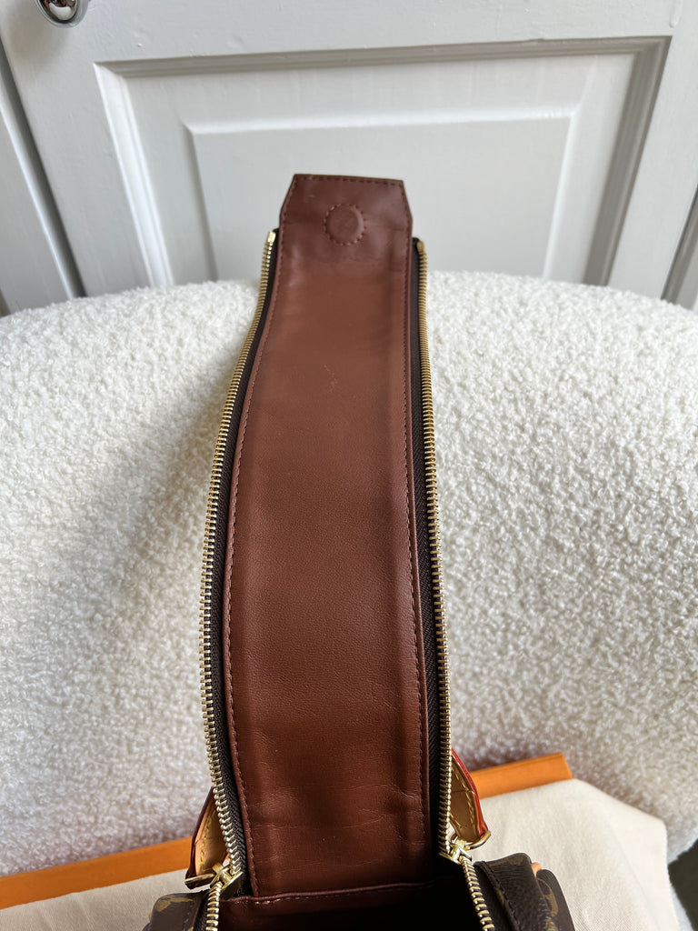 Louis Vuitton Toilet Dopp Kit Pouch in Monogram canvas and natural leather with gold hardware. The spacious Toilet Dopp Kit Pouch is a great travel companion. It is crafted from iconic Monogram canvas and trimmed with natural cowhide. A wide leather handle offers easy carry and enables the bag to be hung from a bathroom hook, while a zipped interior pocket provides convenient storage for smaller items.